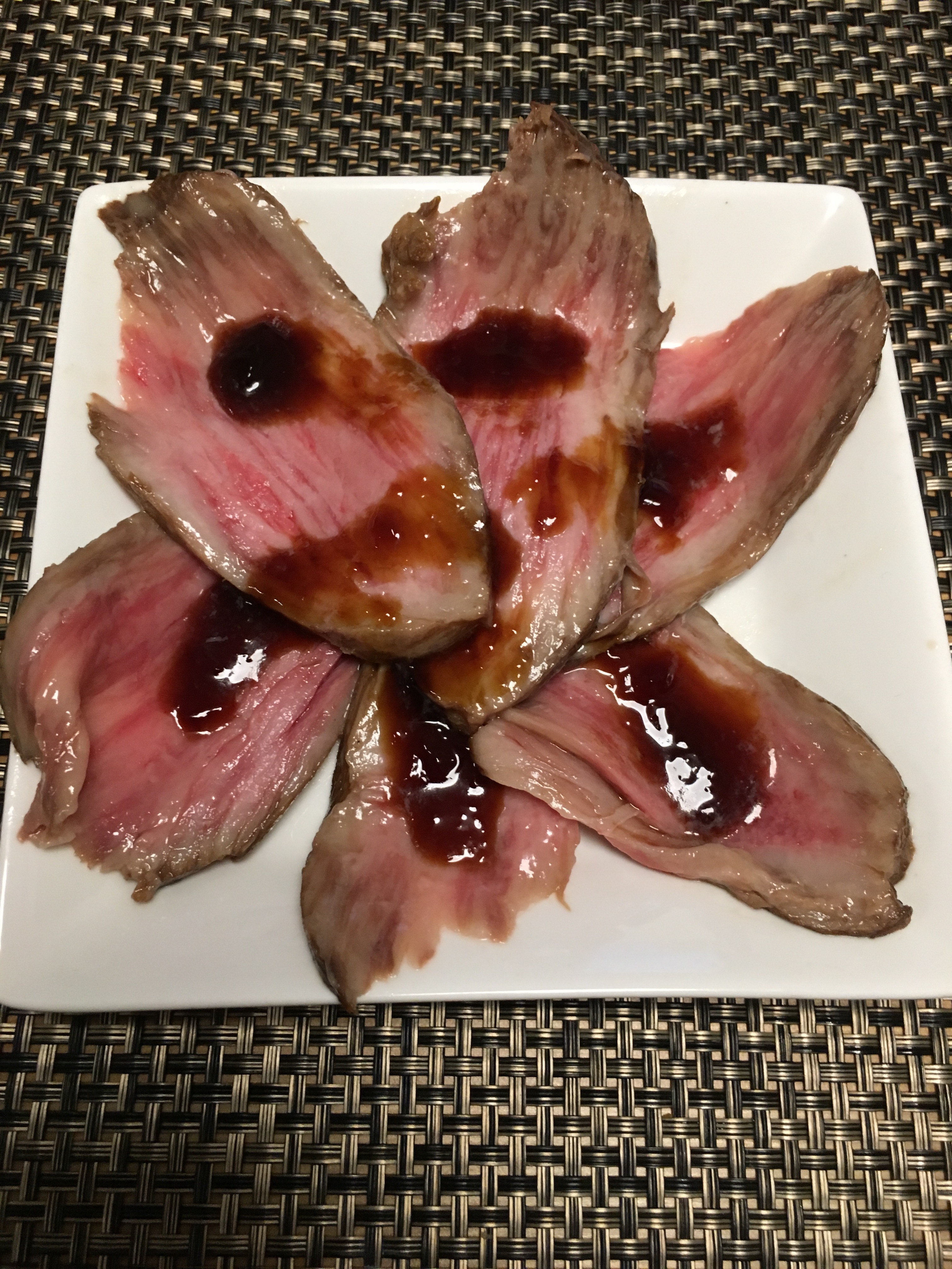お肉にしっかりお味が(塩味)有るので、一緒に入っていたソース(甘味)を少し付けるか、ラディッシュ、粗びきのわさび(塩分の無いものか、おろし立ての生わさび)のみで頂くとお肉のジューシーな脂との相性が良いと思います。煎酒(梅酢の入っただし醤油)が私は好みでした。