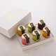 箱は、持ち上げるタイプの蓋で、開くと、6つのカラフルなフルーツ水ようかんがかわいい瓶に入って並んでいて、中央にはスプーンも添えられていました。
