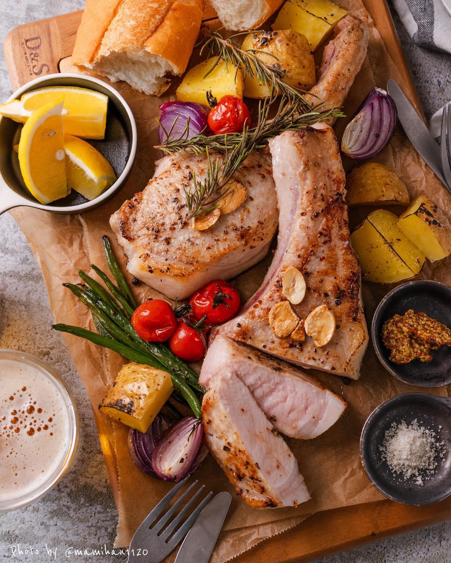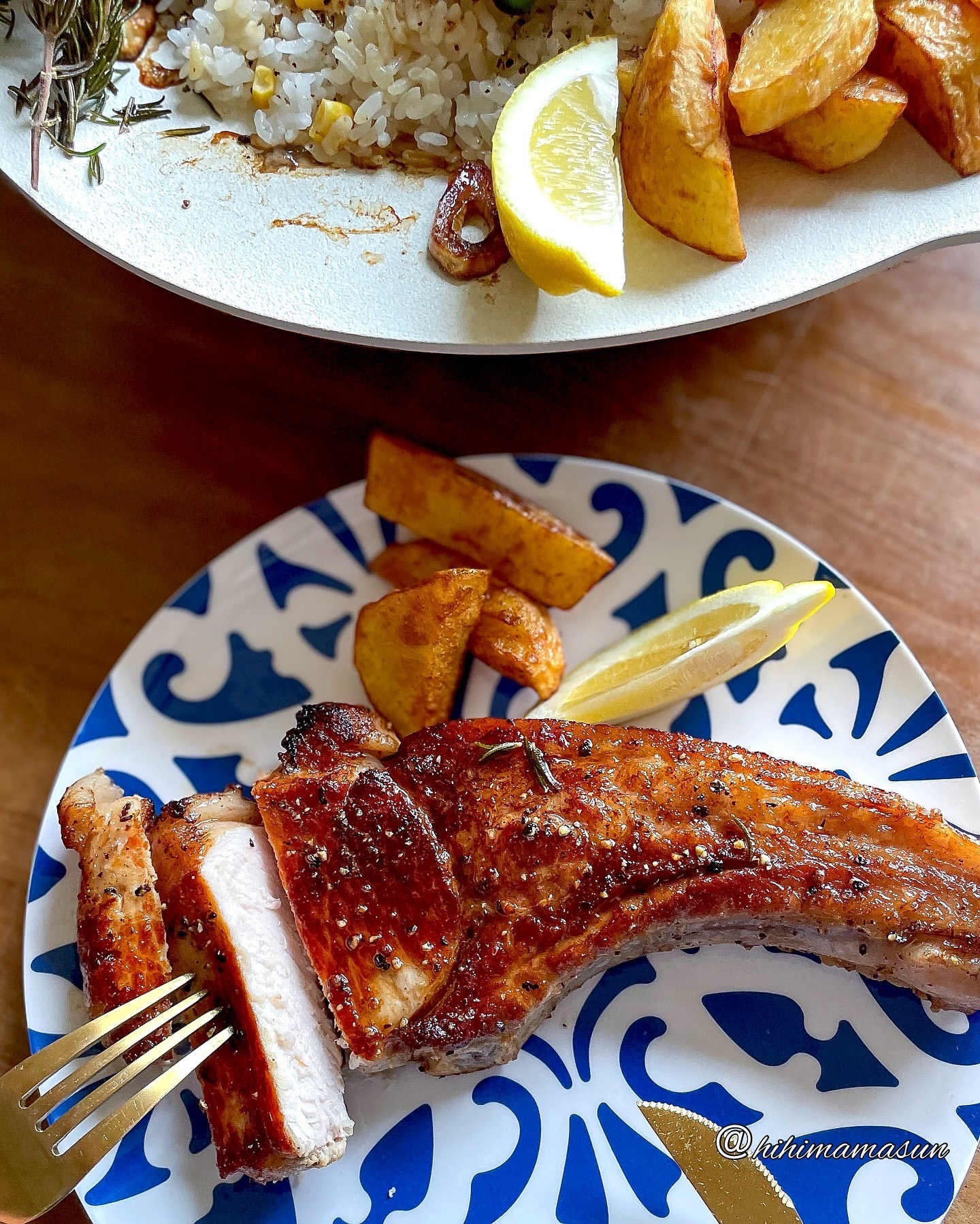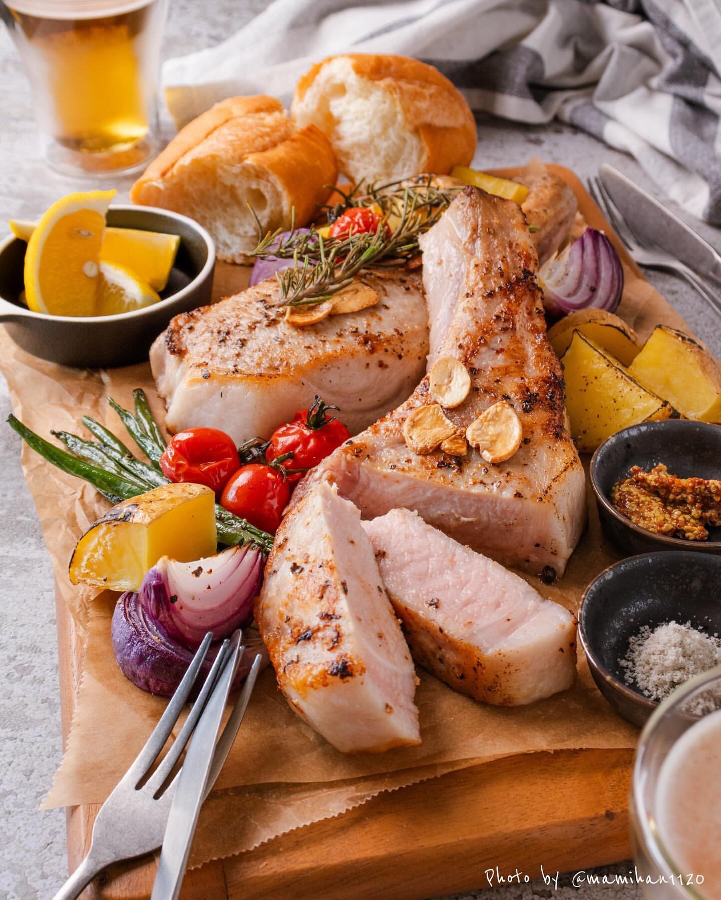 銘柄豚 館ヶ森高原豚の一番旨みのある骨の近くの希少なロース肉を贅沢に厚切り。ほんのりピンク色で十分火が通ってるから焼き過ぎないのがポイント。おいしい焼き方のレシピ付き。