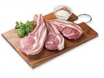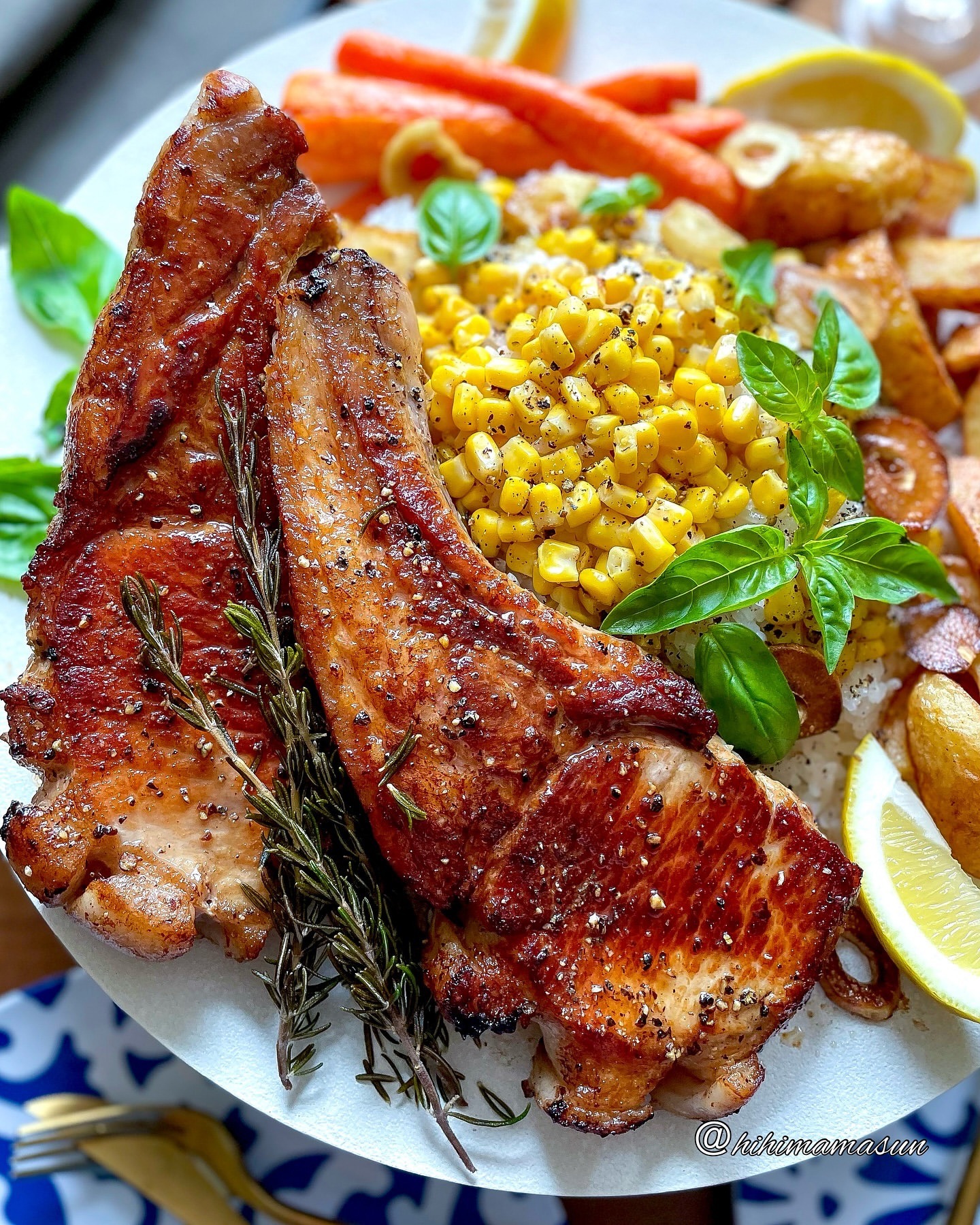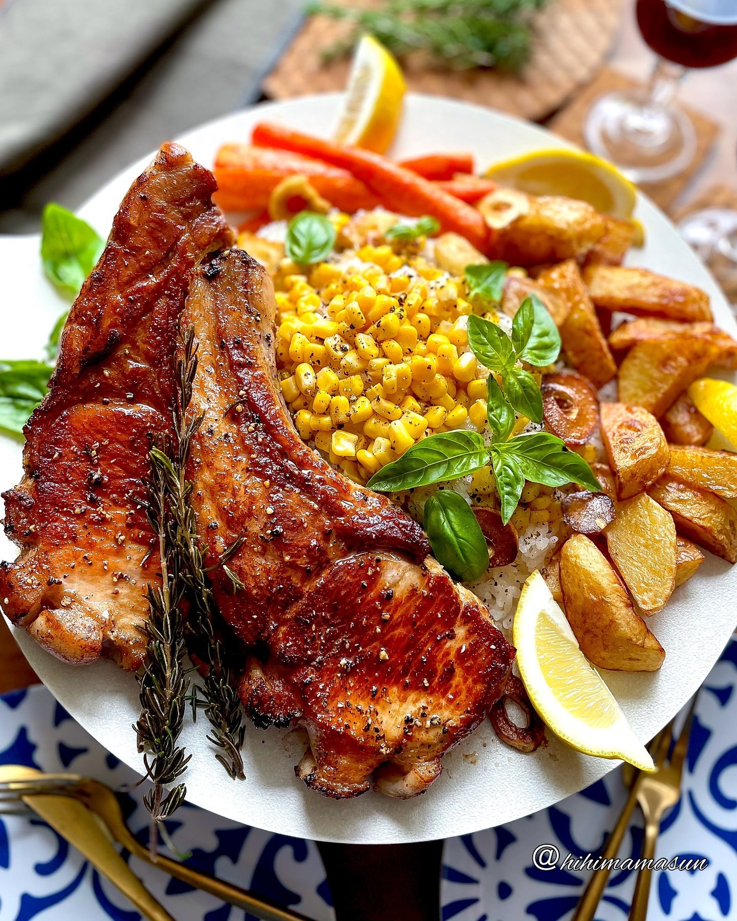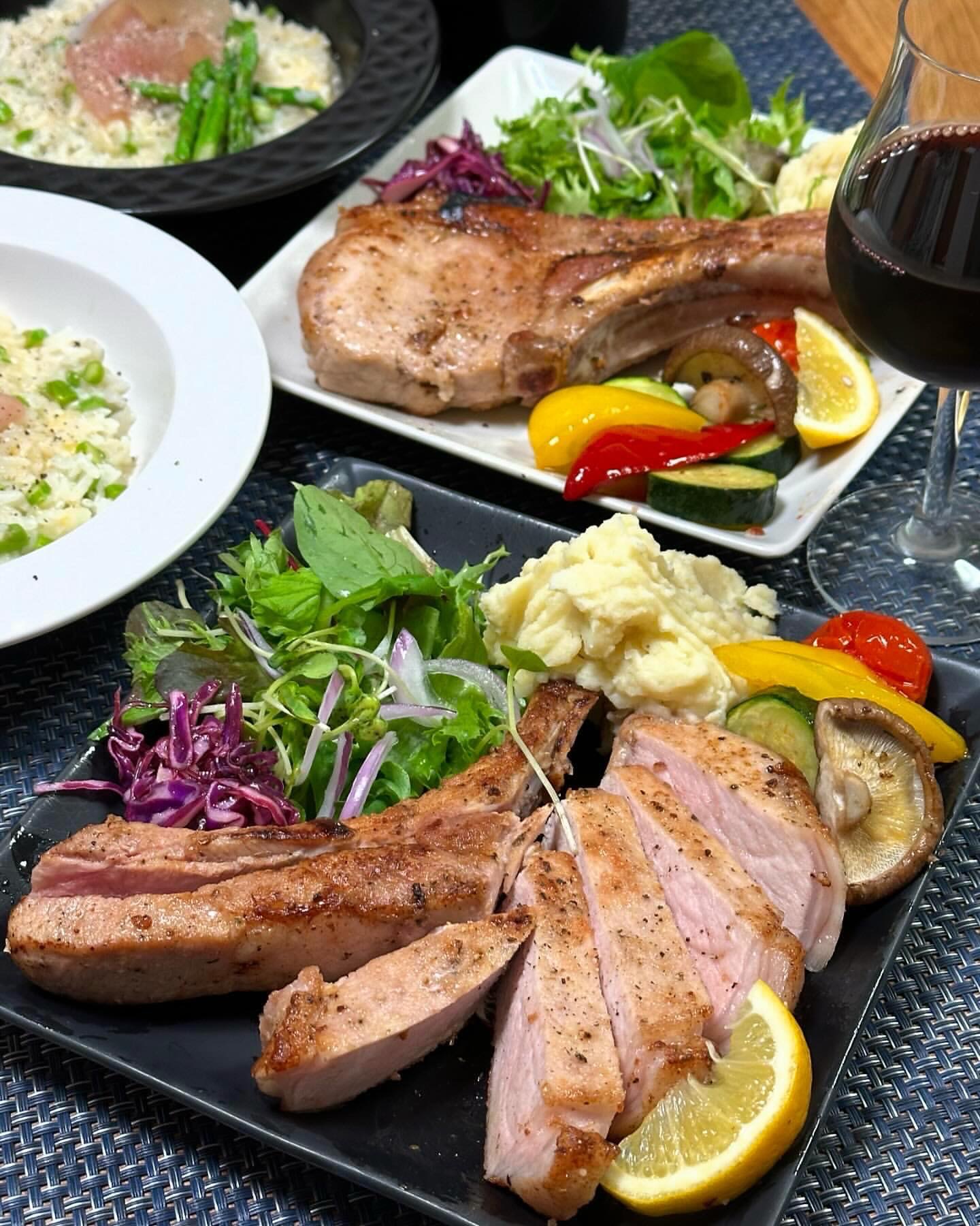 銘柄豚 館ヶ森高原豚の一番旨みのある骨の近くの希少なロース肉を贅沢に厚切り。ほんのりピンク色で十分火が通ってるから焼き過ぎないのがポイント。おいしい焼き方のレシピ付き。