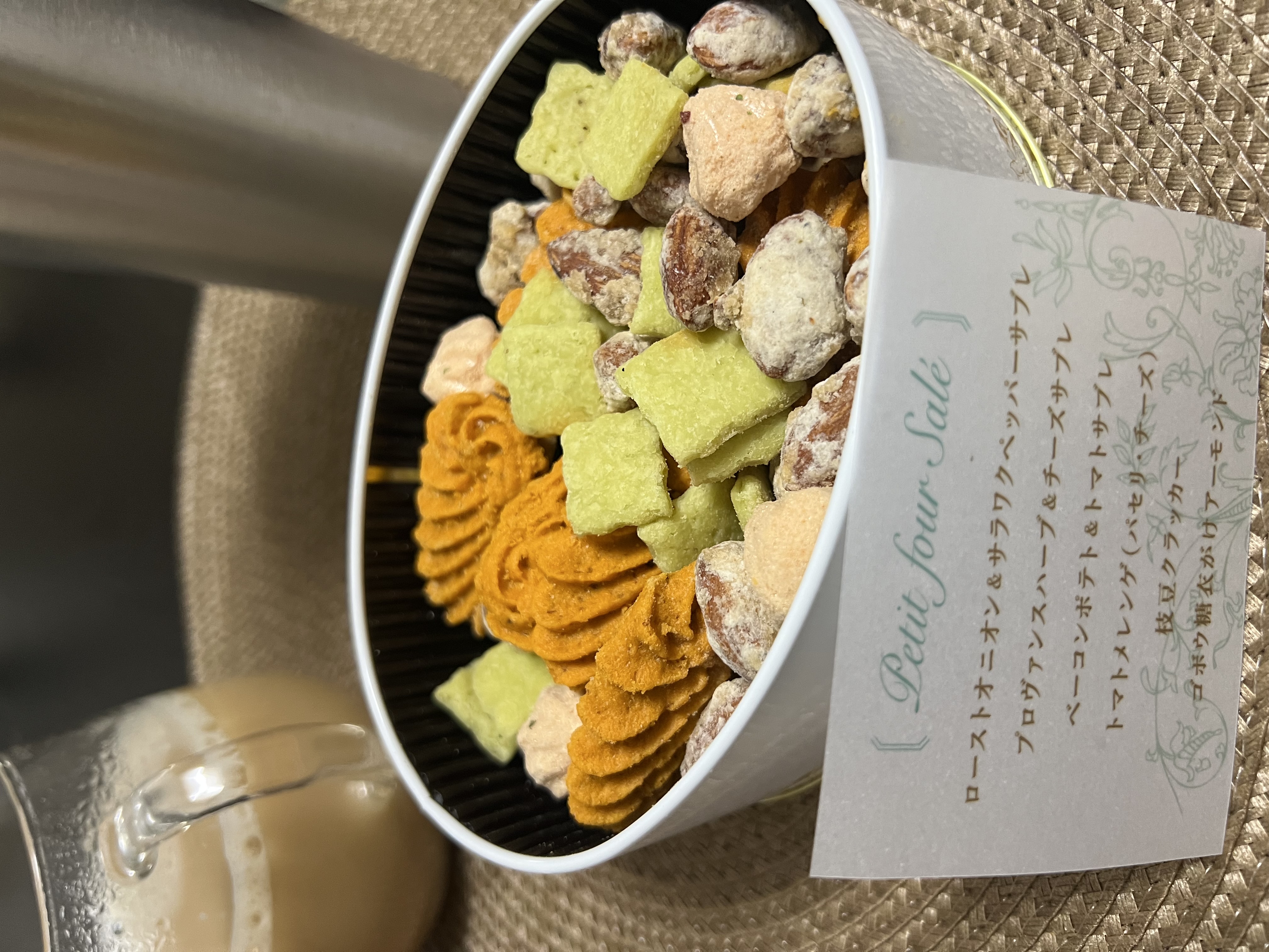 「サレ」とはフランス語で塩味のこと。ほんのりとした甘さの中に塩気やスパイスをきかせた6種類の「クッキー缶」です。トマトやポテト、枝豆などの野菜を生地に練り込み、何種類ものスパイスやハーブをふんだんに使用しており、口に運ぶとふわりとした香りが感じられます。また、サブレ・クラッカー・メレンゲ・アーモンドといった様々な食感が楽しめるのも特徴です。「お酒に合うフィンガーフード」をイメージしているので、お酒をたしなむ人へはもちろん、甘いものが苦手な人への贈り物にもおすすめです。