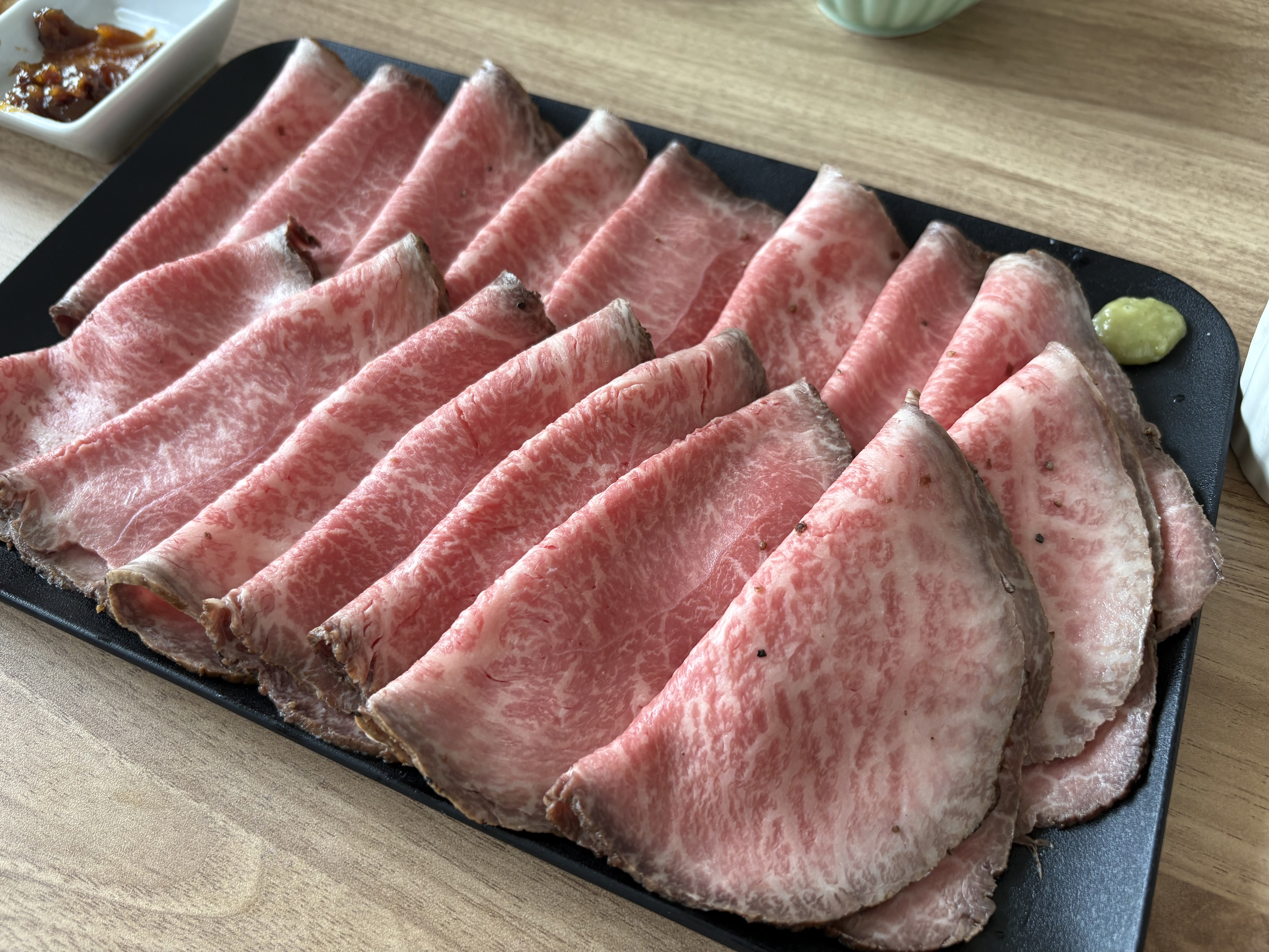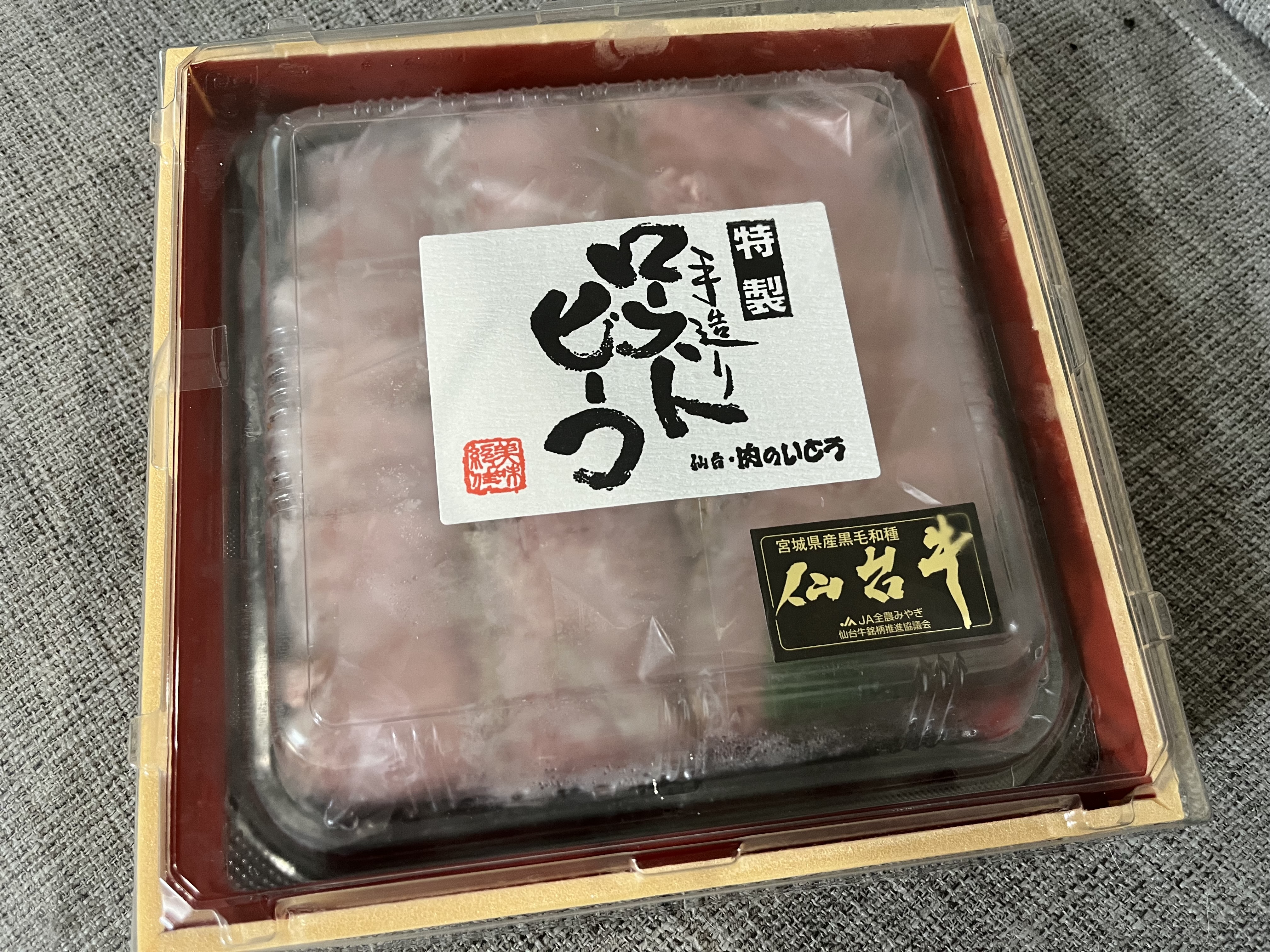 開けた瞬間「1枚1枚が大きい!」と驚きました。既にカットされた状態で届くって嬉しいですね^ ^分厚さを調整しながらスライスするのは意外と難しい為、助かりますし、作っている方のおすすめの分厚さでいただけるのが1番です。解凍は、冷蔵庫で一日かけて行いました。解凍後のお肉の断面の美しさにもうっとり。この絶妙なレア加減がたまりません。今回は、そのまま、丼、オリジナルソースの3つの食べ方でいただきました。まずはそのままでお塩とワサビをつけていただきます。お肉一枚をお箸で持ち上げ、その大きさに夫が「これ半分にカットしようかな?」と言うほどの大きさ。ずっしりのボリュームがあります。「でもせっかくだから一口でいこうよ!」と....食べて、その柔らかさと旨みの強さに衝撃を受けました。きめ細かく、口の中でとろけていきます。仙台牛ってこんなに柔らかいんですね!旨みがぎゅううと閉じ込められています。そのまま食べても下味がついている為、美味しくいただけます。仙台牛本来の味を楽しめるこの食べ方、おすすめです。それにしても一枚一枚が大きい!一枚での満足感が半端無いです。でも美味しすぎて、一枚じゃ足りない!