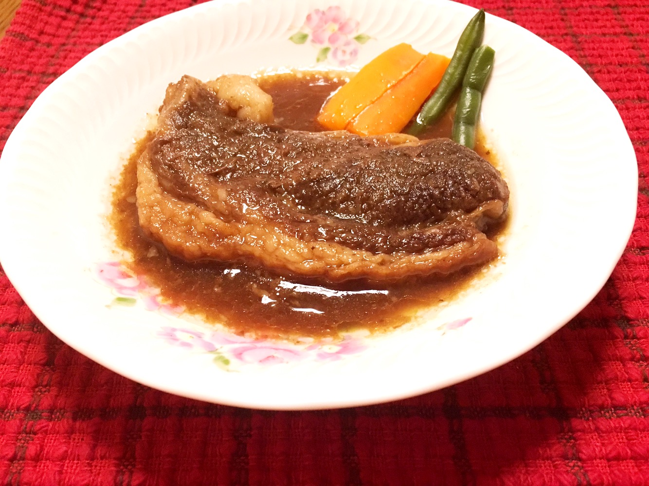バラ肉100%なので、赤身と脂身が層になっていて、ナイフ・フォークを使わなくても箸でも簡単に裂ける柔らかさ!