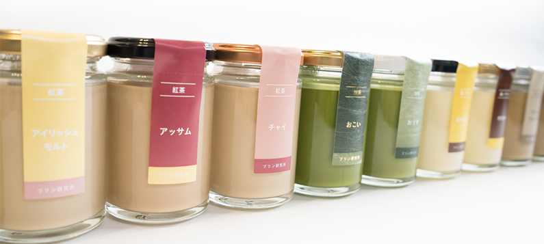 牛乳、卵、砂糖のみで作ったシンプルなプリン、真・プリン「なめらか」、最高級スペシャルティーコーヒーをプリンに合うようブレンドしたコーヒープリン「プリンブレンド」、ドイツの老舗紅茶メーカー「ロンネフェルト」の高級茶葉を贅沢に使用した紅茶プリン「アッサム」、最高級グレードのマダガスカル産バニラビーンズを使用したバニラプリン「マダガスカル」。