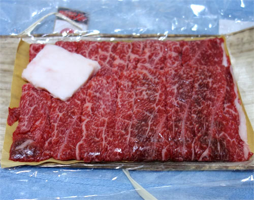 そして、その包みを開くと、鮮やかな赤い色にほどよくサシが入った美しいお肉が登場。牛脂もついてます。