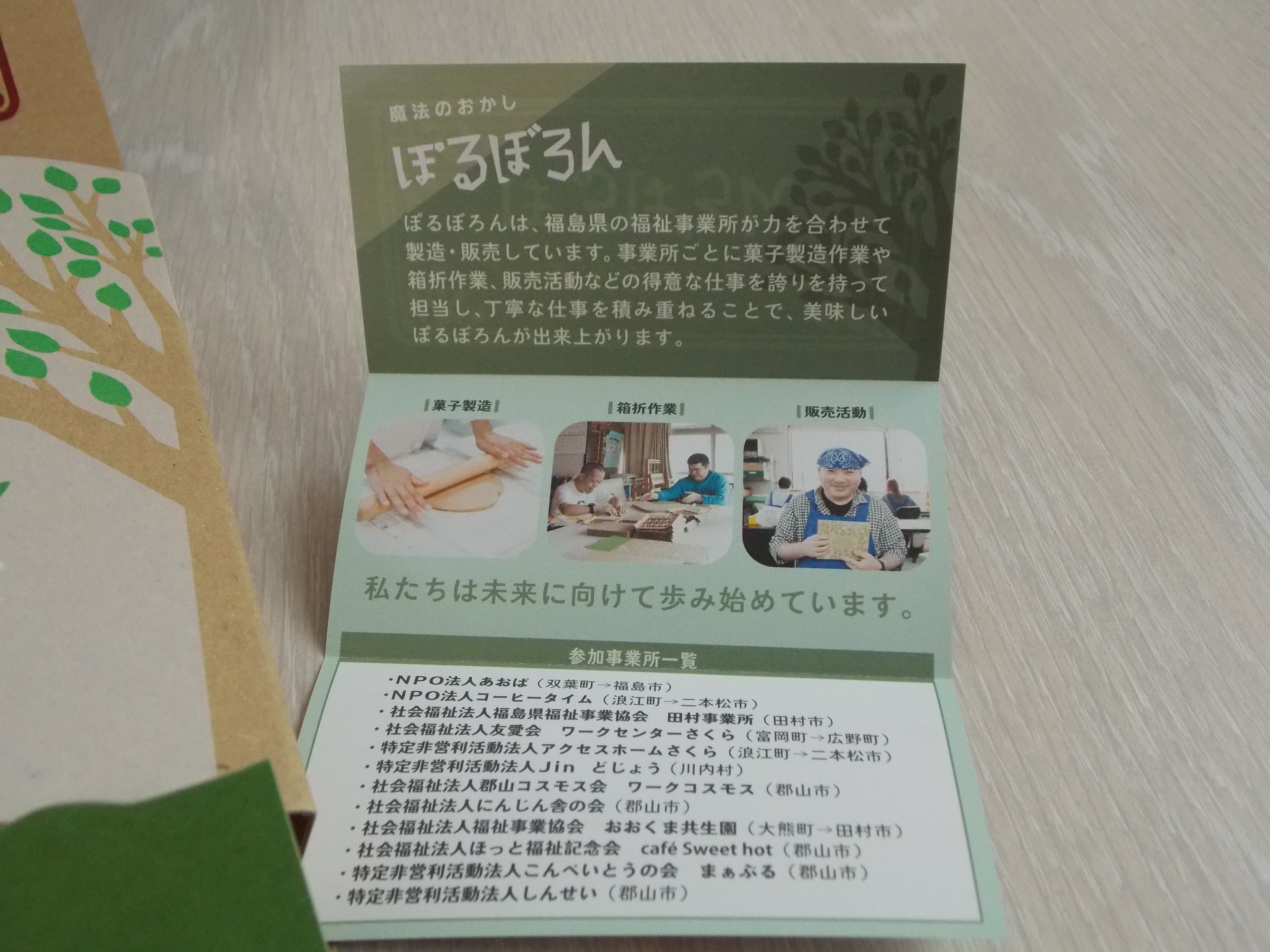 シナモンの風味と柔らかな食感が魅力のぽるぼろん。そのルーツはスペイン・アンダルシア地方発祥の祝い菓子です。口の中で溶ける前に「ぽるぼろん」と3回唱えれば願いが叶うと言われています。ぽるぼろんは、福島の障がい者協働プロジェクトから誕生し、13事業所で、菓子製造作業や箱折作業、販売活動などを行っています。ひとつひとつ丁寧な仕事を積み重ねることで出来上がりました。
