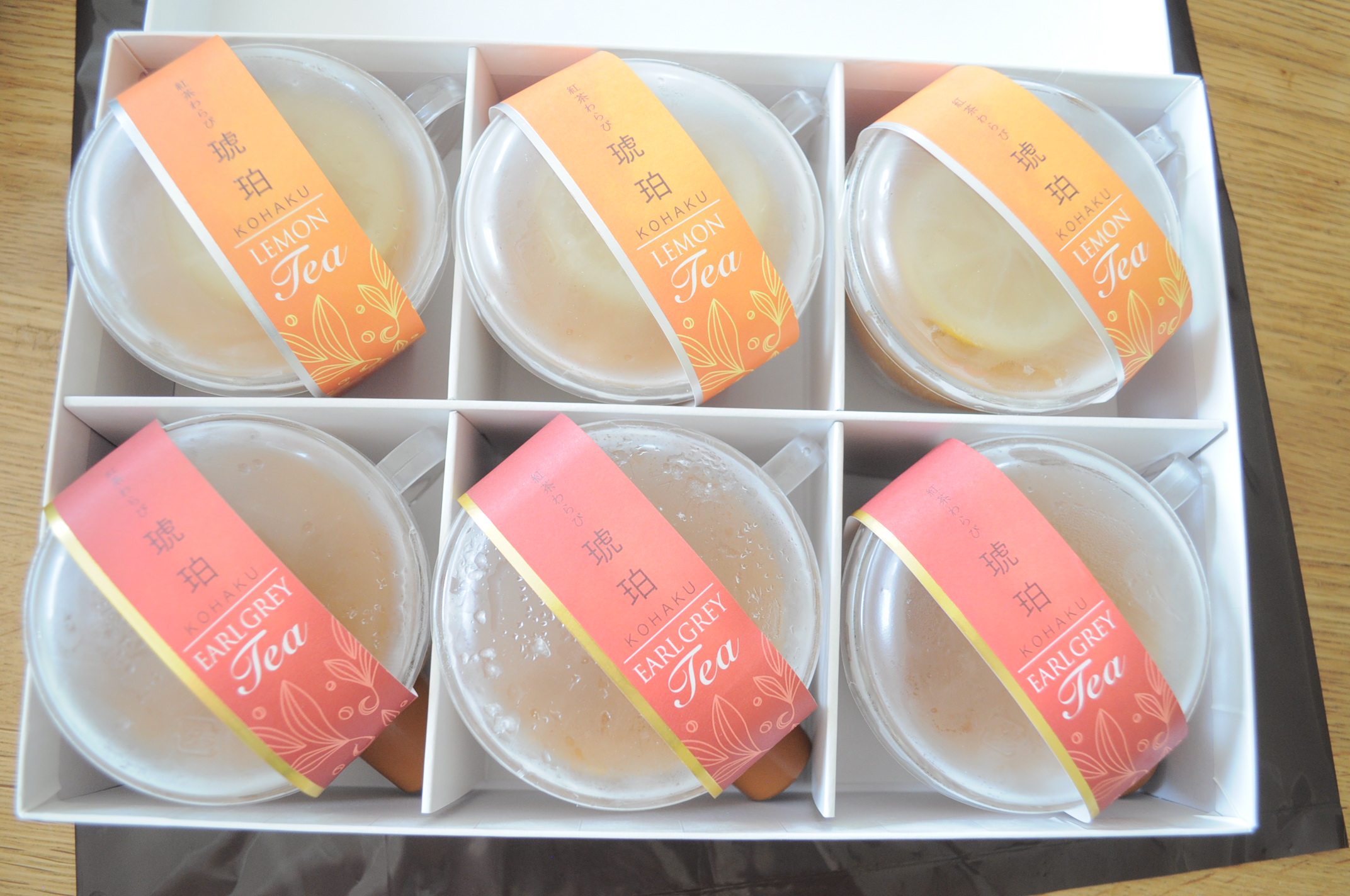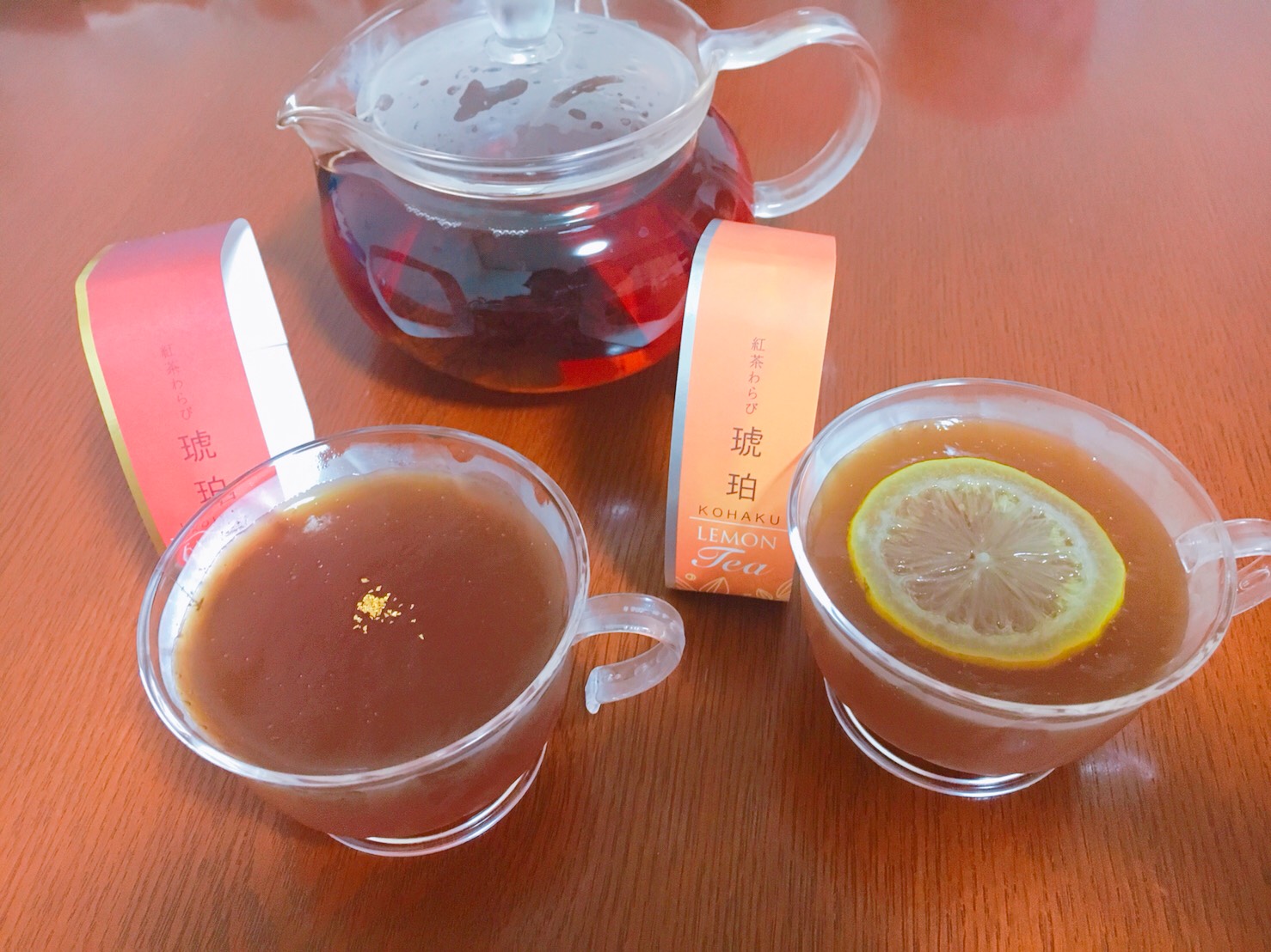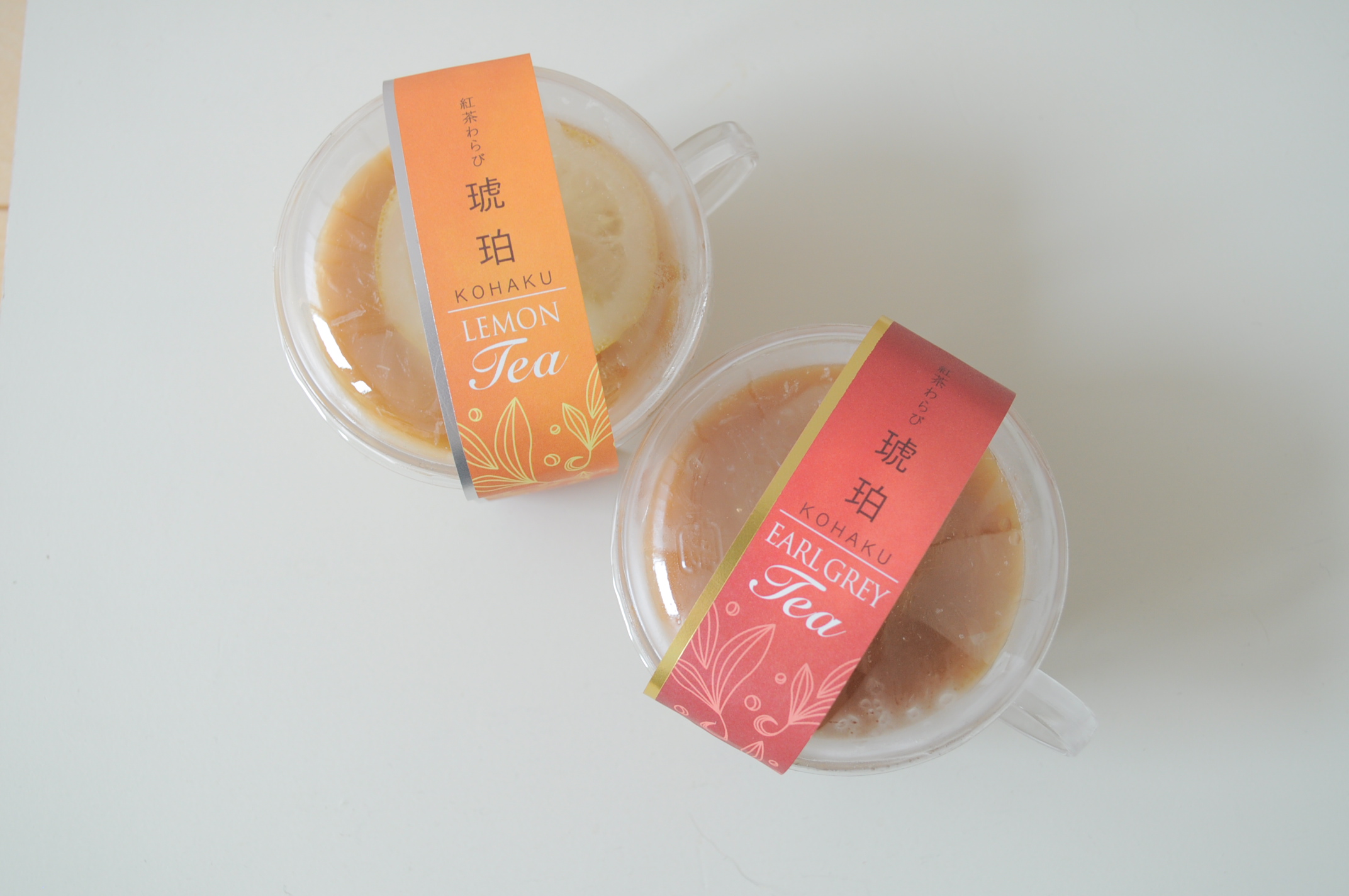 アイスティーをわらび餅で表現して見ました。レモンティーとアールグレイの2種類をご用意。レモンの香りと酸味を楽しめるサッパリした味わい。広島県産の蜜漬けレモンをそえています。アールグレイは、紅茶の風味をそのまま感じられます。好みに合わせてコーヒーフレッシュをかけて頂くとミルクティーのような味わいが楽しめます。