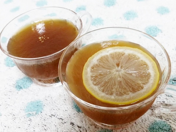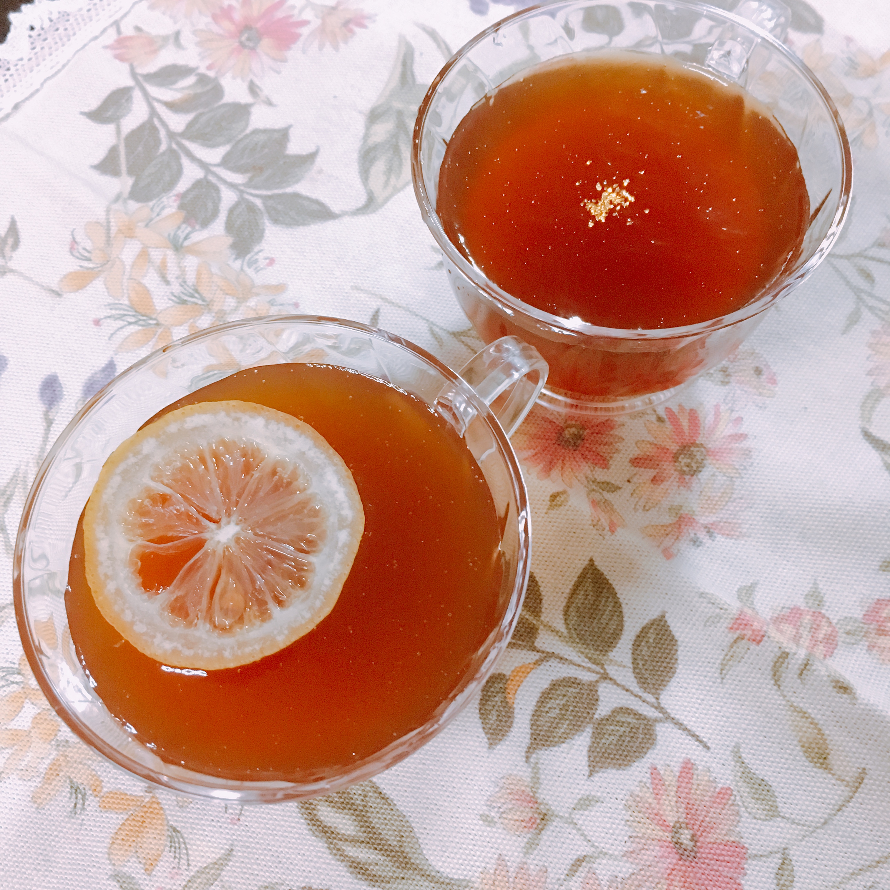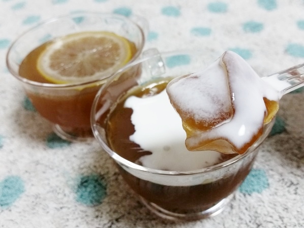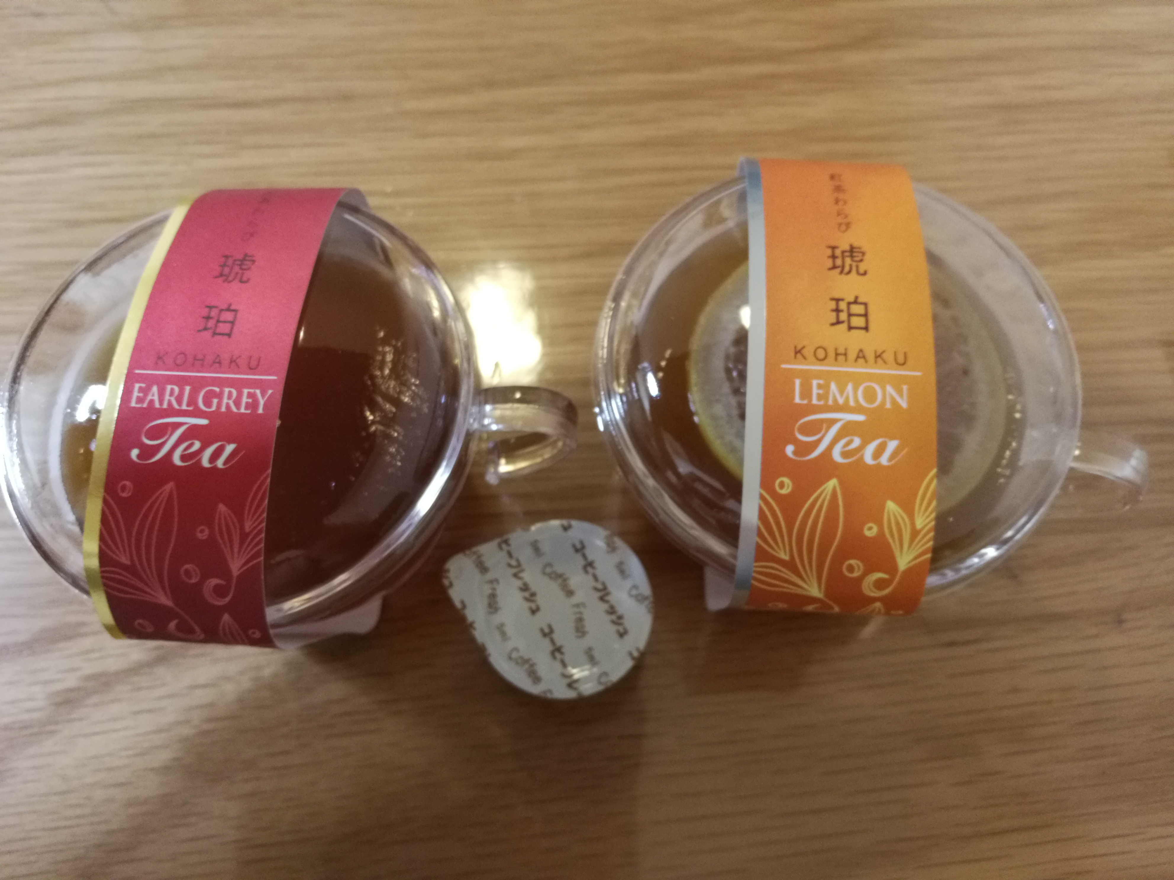 味は、レモンティーとアールグレイの2種類。レモンティーは、レモンの香りと酸味を楽しめるサッパリした味わい。広島県産の蜜漬けレモンをそえています。アールグレイは、紅茶の風味をそのまま感じられます。好みに合わせてコーヒーフレッシュをかけて頂くとミルクティーのような味わいが楽しめます。