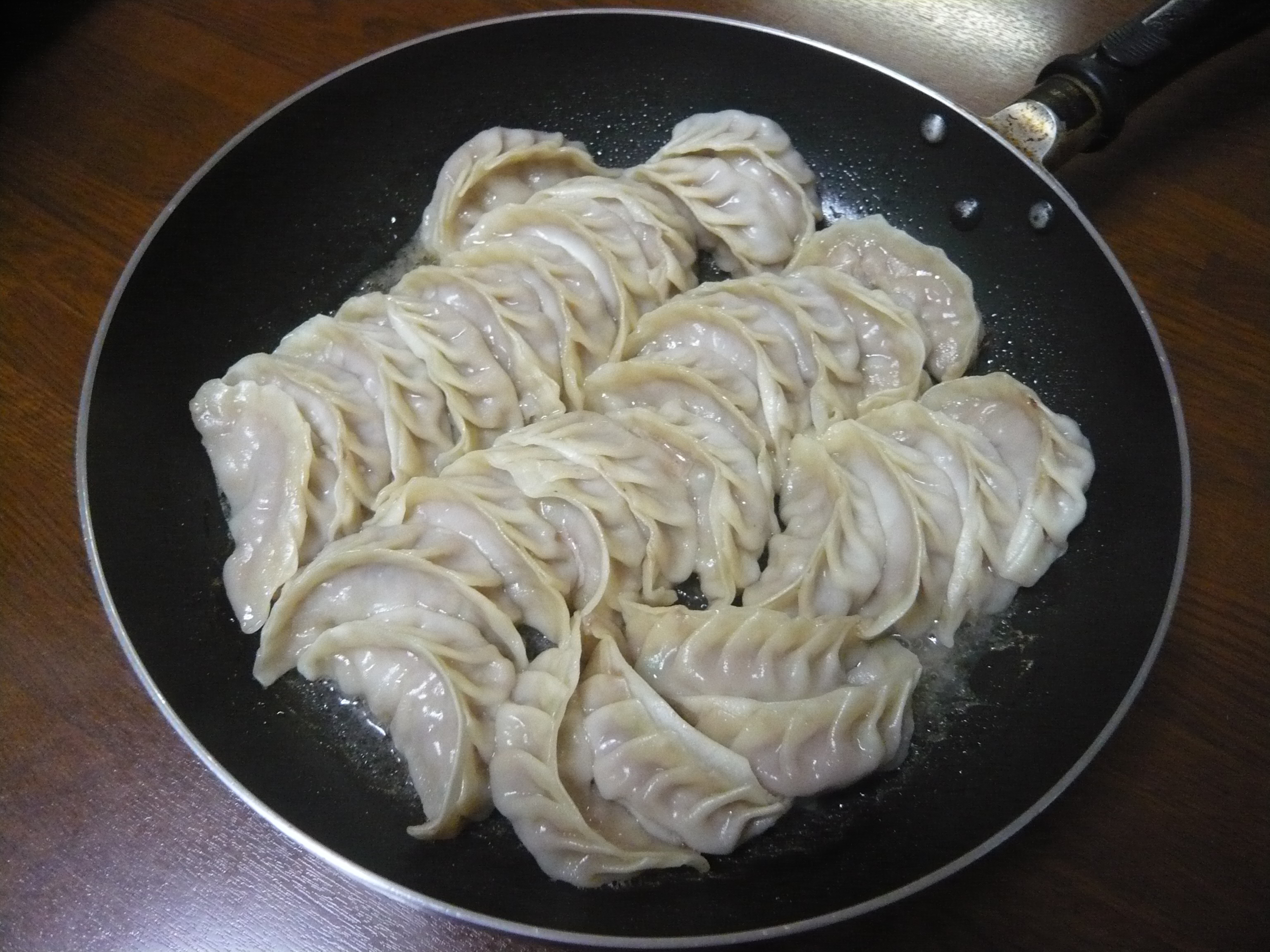皮の焼き目の部分はカリッとしていて、そのほかの部分はもっちりしていました。結構な量の水を加えて焼いていくからかなーと思いました。3分半蓋をして、と書いてありましたが、3分半では水もなくならず、蓋を開けて少し蒸発させました。