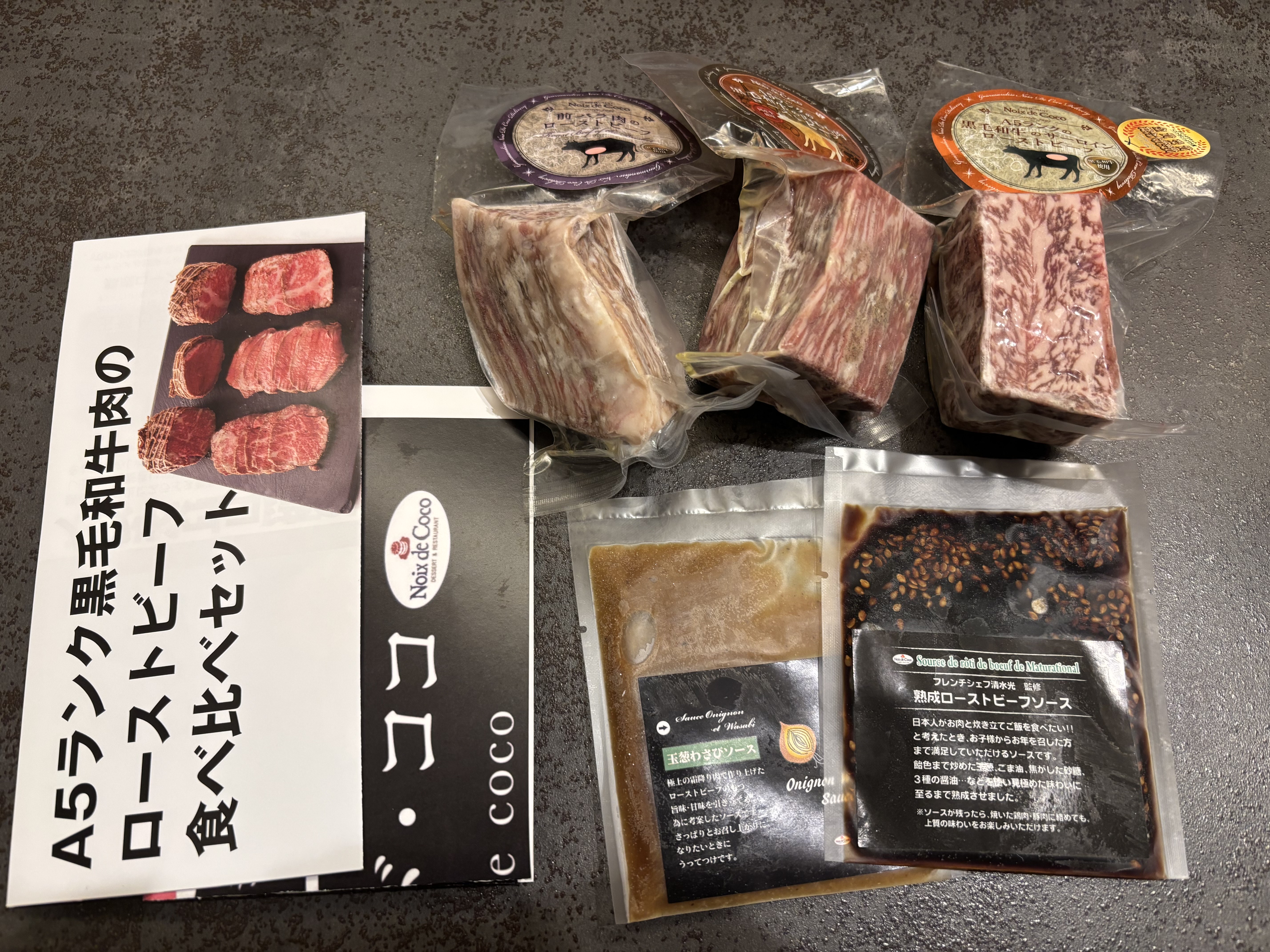 箱を開けると3種類のローストビーフ、2種類のソース、リーフレットが入っています。