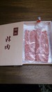 逸る気持ちを抑え、ダンボール箱を開封すると、中から、ショップさんのご案内と、特選肉と書かれた桐箱プリントの化粧箱が登場!!
