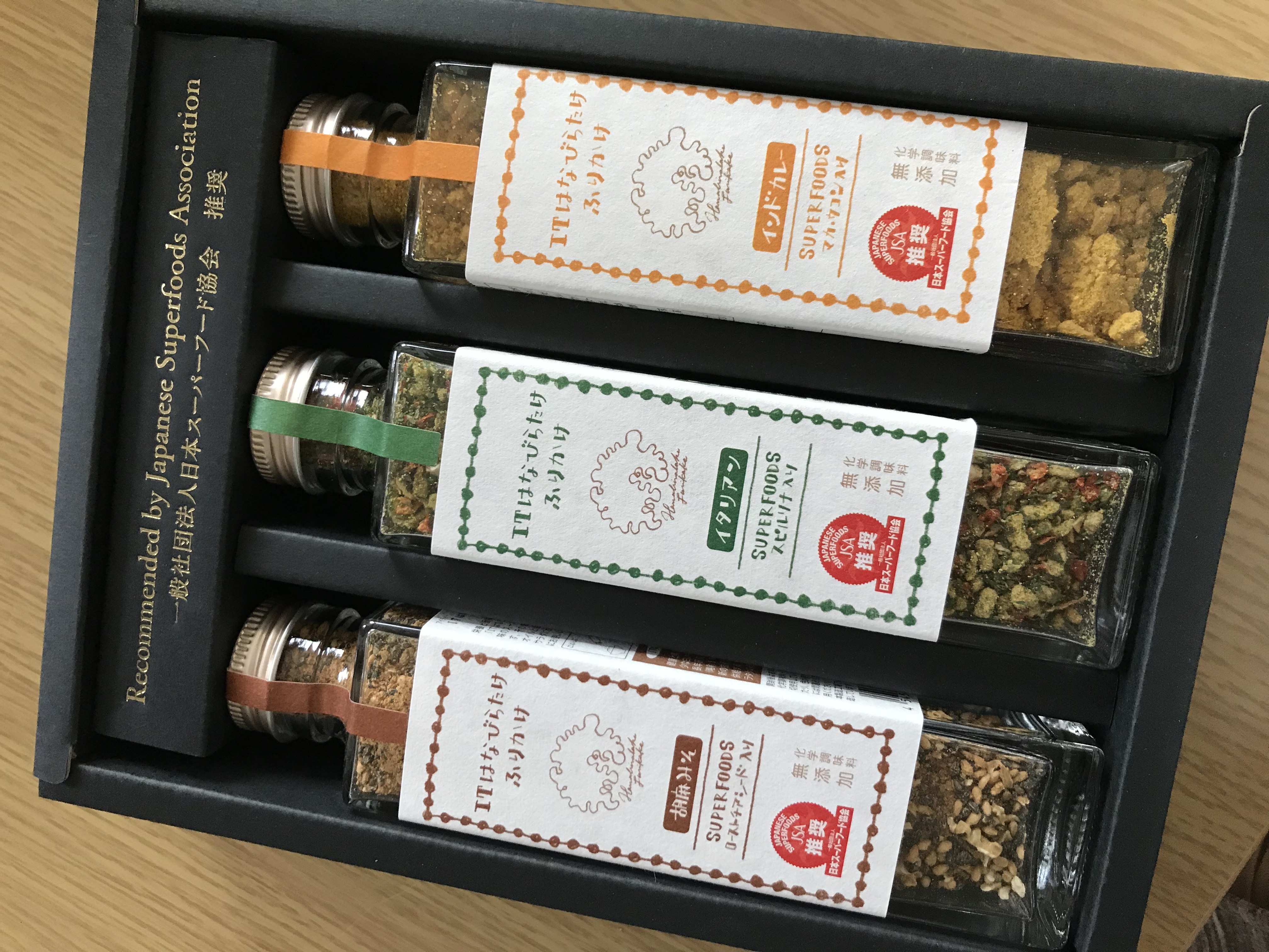 スーパーフードの「ITはなびらたけ」を毎日おいしく摂れるように、栄養と旨味が“ギュッ”とつまったふりかけのギフトセット。胡麻みそ、イタリアン、インドカレーの3種を楽しめます。