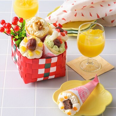 見た目も可愛らしい、花束のような「クレープ」です。クレープ生地には栄養価の高い「和食のたまご」と成分無調整豆乳を使用し、もっちりとした食感に仕上げています。一口食べた瞬間の味わいを追求し、生クリームはトッピングごとにあっさり味と濃厚味を使い分けています。「抹茶いちごもち」「モンブラン」「ストロベリーチョコ」「メープルナッツ」「オレンジショコラカスタード」の5種類がセットになっており、異なる味わいを食べ比べられます。ギフトやプレゼントにはもちろん、自分へのご褒美にもぴったりです。