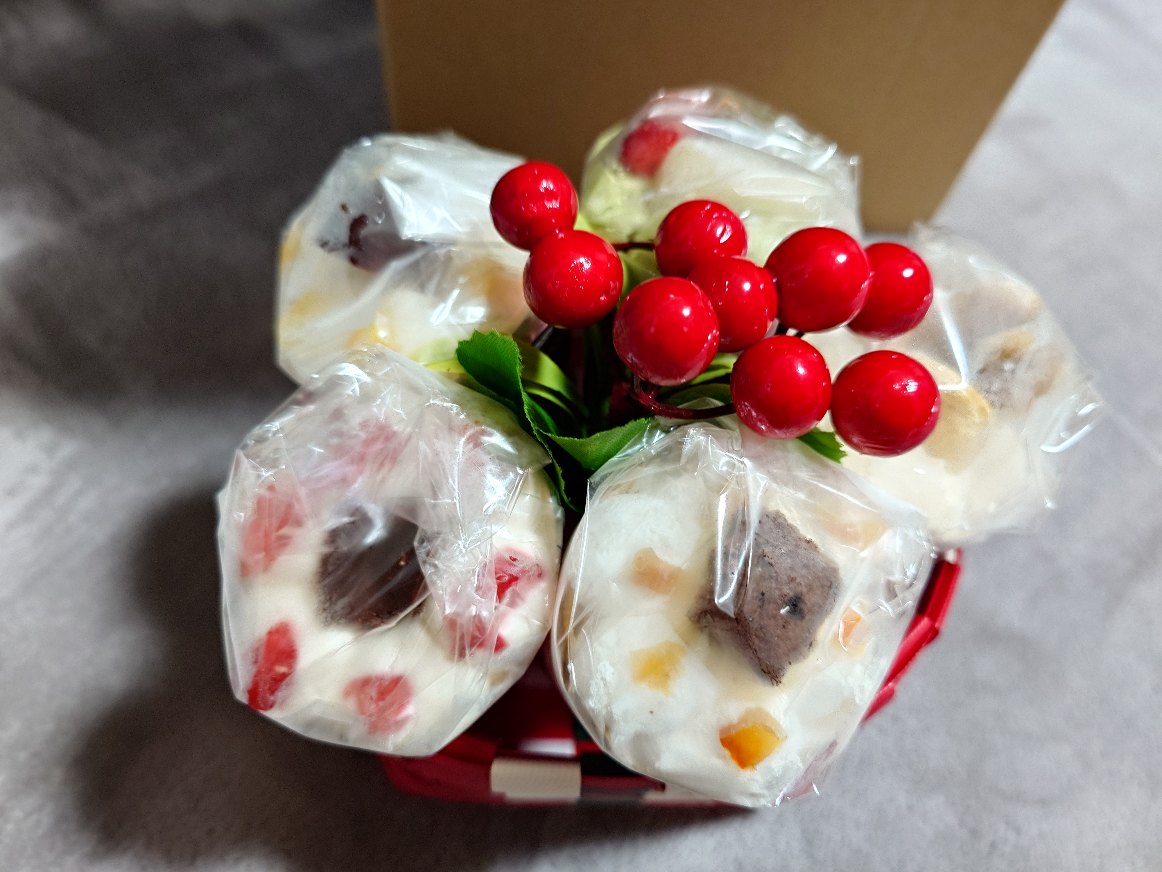 カラフルなカゴに造花まで添えられてあり、幸せな気分になりました。
