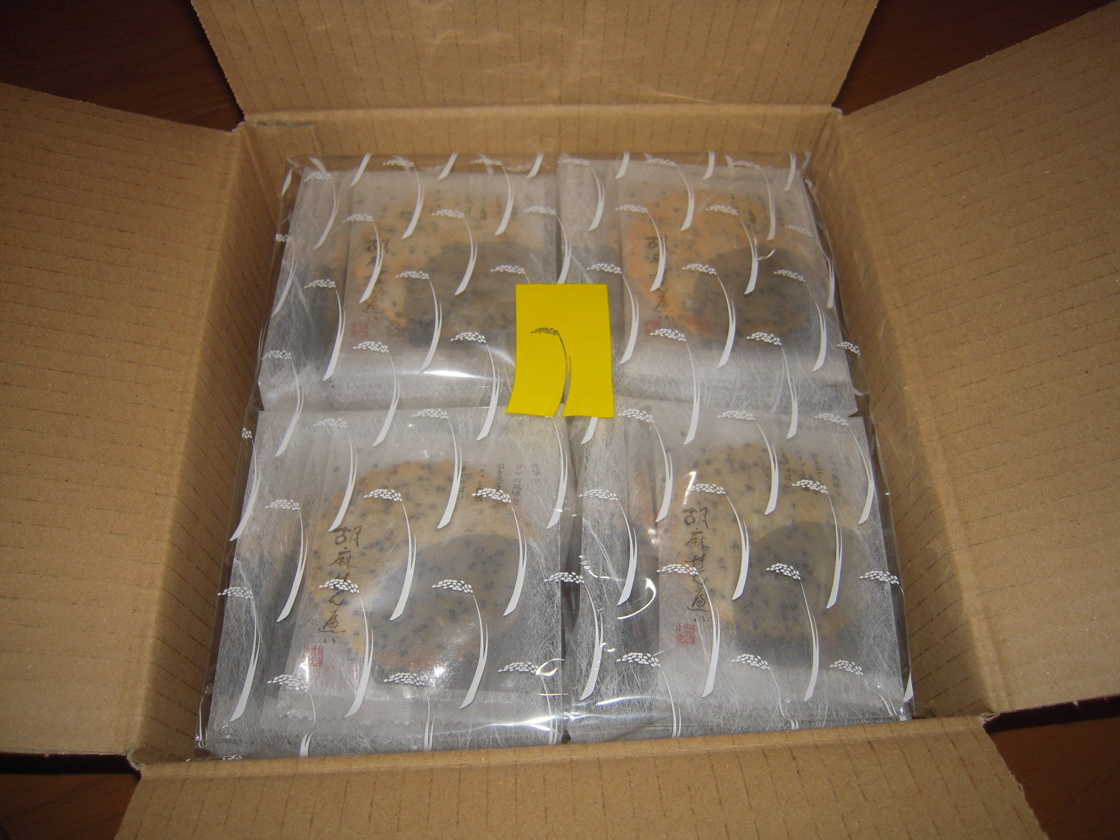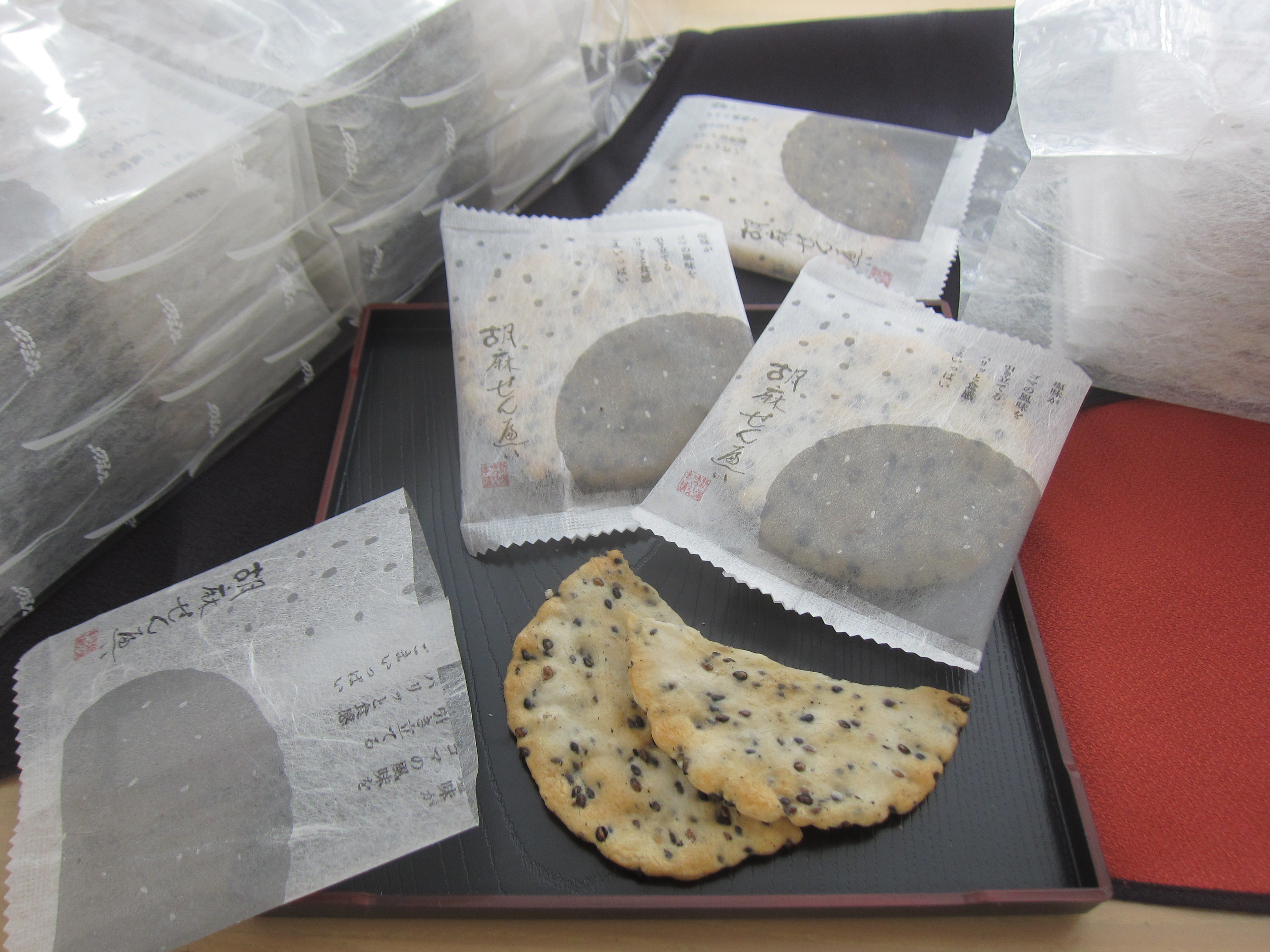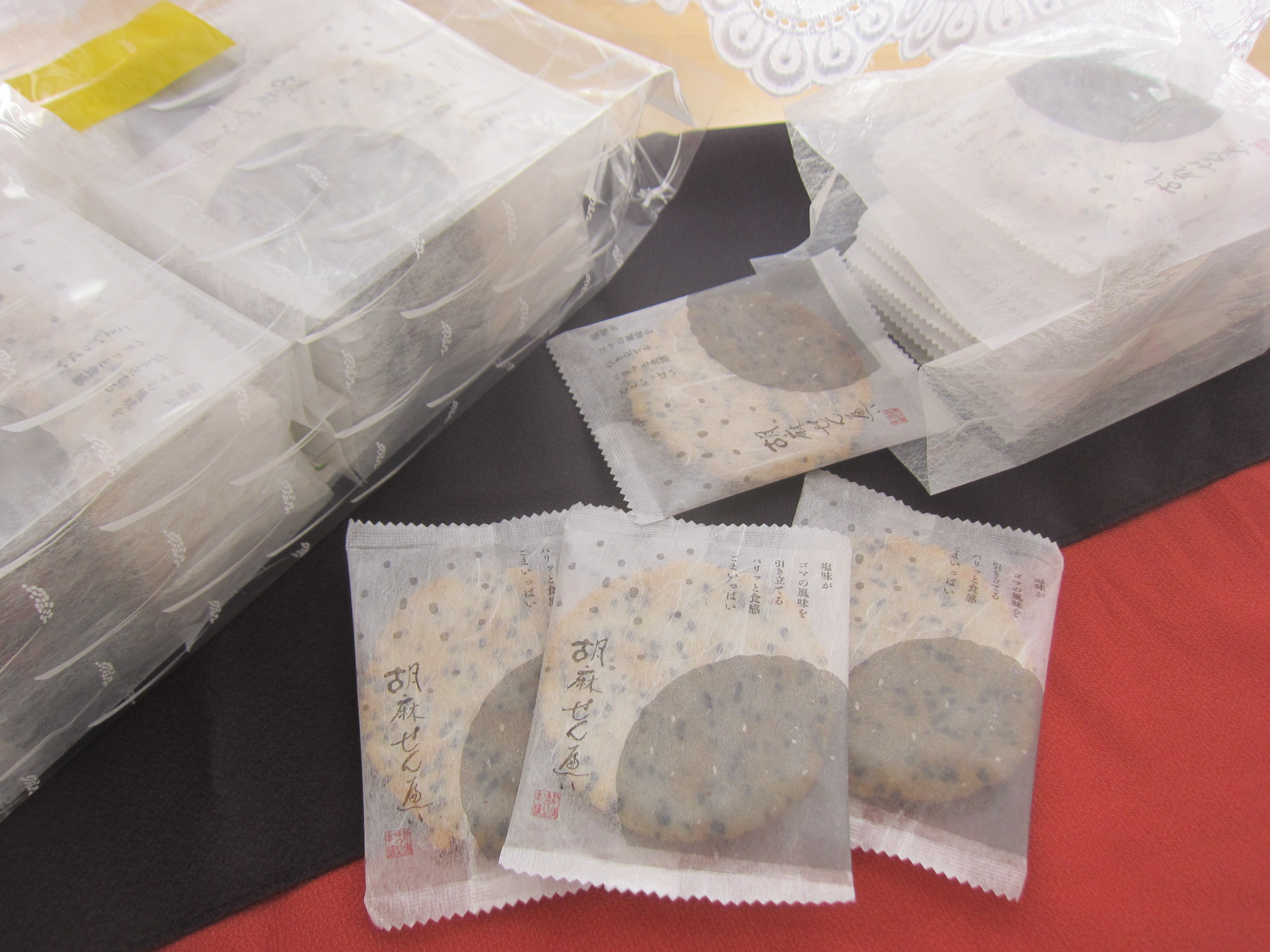 個包装された胡麻せんべい56枚が4つに分けて包装され入っています。丁寧な包装でお裾分けしやすいのも用途が広がり嬉しいです。