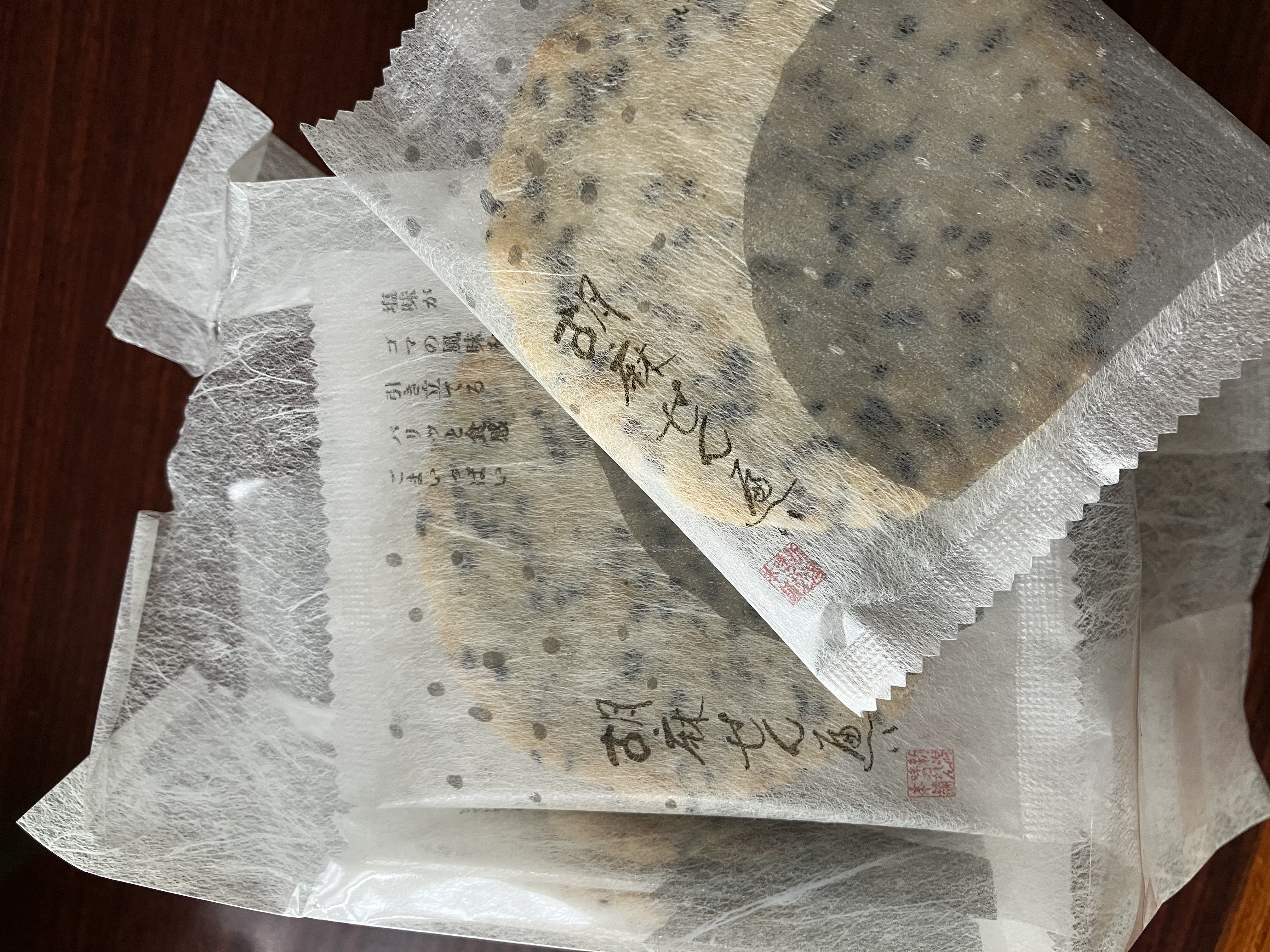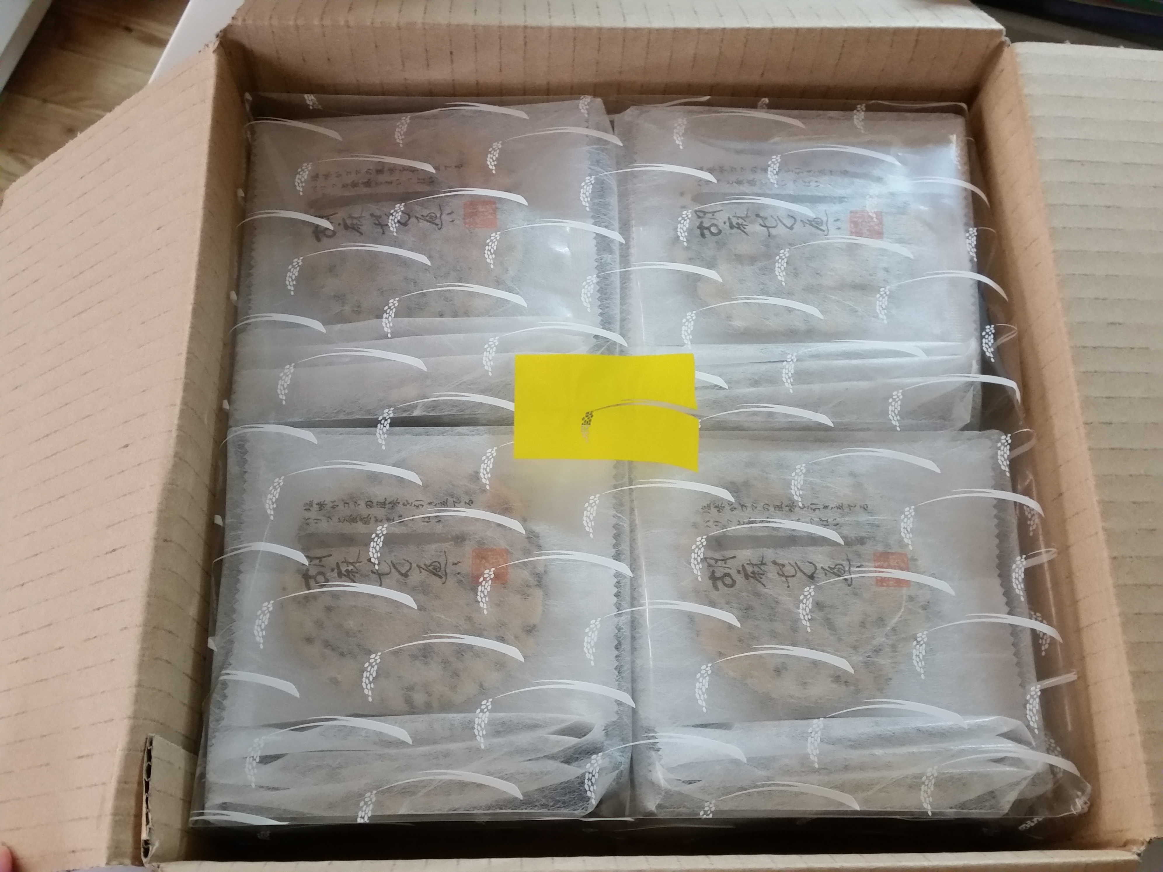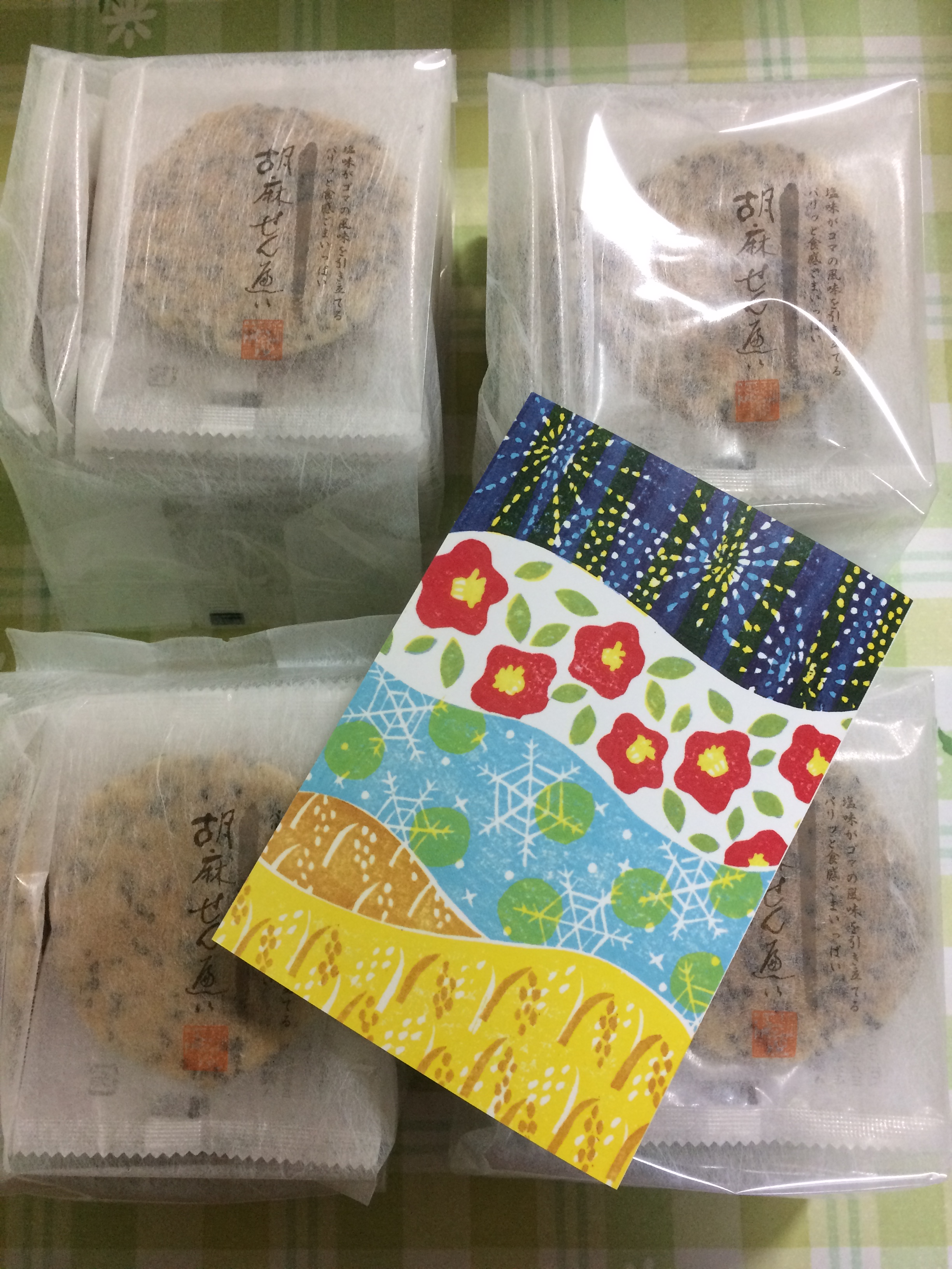 個包装された胡麻せんべい56枚が4つに分けて包装され入っています。丁寧な包装でお裾分けしやすいのも用途が広がり嬉しいです。