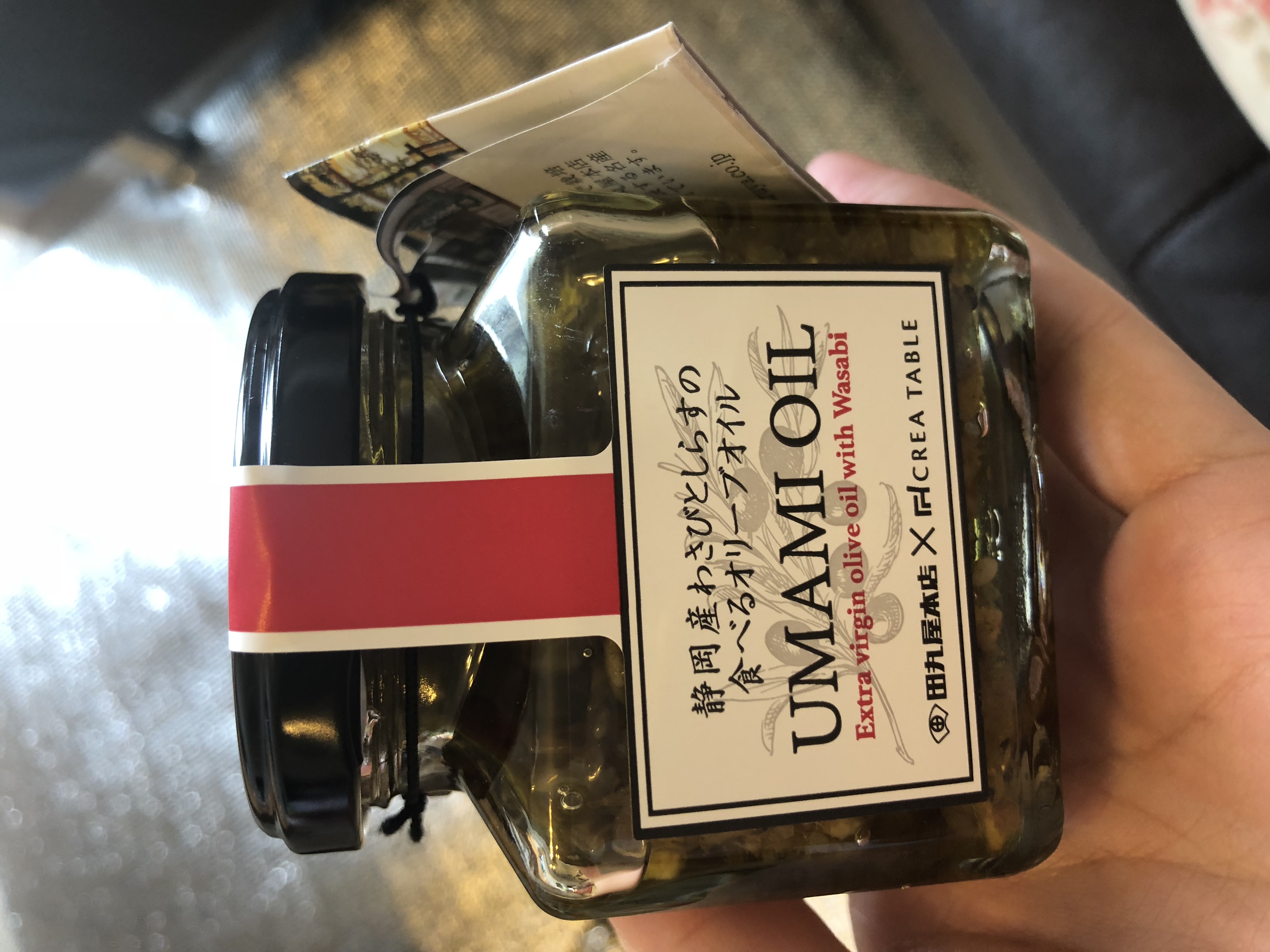 オリーブオイル専門店とわさび漬けの老舗「田丸屋本店」とのコラボレーションで生まれた「UMAMI OIL」。厳選したエキストラバージンオリーブオイルに静岡県産のわさびの茎、用宗港水揚げのしらす、トマト、アンチョビ、松の実、にんにく等を加え、和洋の風味がバランスよく調和した食べるオリーブオイルです。
