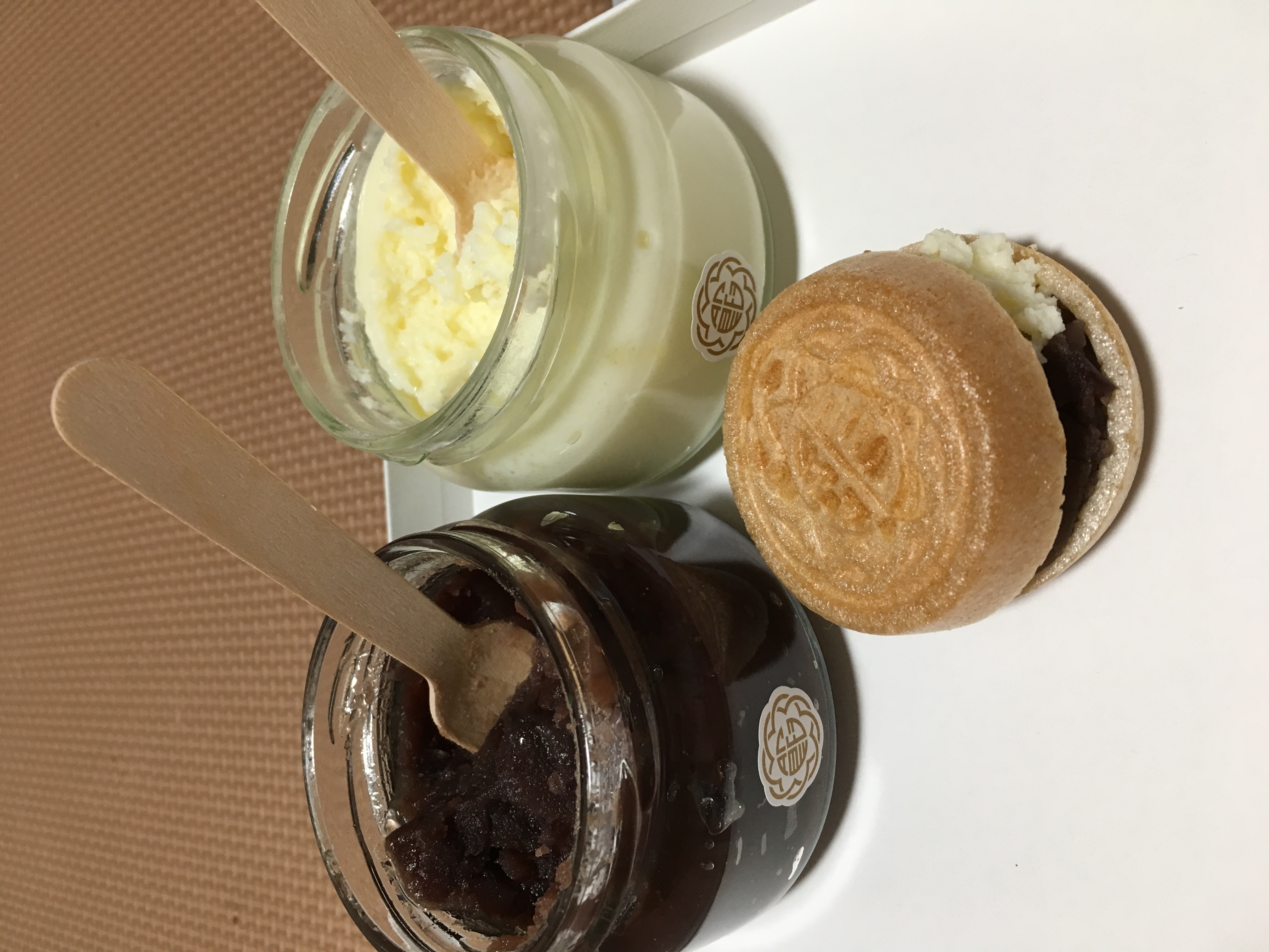 十勝産小豆をじっくり炊き上げたつぶあんとマスカルポーネチーズを使用した自家製クリームをサンドして食べる、新しい発想の最中です。滋賀県産の糯米「羽二重糯」を使った、香ばしく歯切れのよい最中皮。北海道十勝産小豆をじっくり炊きあげたつぶあんと、北海道産マスカルポーネチーズ、クリームチーズを使用した自家製クリームを、自分好みの分量で挟み込めるのがポイント。食べる直前に餡を挟み込むので、皮がパリパリのままなので、食感も楽しめる最中です。