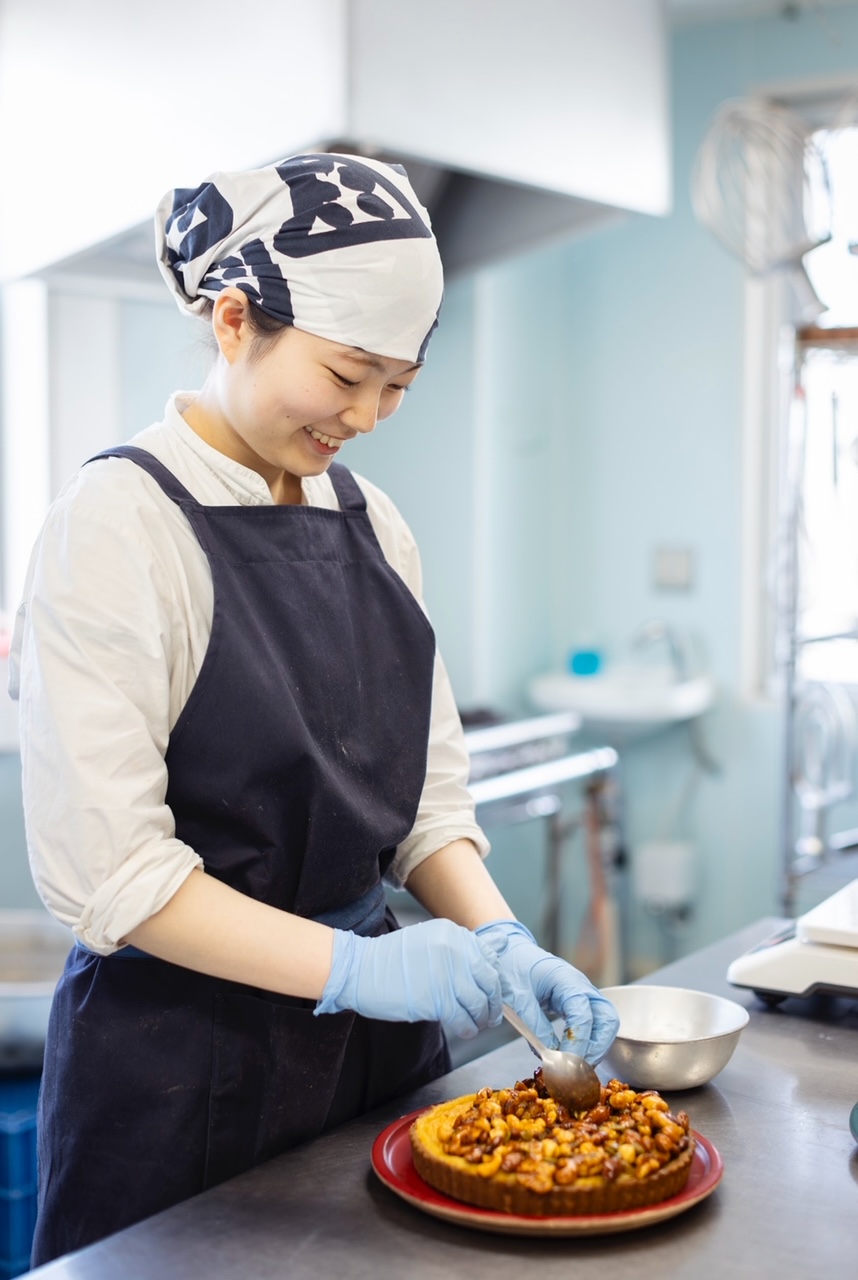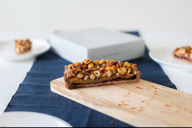 カリッとオーブンで焼いたナッツをほろ苦くキャラメルソテーし、全粒粉を使ったザクザクタルト生地に自家製の木苺ジャムを乗せ、その上にたっぷりとナッツを敷き詰めました。