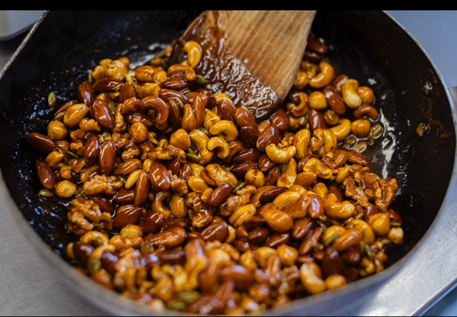 芯までカリっとなったナッツを銅鍋でキャラメルソテー。