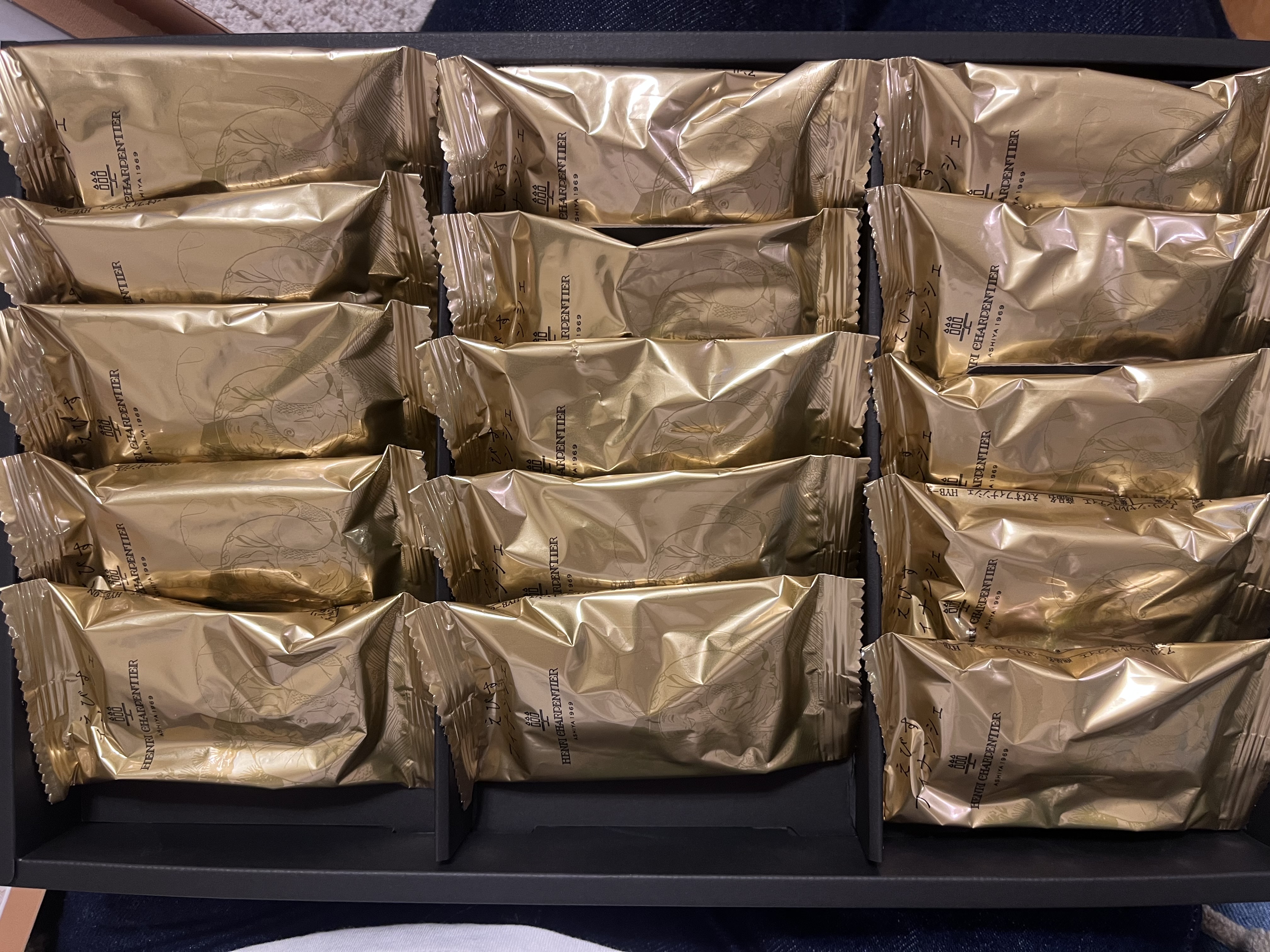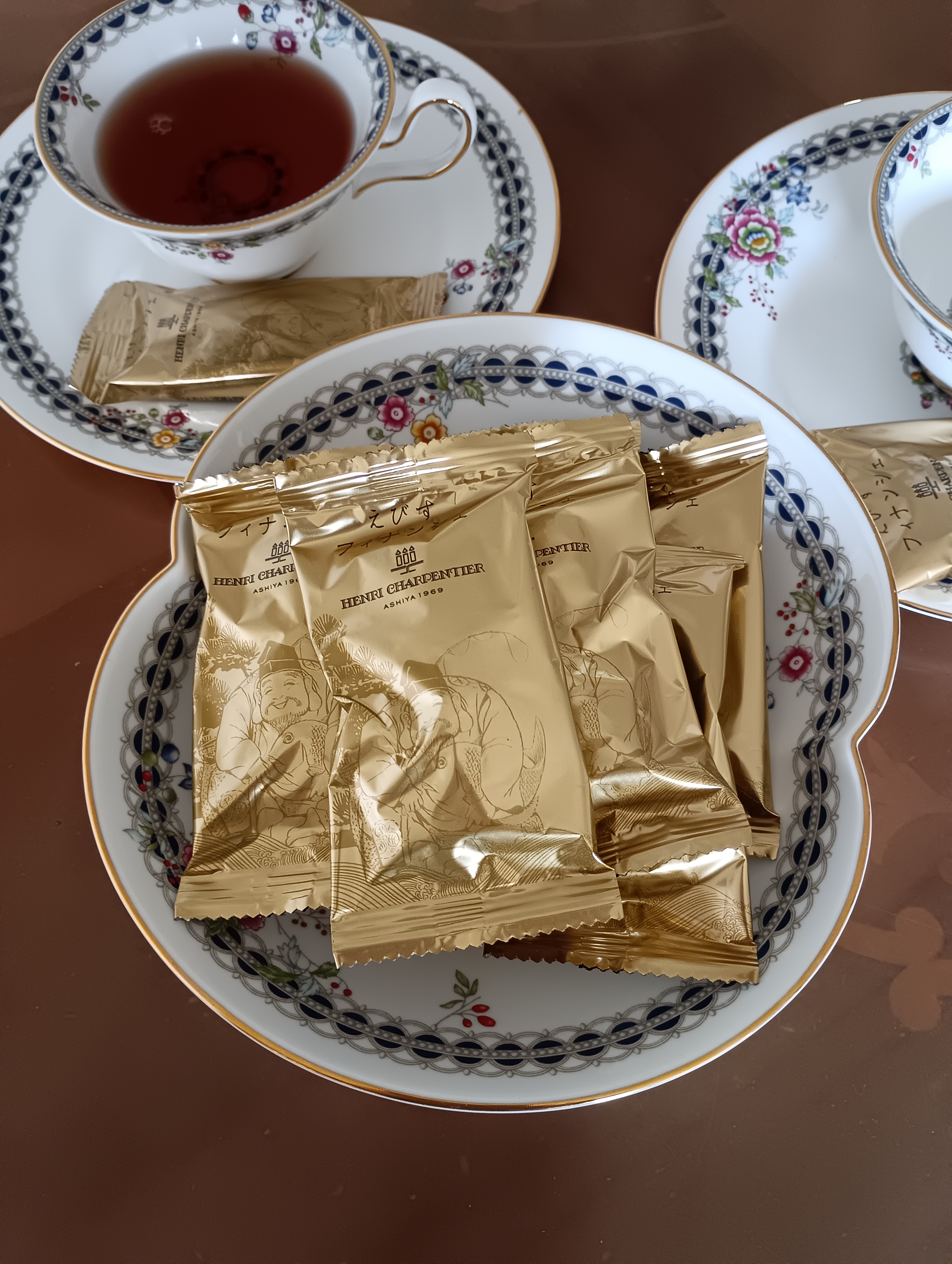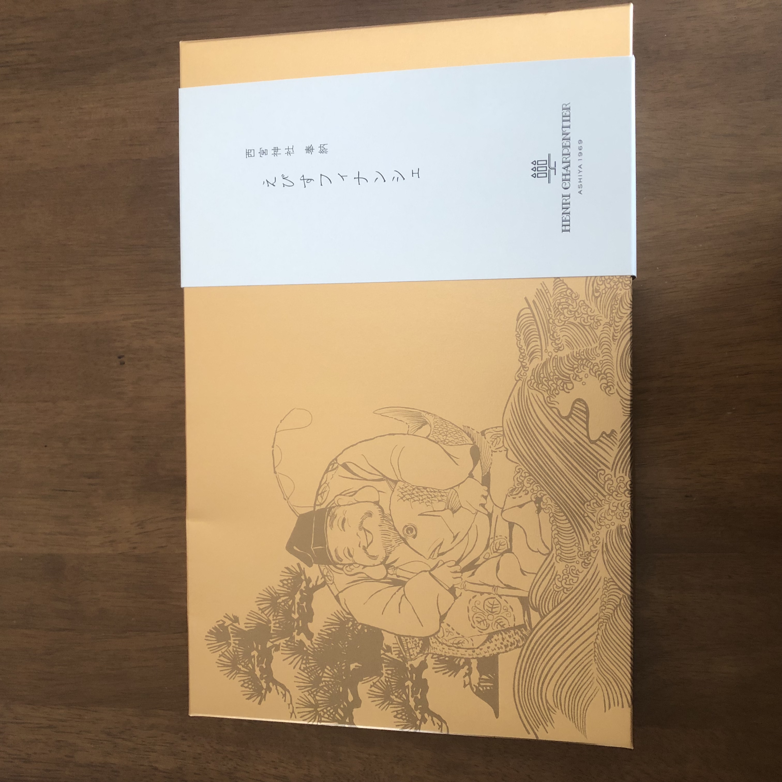 毎年福男を決めることで有名な西宮神社は、アンリ・シャルパンティエの工場のすぐ近くにあります。その縁もあり、毎月1日に食べる方の幸せと商売繁盛を祈願して奉納しています。パッケージも金色と、えびす様のイラストでおめでたい贈りものにはぴったりです。お祝いや、縁起菓子としてお使いください!