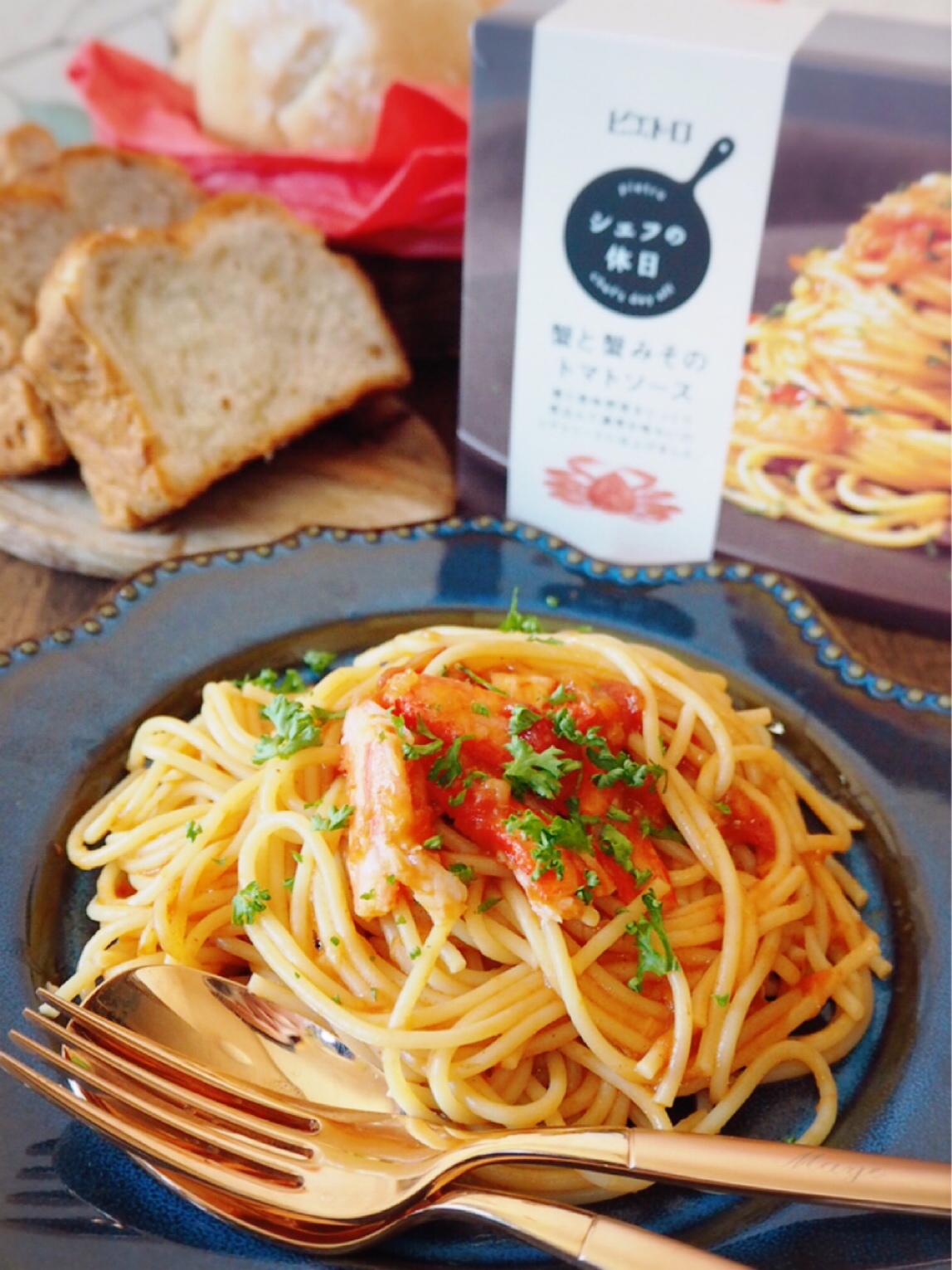 レンジ調理でレストランの味をそのまま家庭で再現できる、プレミアムな冷凍食品シリーズ「シェフの休日」。その中でも人気の高い「蟹と蟹みそのトマトソース」は、蟹と香味野菜をじっくり煮込んだ濃厚な味わいのトマトベースのパスタです。