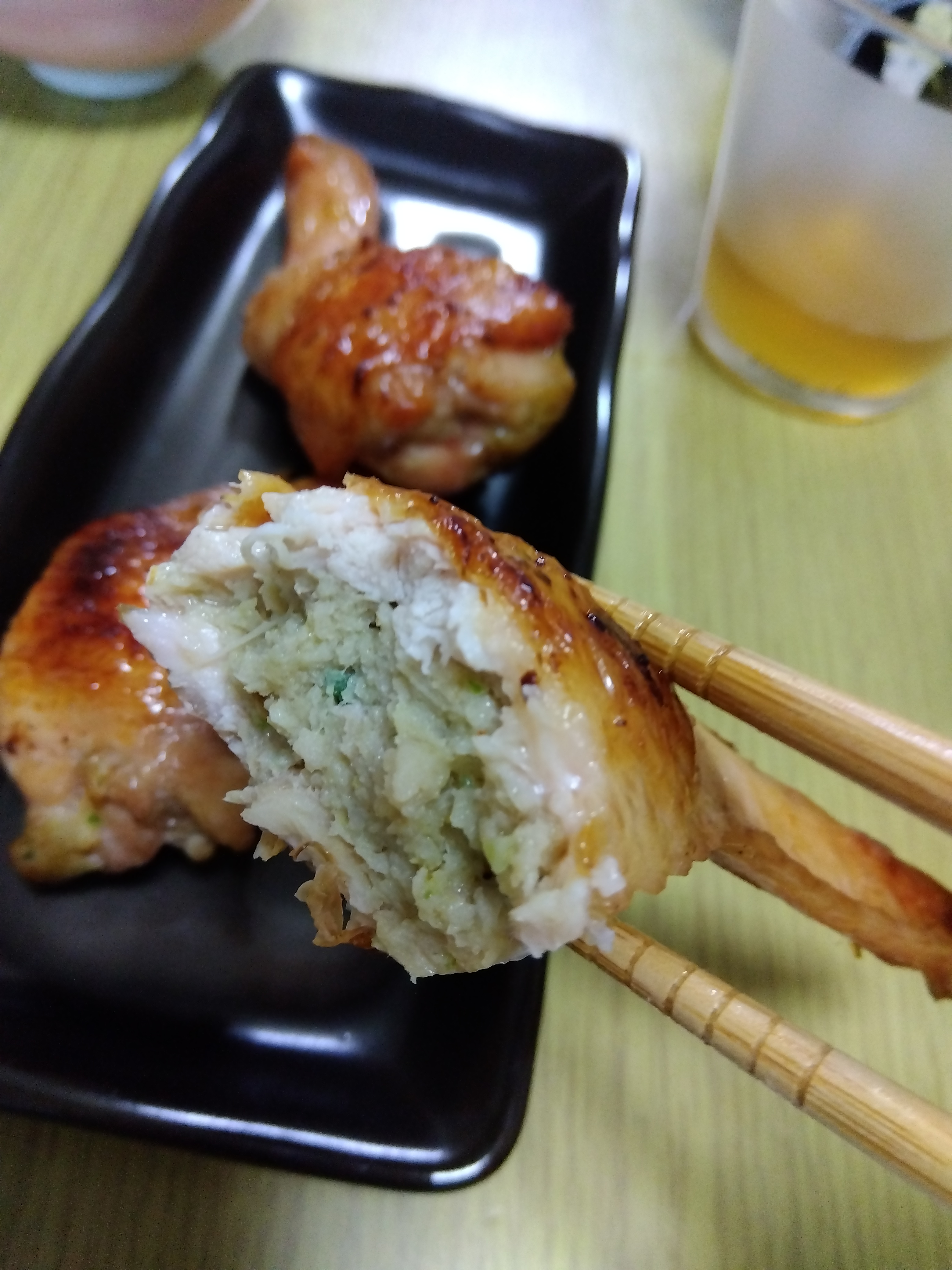 骨を抜いた手羽先の中に、餃子の具をギュッと詰めたものが「手羽先餃子」です!