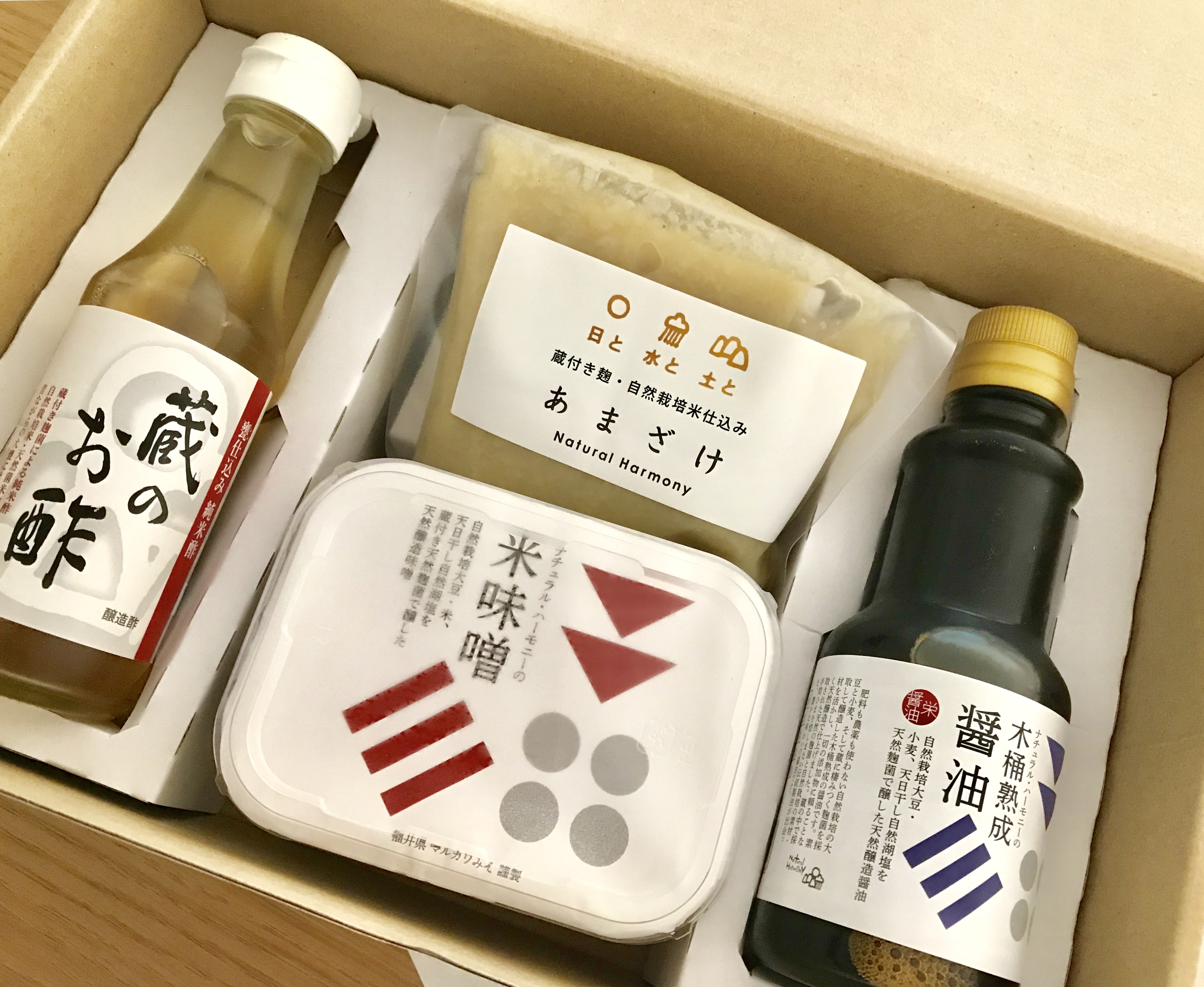 蔵に棲み着く天然の菌で醗酵させた、こだわりの醤油・味噌・酢・甘酒のセットです。天然醸造でじっくりと醗酵させることで、複雑な旨みが生まれながらも、素材の味を邪魔せず料理を優しくまとめることができます。基礎調味料だけでなく、砂糖がわりに調理にも使用できる甘酒も加えました。料理好きな人への贈り物にもおすすめです。