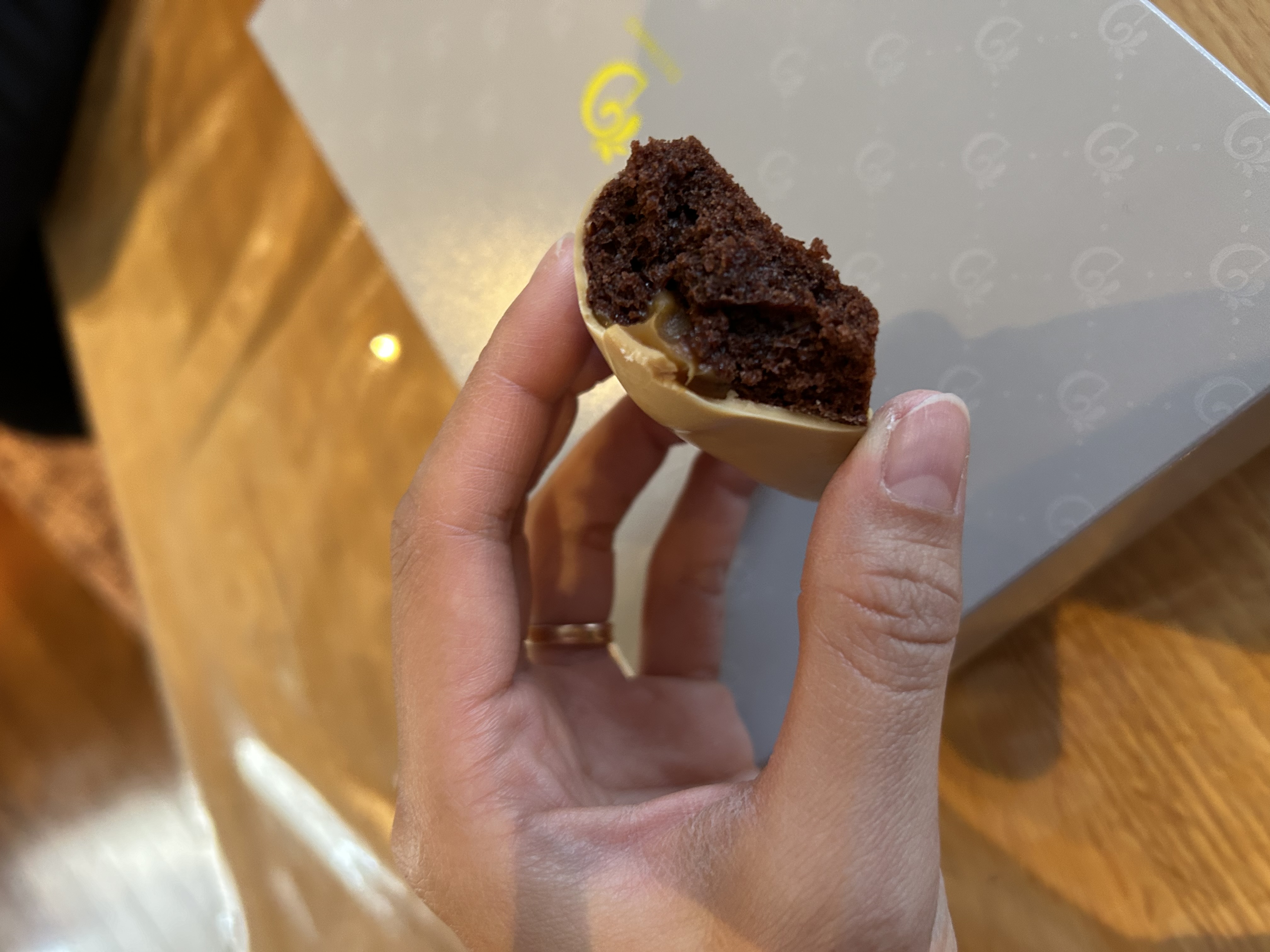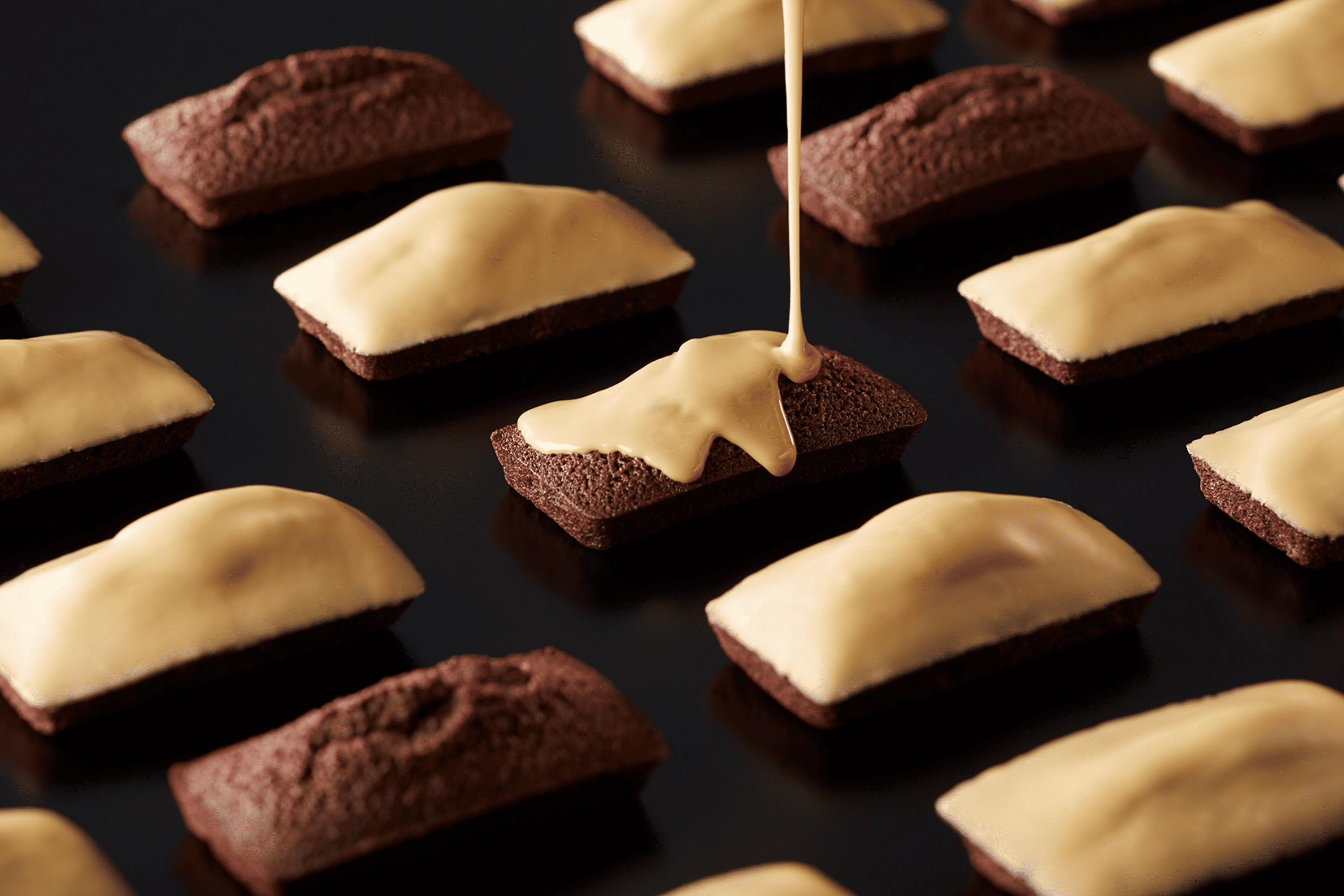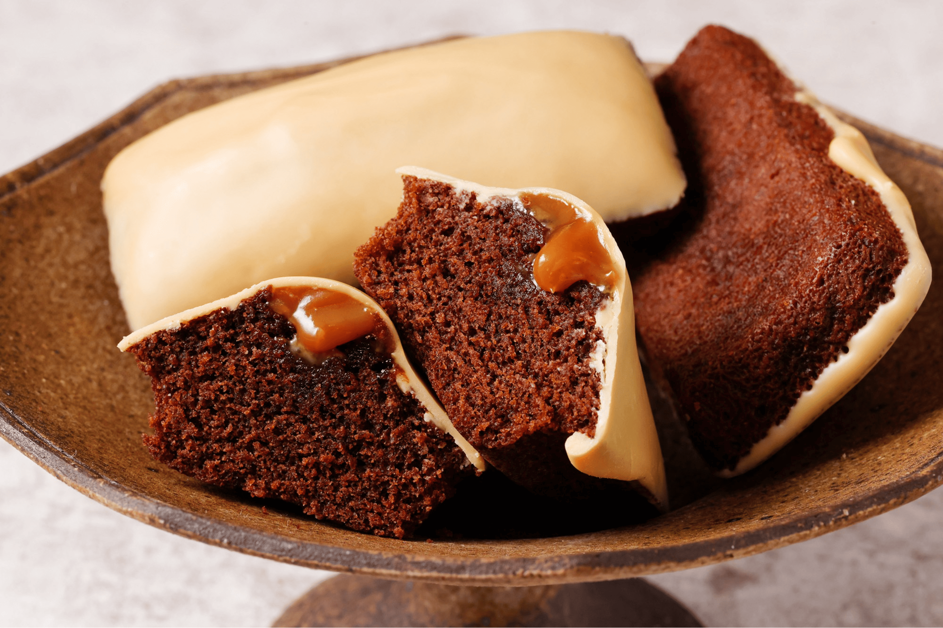 表面には、ブロンドチョコレートとホワイトチョコレートのミルク分をじっくり焦がして仕上げたチョコレートを使用。