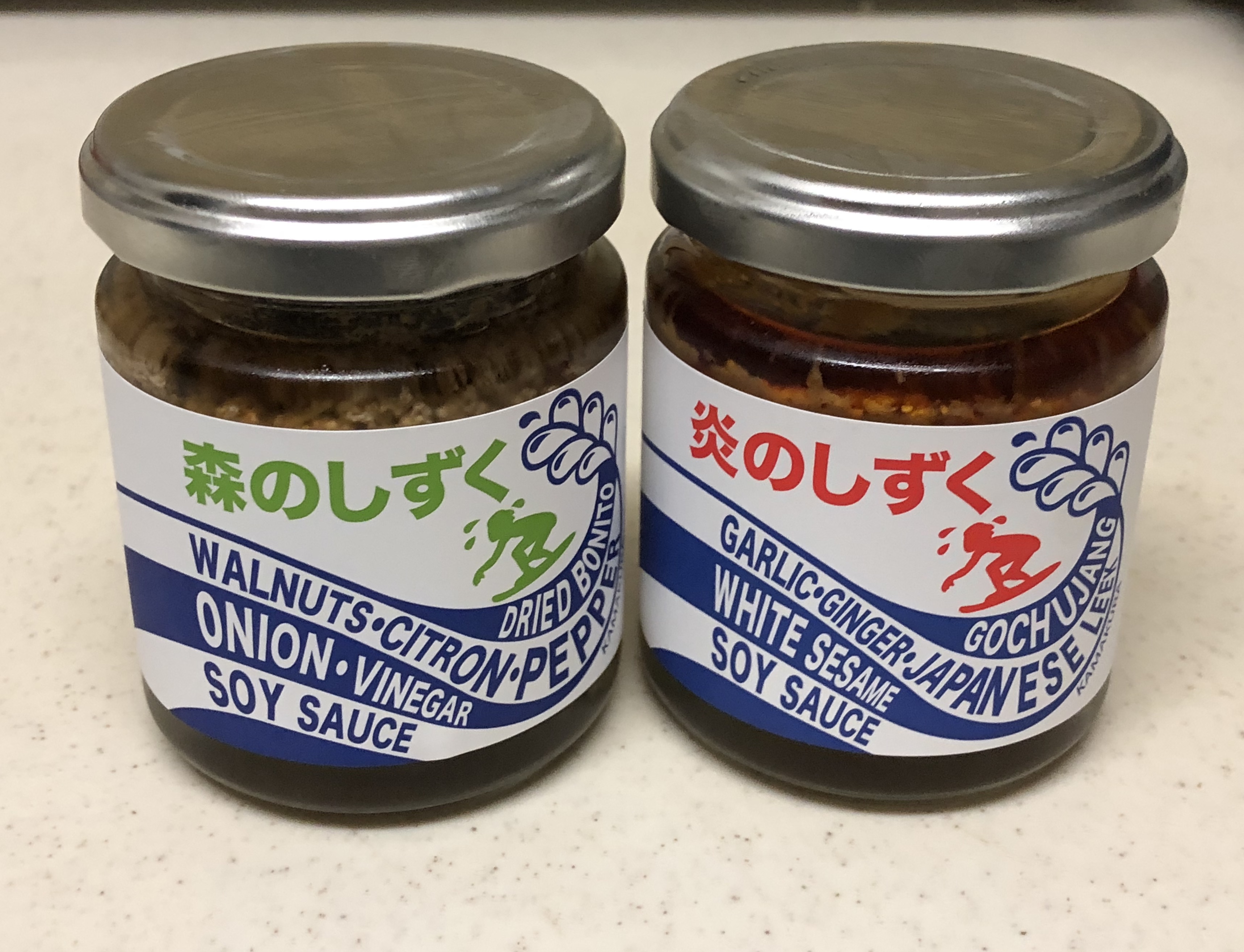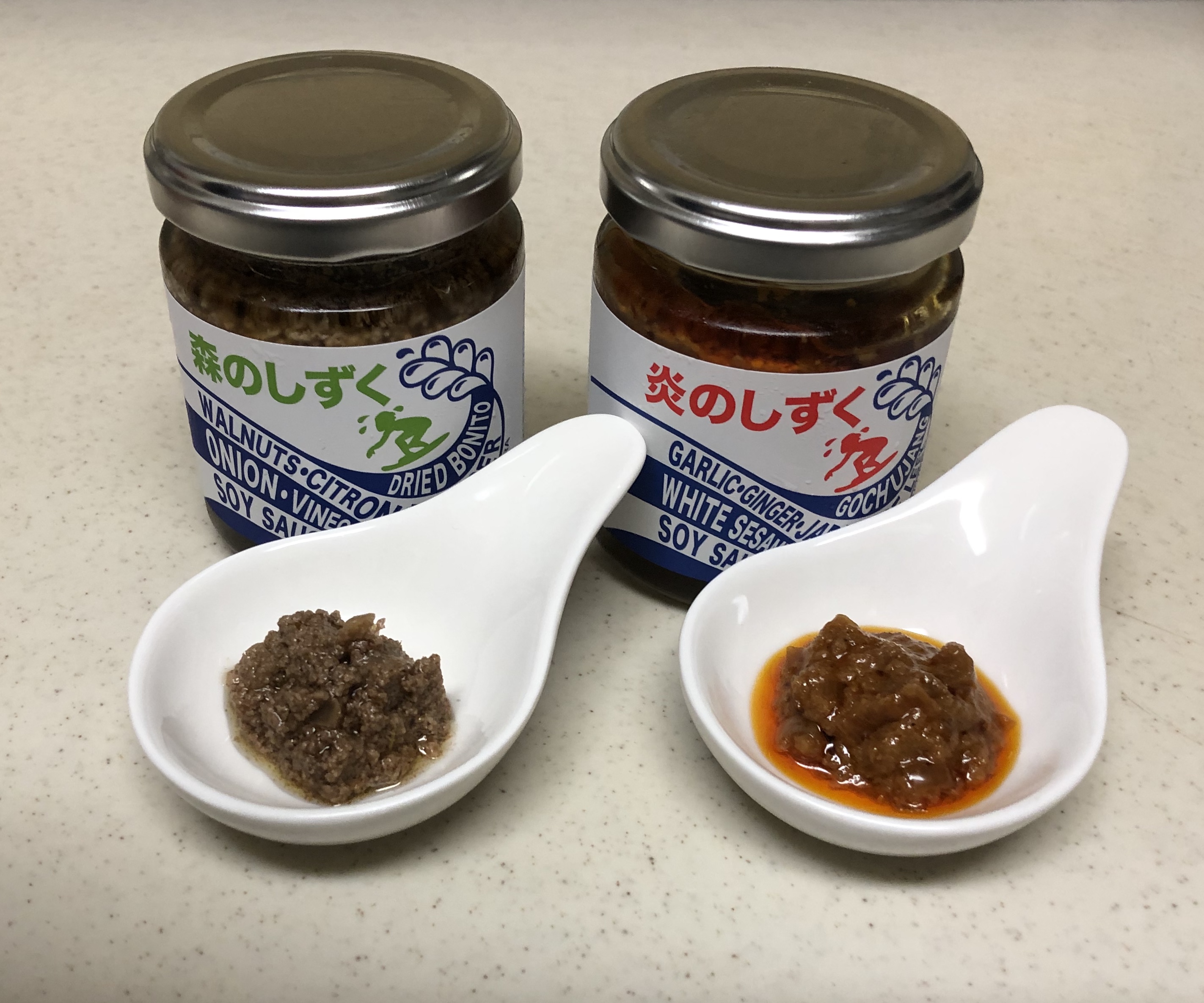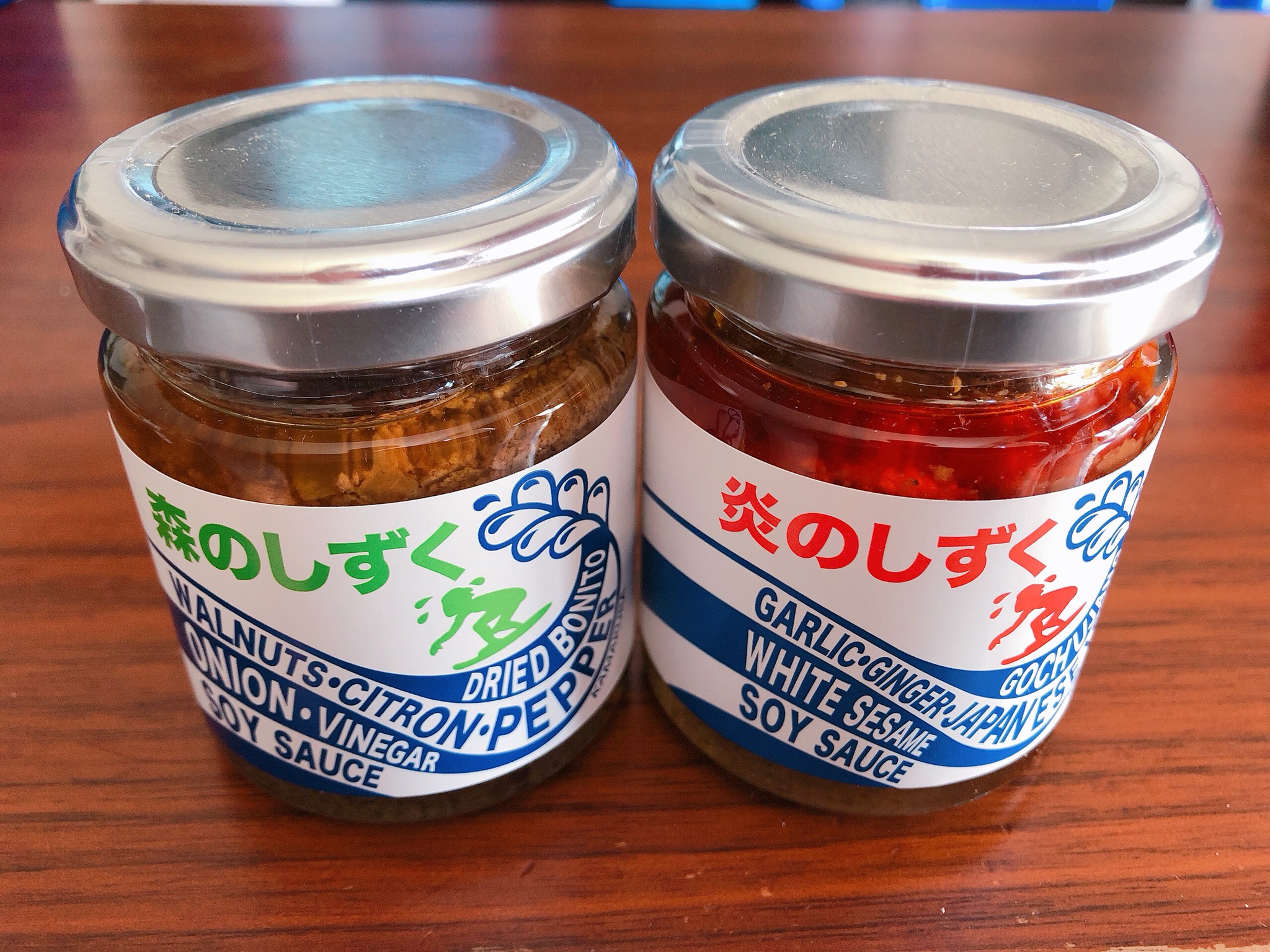 オリジナル調味料のピリ辛ダレの「炎のしずく」とくるみベースのおかずタレ「森のしずく」です。「炎のしずく」はニンニク、生姜、ネギとたっぷりのゴマに、コチュジャンをベースにしたピリ辛ダレ。しゃぶしゃぶや鍋にはもちろんのこと、ご飯やうどん、豆腐や茹で豚などにはよく合います。蒸し野菜や焼き野菜のトッピングにもおすすめ。「森のしずく」は、くるみをベースに鰹節で旨味を加え、柚子胡椒でスッキリした味わい。豆腐やごはんのトッピングやおにぎりの具などごはんのお供として大活躍。どちらも無添加なので安心して楽しめます。
