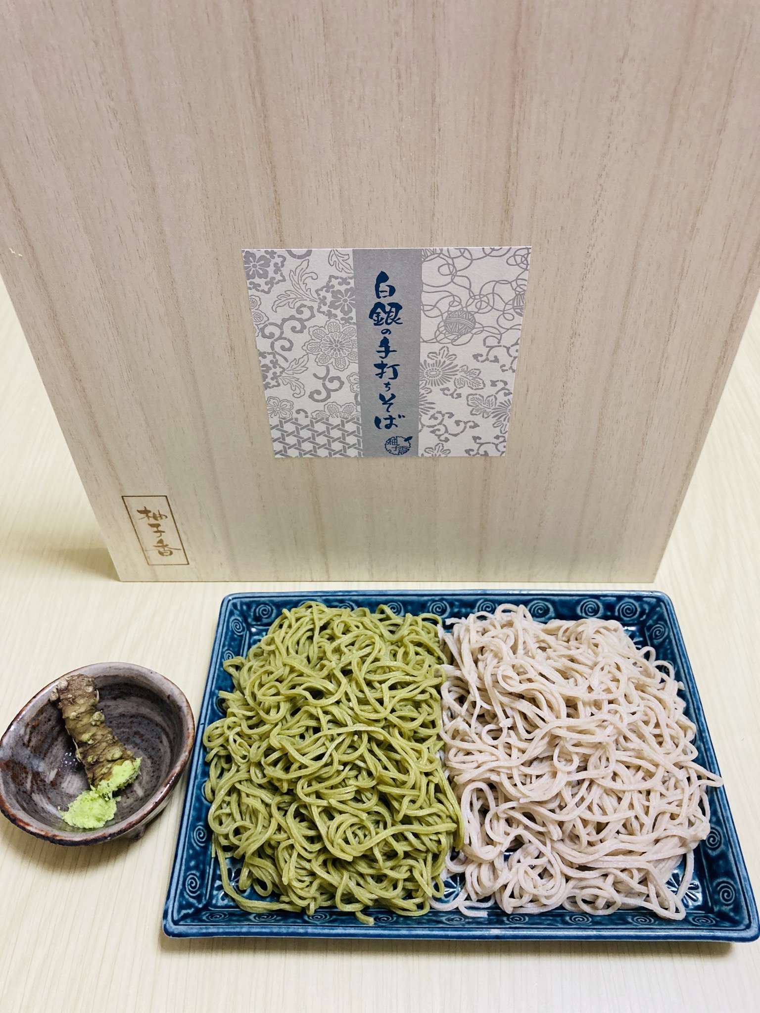 中には綺麗な和紙に包まれた二八蕎麦と抹茶の二八蕎麦(各2人前)、蕎麦つゆ(2本)、安曇野産生わさび。