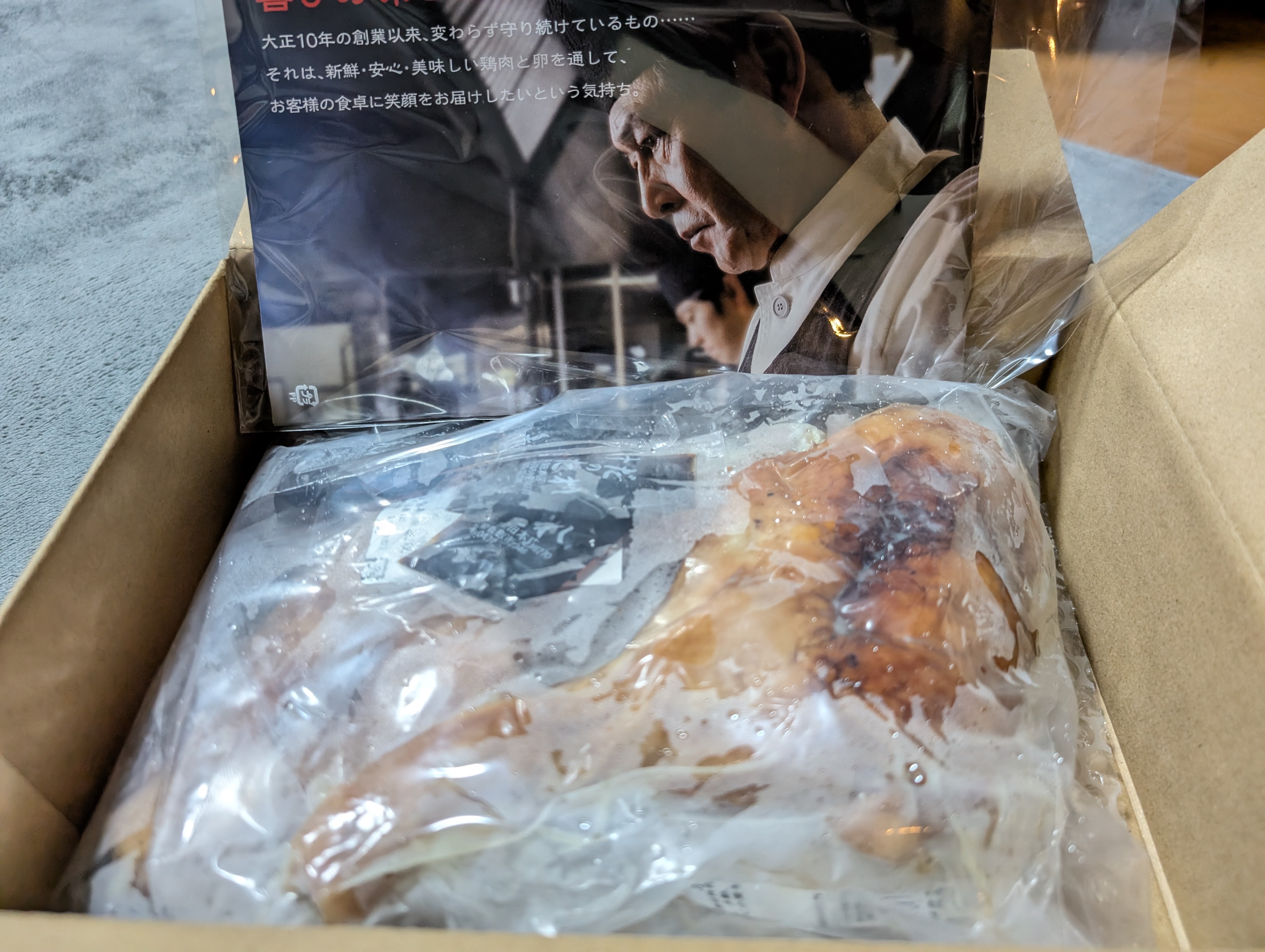 指定日指定時間に冷蔵便で届き、箱を開けるとシンプルにお店の案内や商品説明が入った袋が一つと真空パックされた大きな鶏が3本詰められていました。