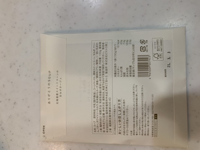 まずは北海道産スイートコーンの甘みポタージュ(ありがとうのSOUP)から!
