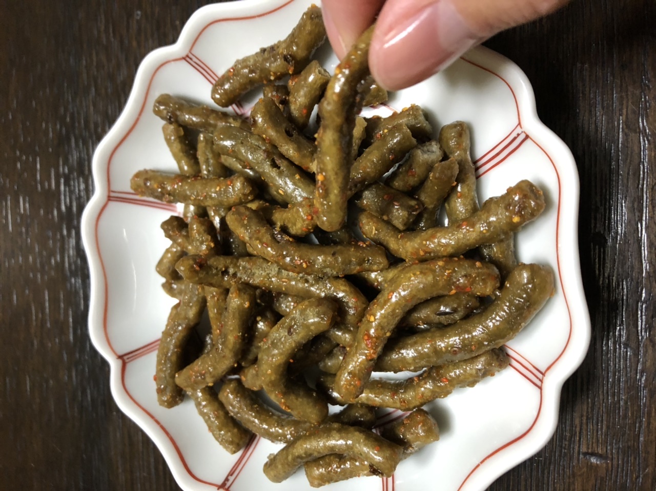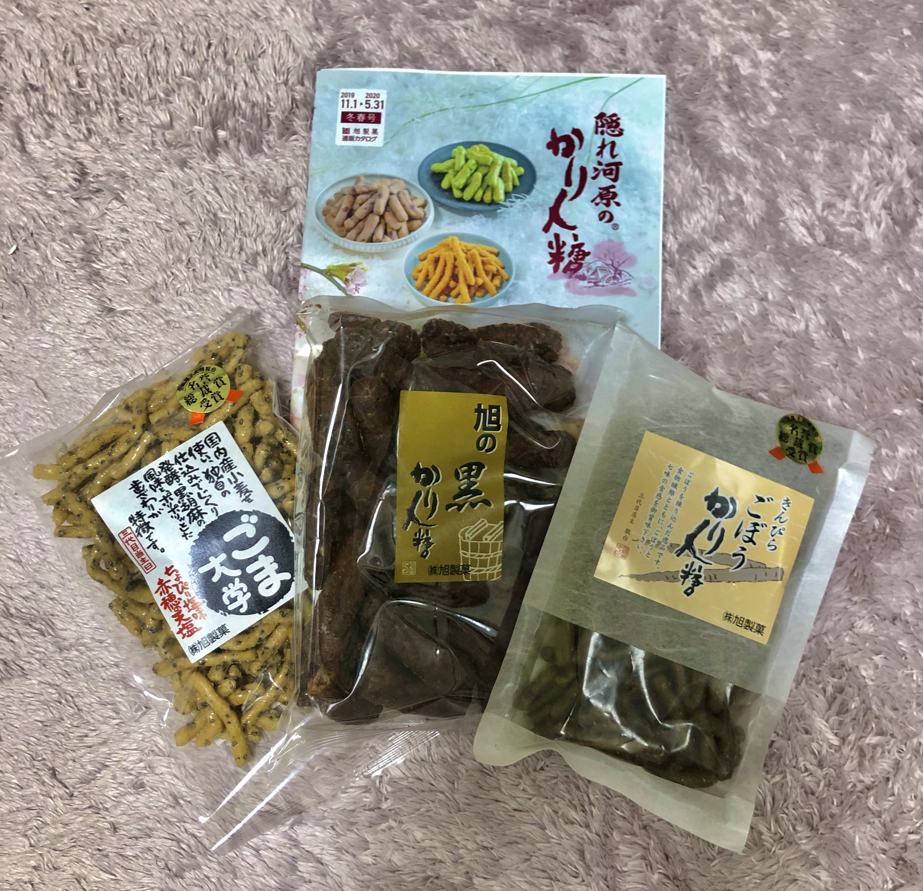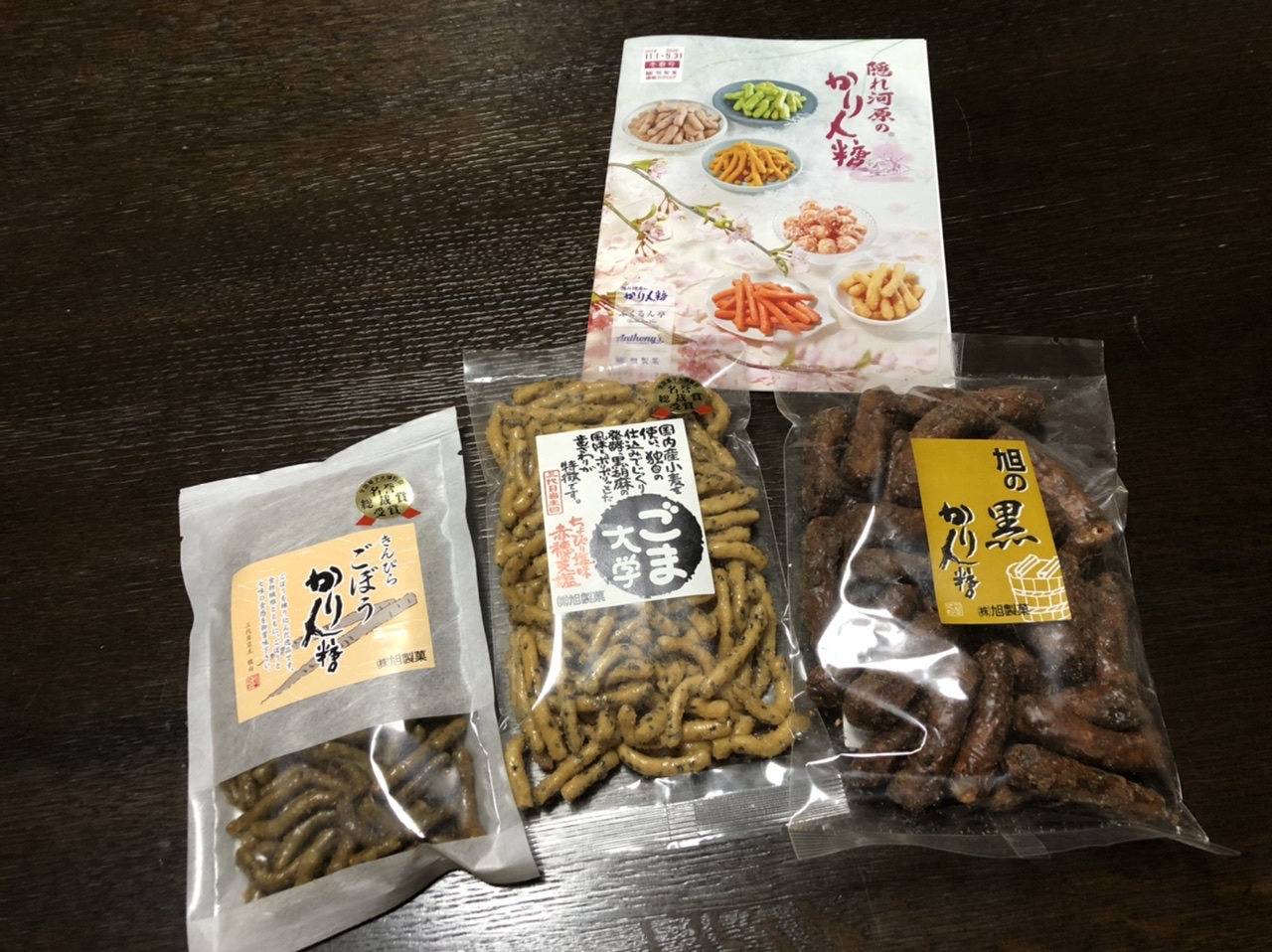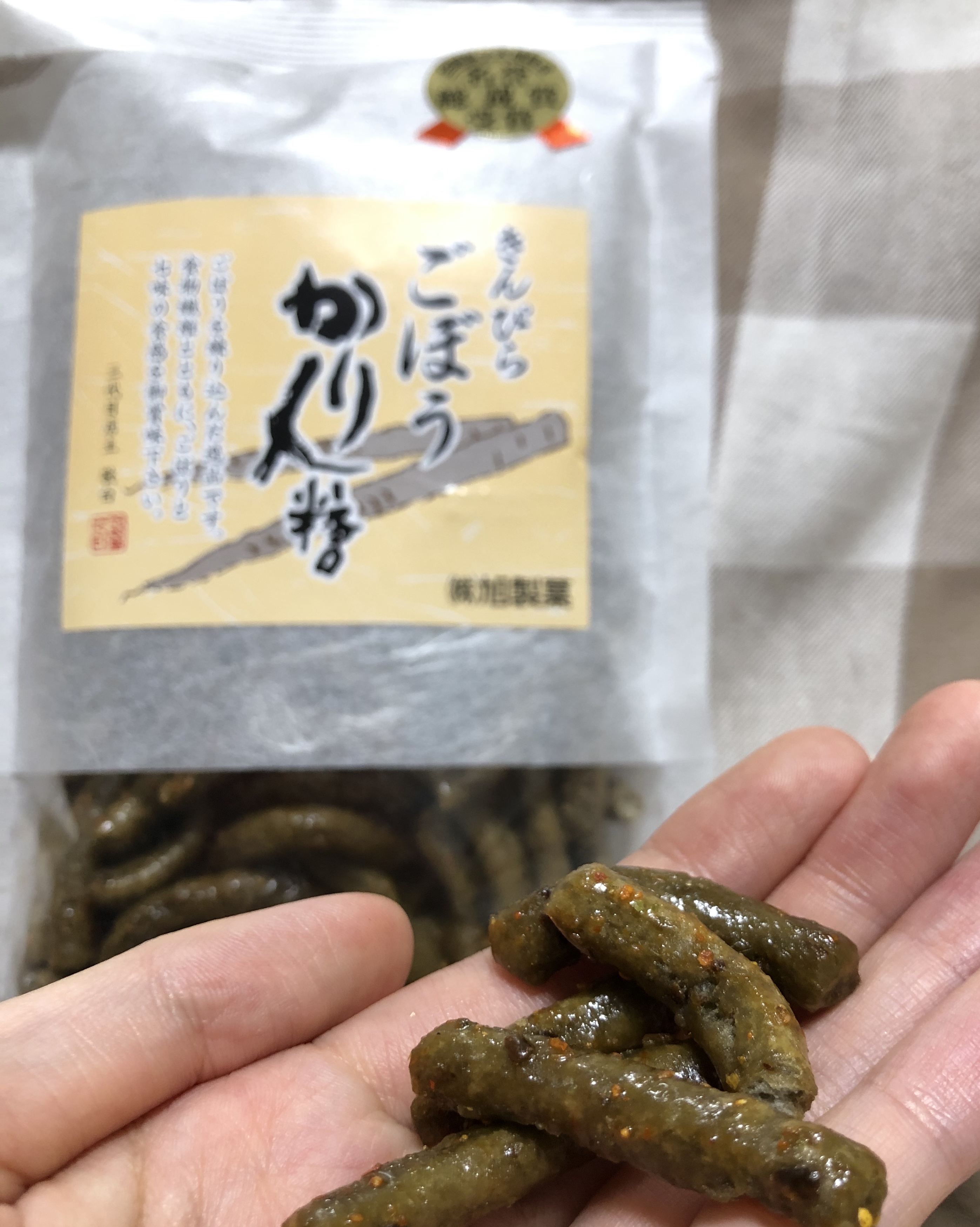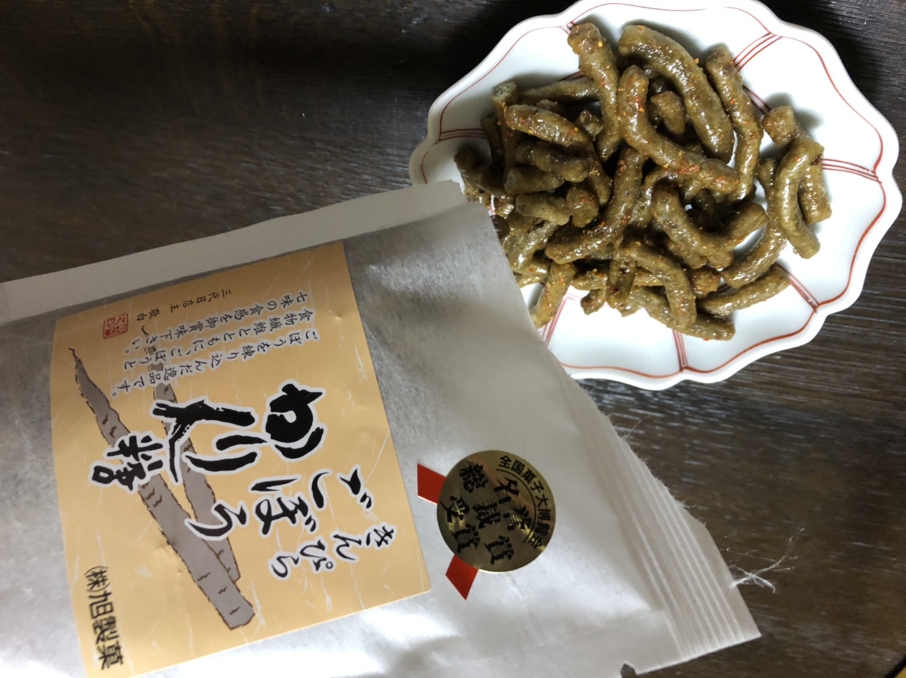 きんぴらごぼうかりん糖:ほかのかりんとうとはまた別のおいしさツイッター。ごぼうの香りが良くします。ごぼうのかりんとうは初めてでしたが、クセが強くなくて食べやすかったです。まわりについた七味がぐっと味を整えていてとても好みのあじでした。甘さと辛さ、マッチしていました。