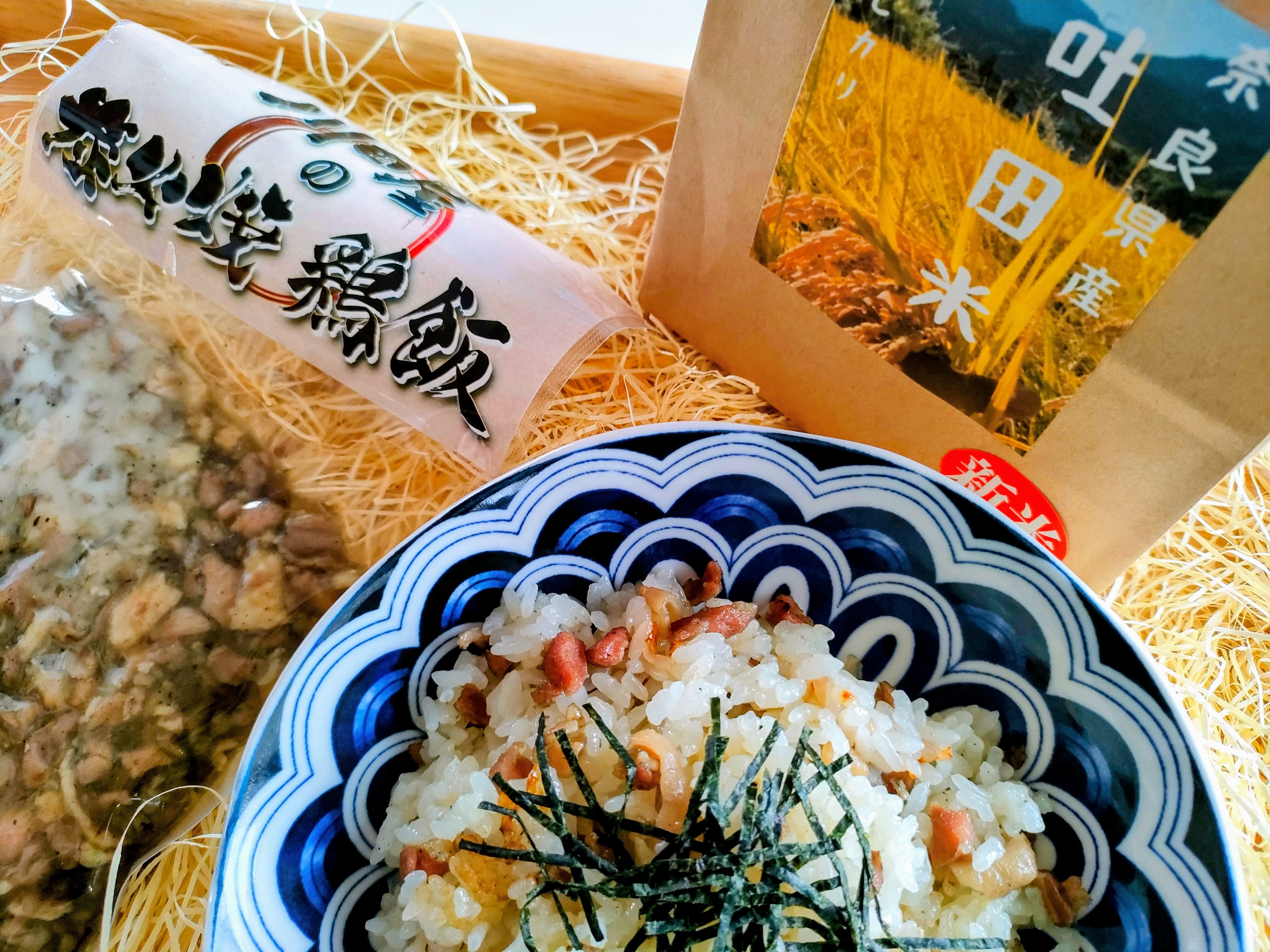 奄美大島の郷土料理「鶏飯」が手軽に楽しめるセットです。「鶏飯」とは、ほぐした鶏肉や錦糸卵などの具材と薬味をご飯の上にのせ、丸鶏を煮て取ったス-プをかけて食べる料理のこと。メインの鶏肉は、鹿児島知覧産さつま知覧鶏の「種鶏」のみを厳選して使用。弾力のある歯ごたえと、噛めば噛むほどに溢れる旨味が特長です。鶏肉の旨みと香りを増幅させるため、職人が丁寧に炭焼きしてます。特製昆布エキスに漬け込むことで、九州郷土料理ならではの、ガツンとくる旨さを十分に堪能できます。米は、最も鶏飯に合う「奈良県吐田米」をセレクト。鶏肉、米、鶏、刻み海苔がセットになり、風呂敷に包まれた状態で届くので、ギフトにもおすすめです。