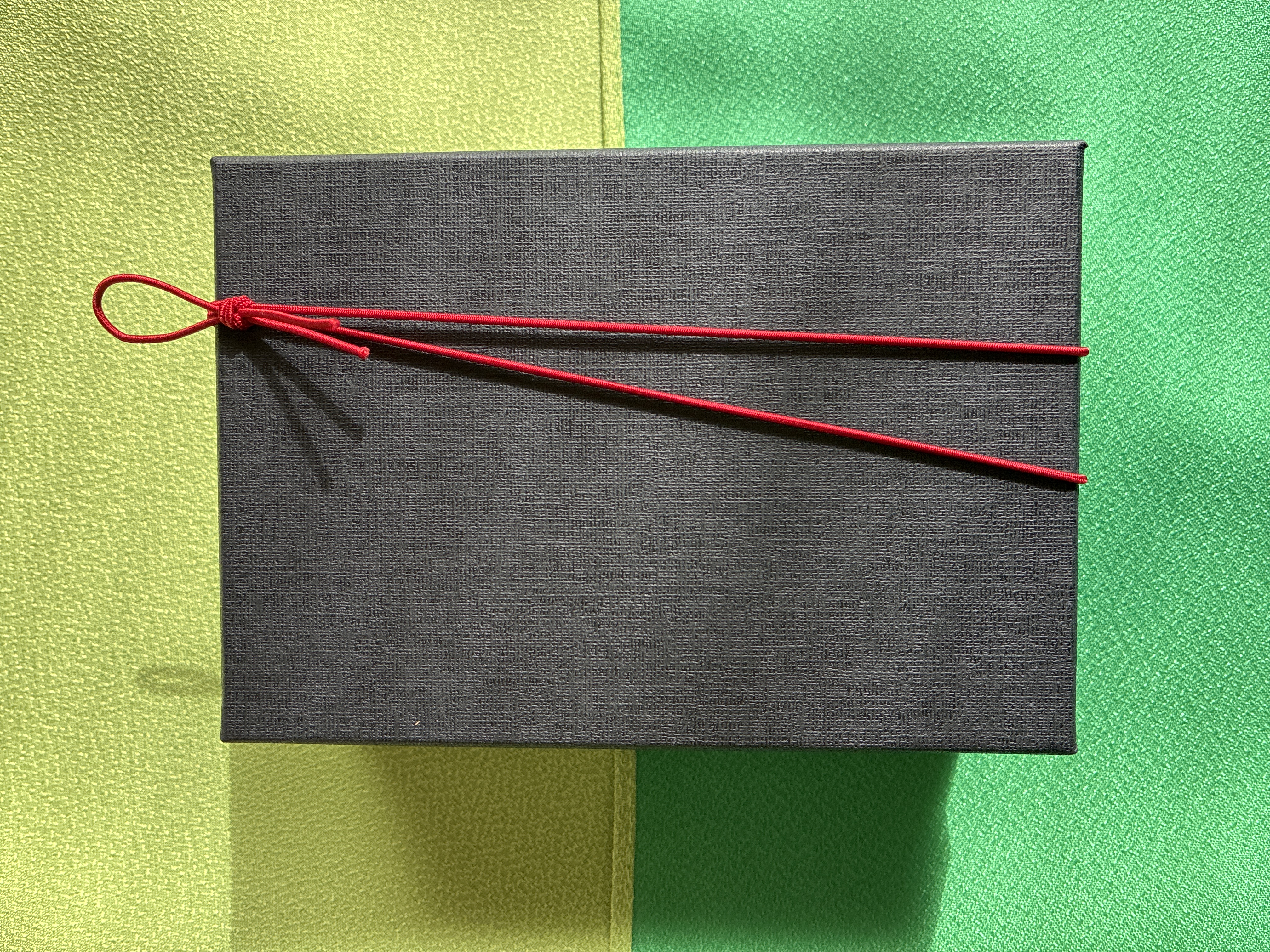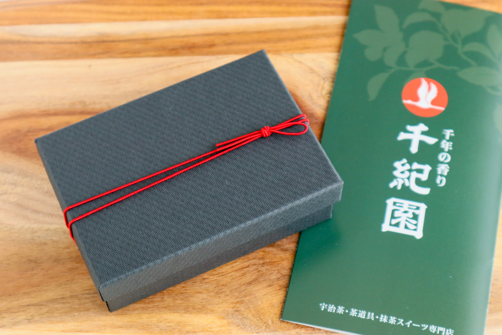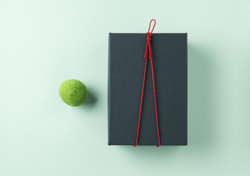 黒の箱に赤の紐をかけたすっきりとしたスタイリッシュなパッケージは、お茶席で黒楽のお茶碗から濃茶をいただくイメージから作りました。