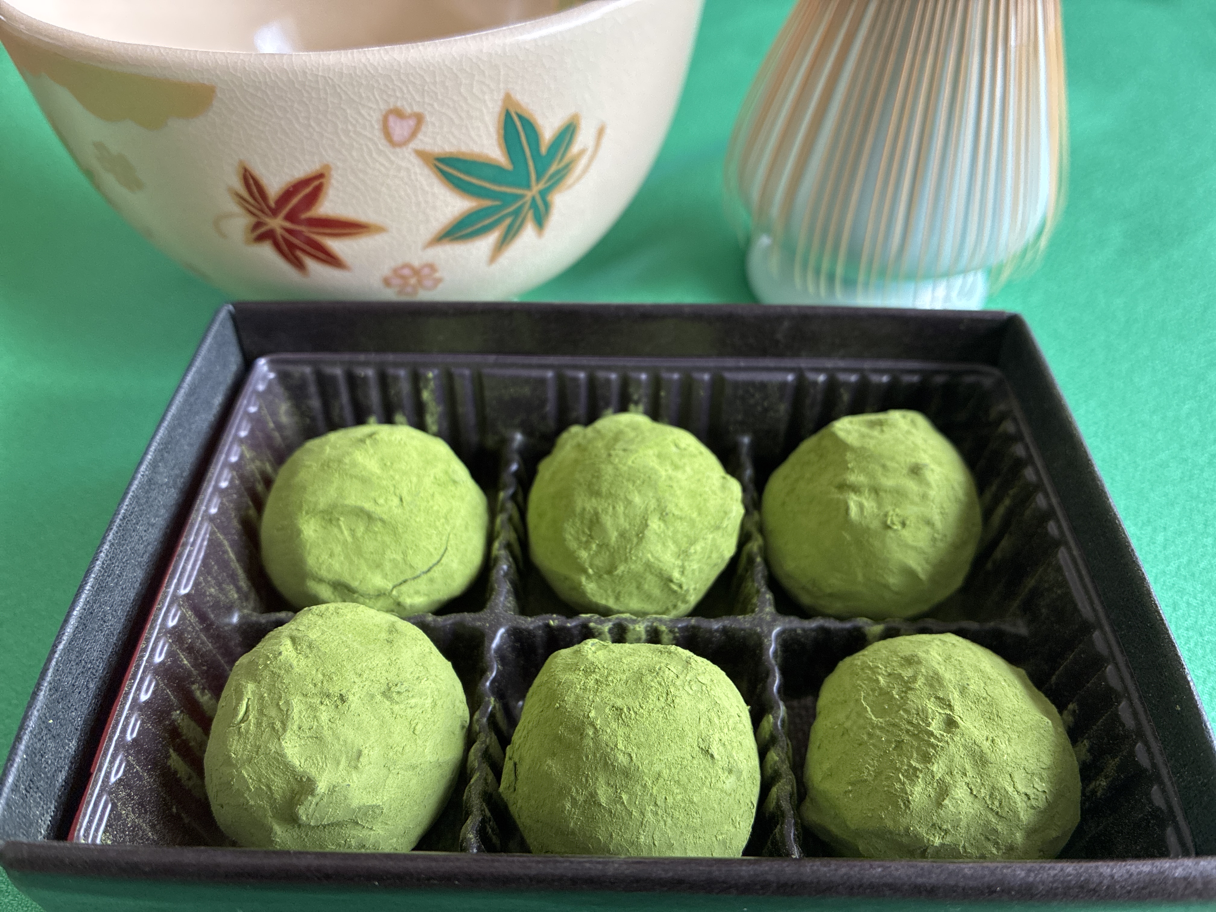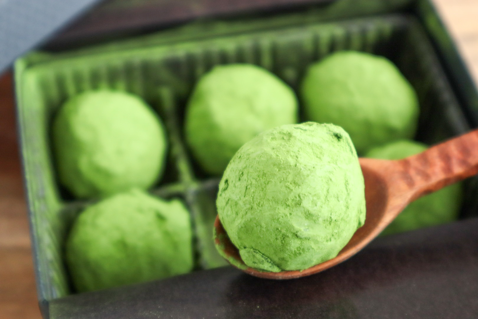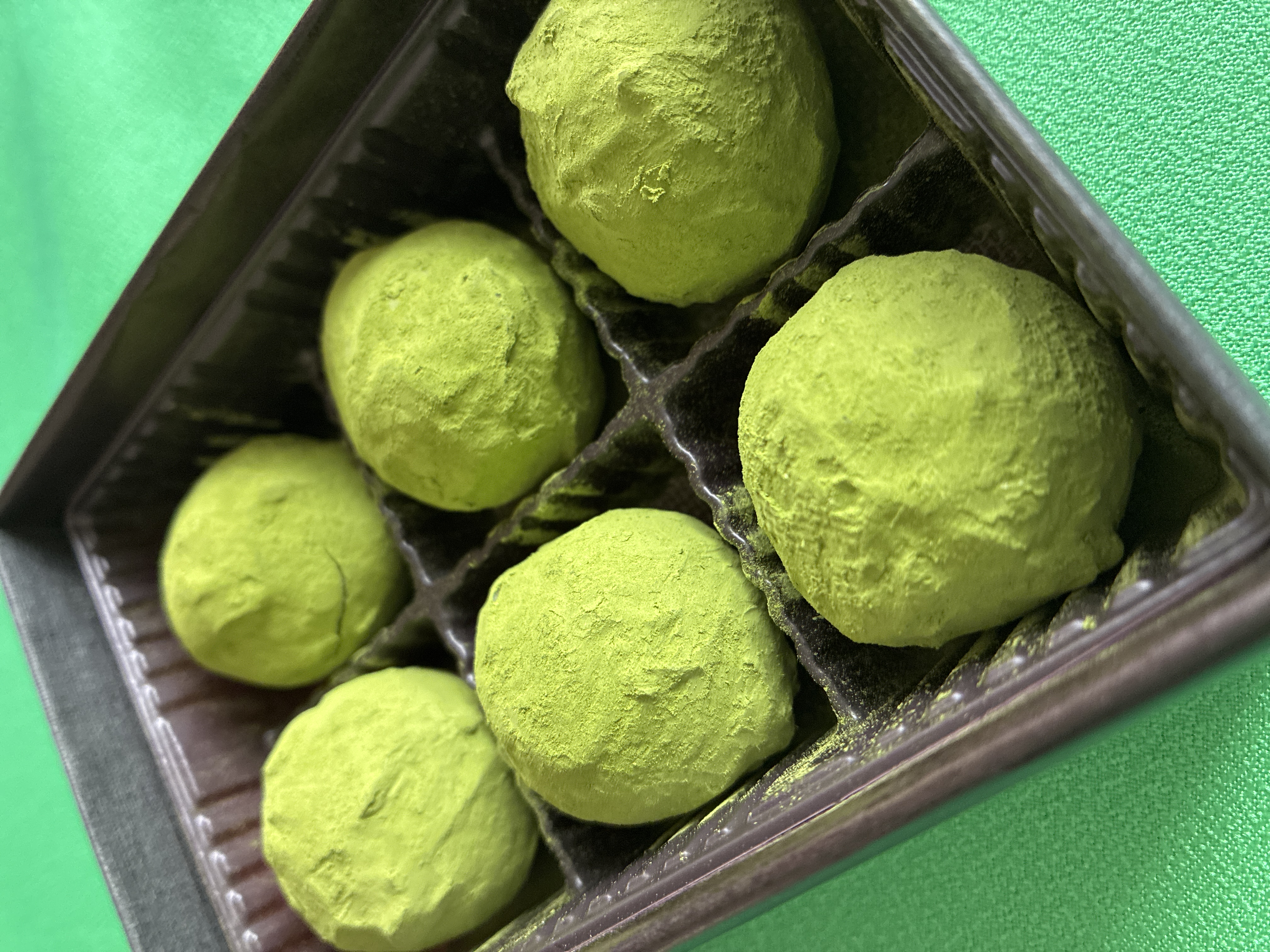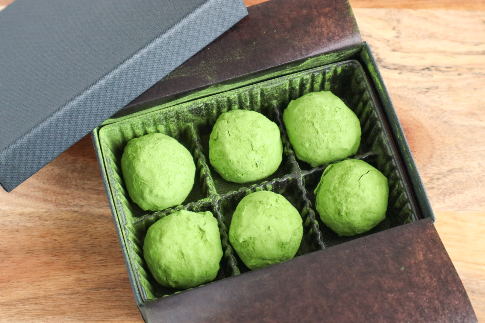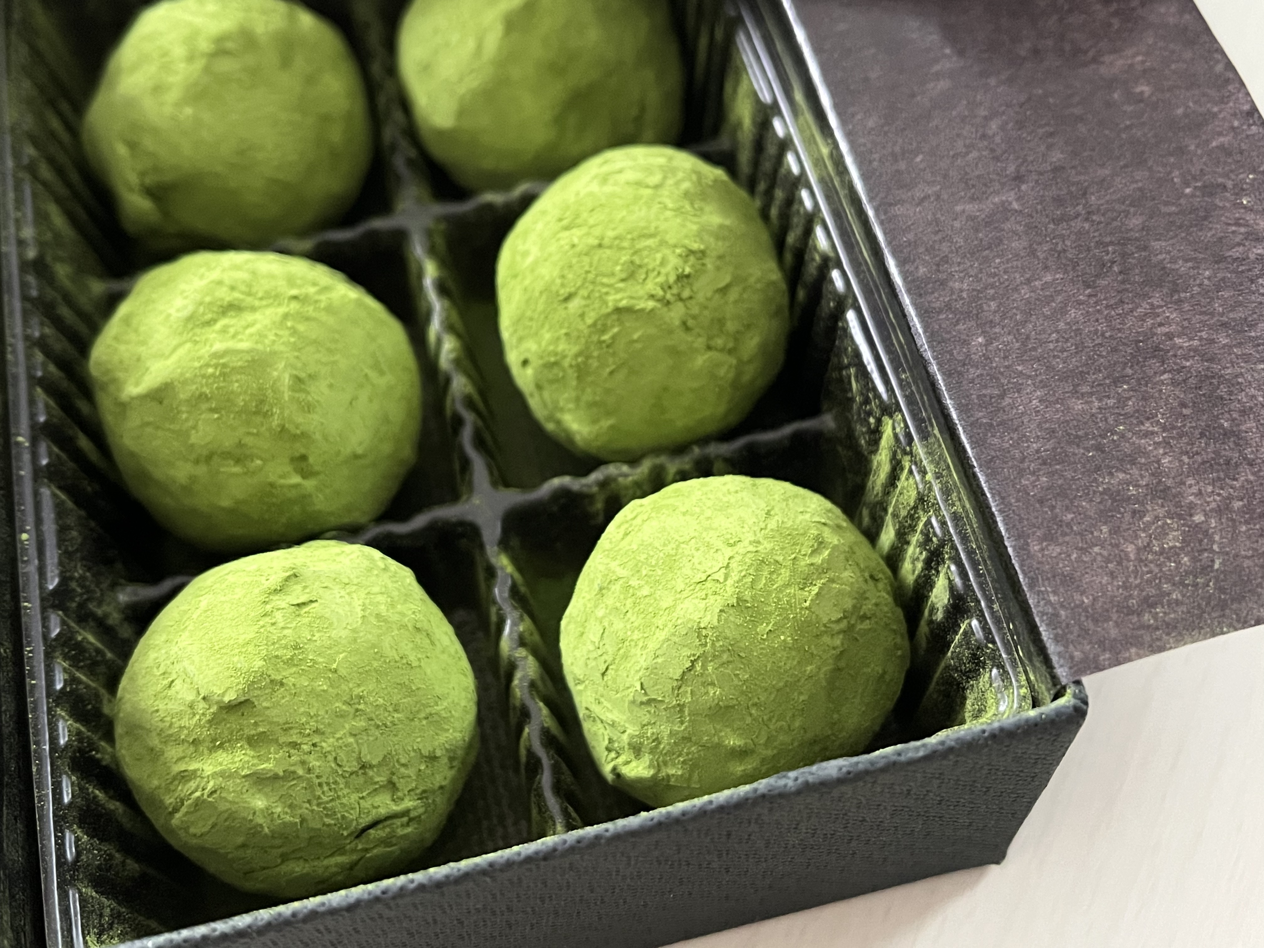 ゆっくりとその黒い箱を開けると、抹茶トリュフの鮮やかな緑が飛び込んできます。
