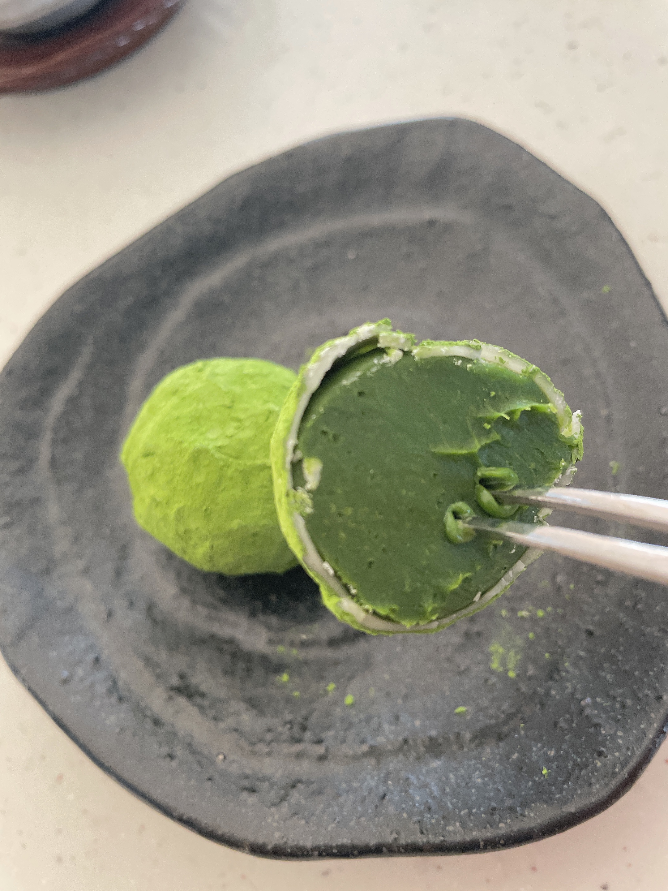 外側の抹茶パウダーと中の抹茶チョコレートの2種類の苦味が、中間のホワイトチョコレートの優しい甘さでマイルドに調和されているなと思いました。一粒を2〜3口で丁寧に味わいながらゆっくりとティータイムを楽しむ一品だと感じました。