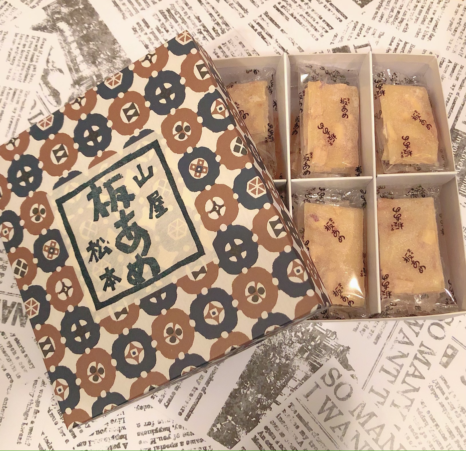 長野県の老舗飴屋で作られる伝統的な「飴菓子」です。高温で煮詰めた米飴にピーナッツを混ぜ合わせ、限界まで薄く伸ばして板状に仕上げいます。まるでせんべいのようなパリパリとした食感と香ばしさが特徴。レトロな民芸調のデザインが人気の折り詰めなので、お土産、贈答用、引き物にピッタリです。