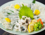 下関のふぐは伝統的に熟成させて食されます。弊社でもふぐの刺身は丁寧に3枚卸しをして、薄皮をとり、さらしに巻いて、余計な水分を取り除きます。その際に、ふぐは熟成されて、旨味が増加されます。ふぐは、熟成されても身が柔らかくなりにくく、歯ごたえが損なわれません。刺身に1番良い時を見計らって、皿が透けるように薄く、しかしふぐの旨味が充分に感じられる厚さに仕上げています。ぜひ天然のトラフグをご賞味ください。