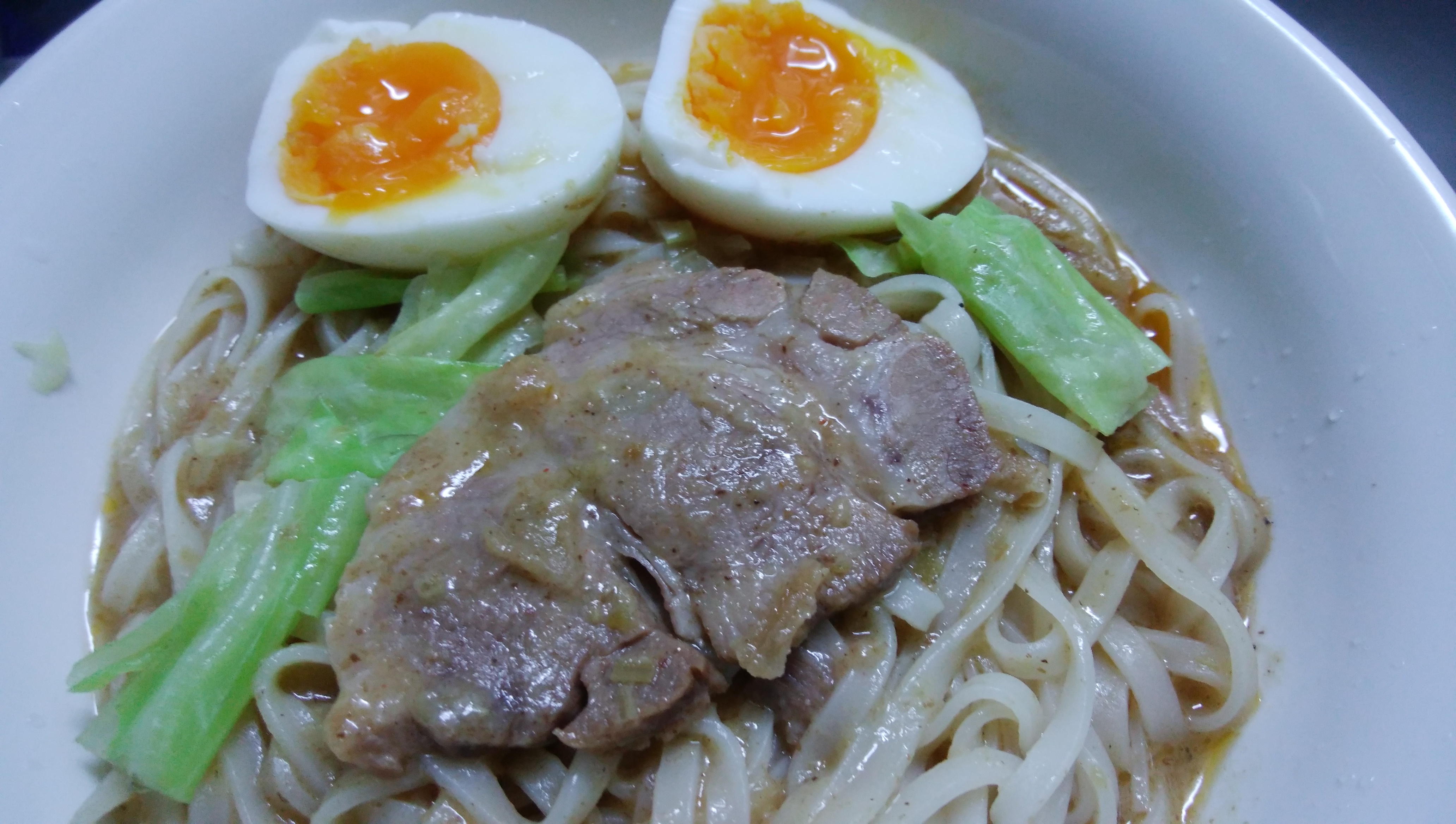 もやし、ねぎ、玉葱、しめじ、茄子、ゆで卵をトッピング