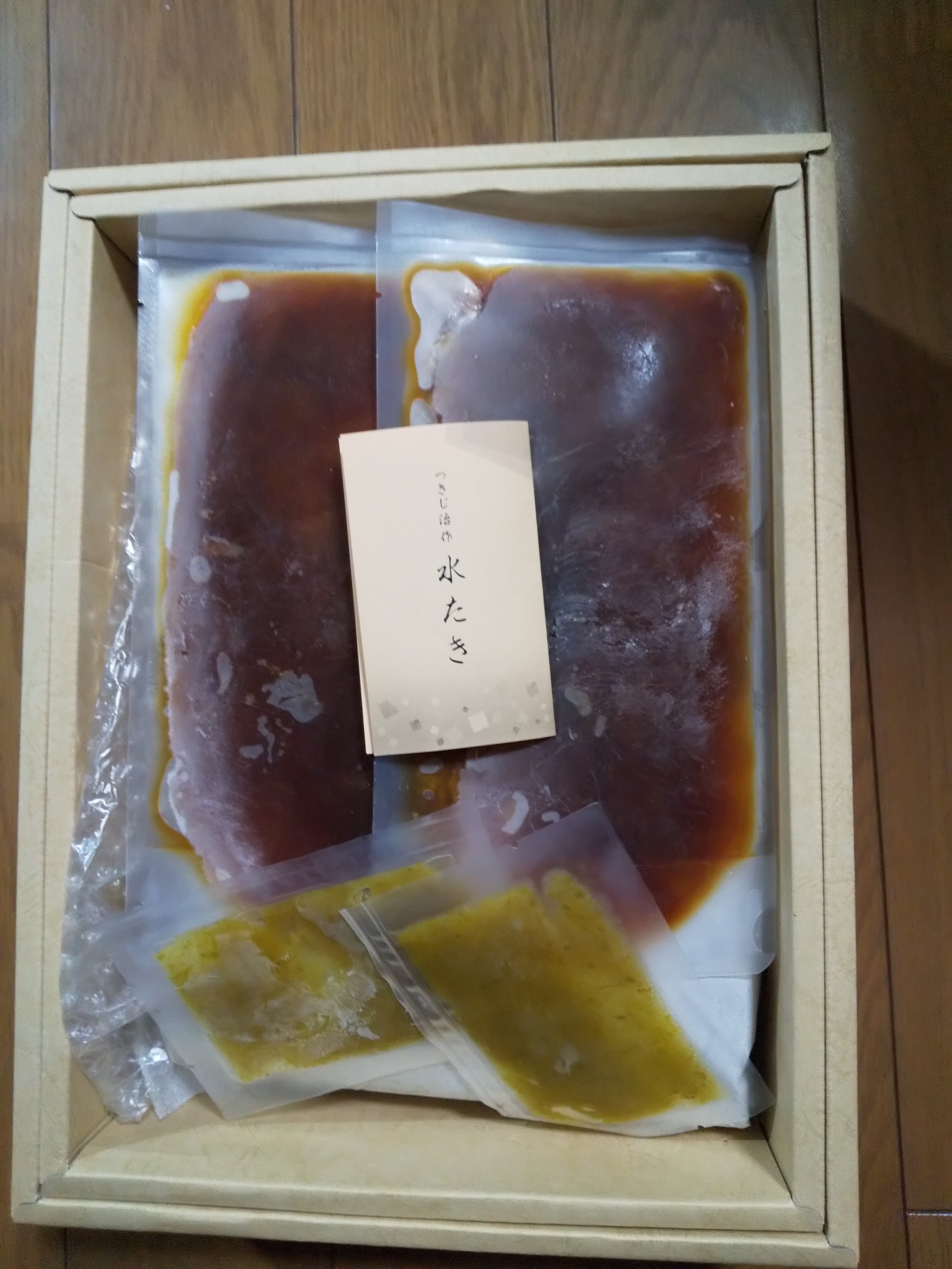 ワクワクドキドキしながら開封しました。冷凍されているとはいえすごい重さの塊が二つ。柚子胡椒やポン酢が一つの塊に一つづ付いていました。