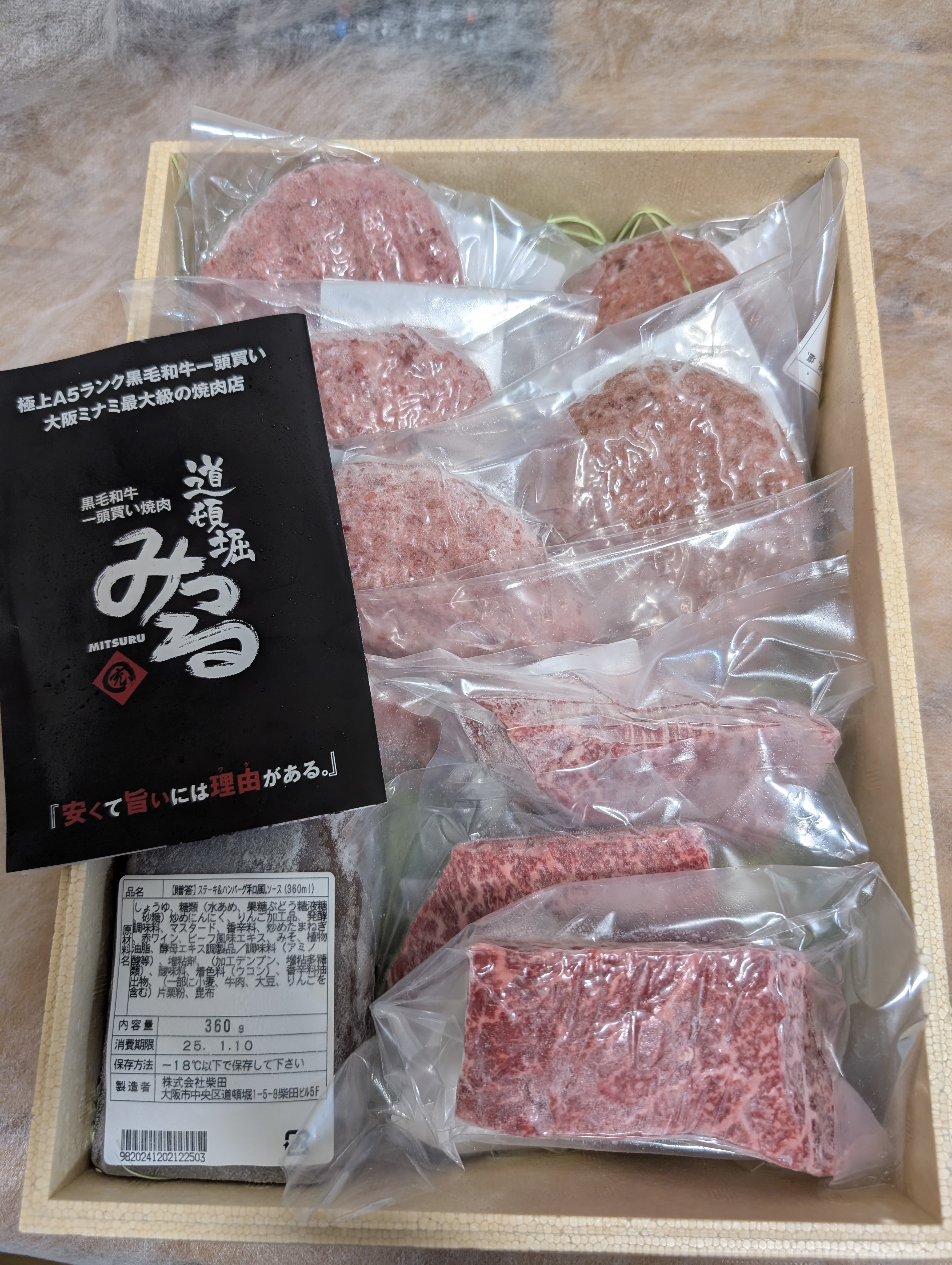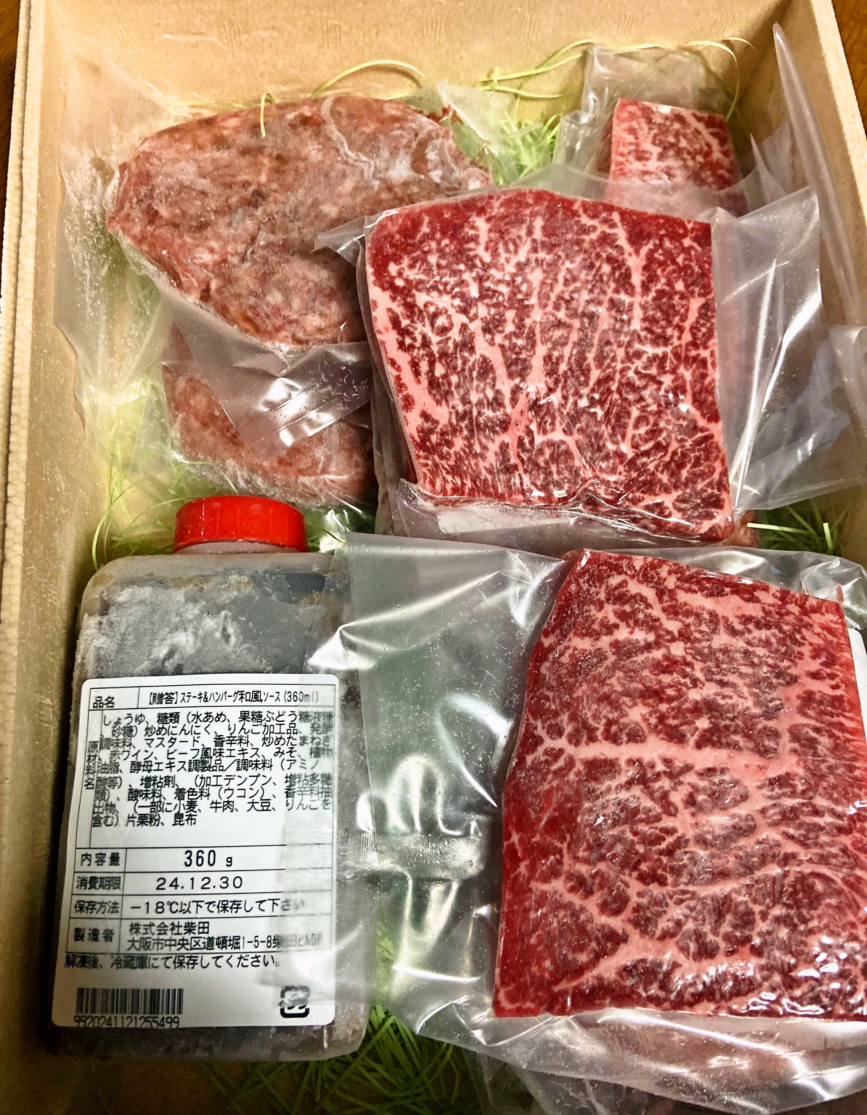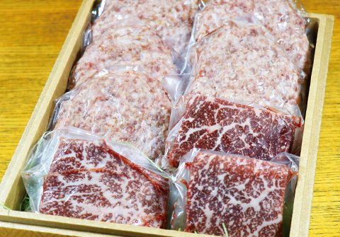 A5黒毛和牛100%のハンバーグ5枚とA5黒毛和牛赤身ステーキ3枚の合計約1kgのセットです。