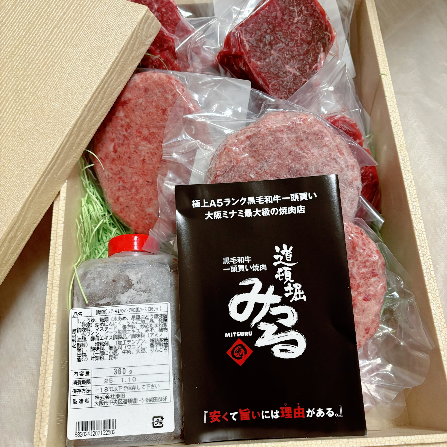 大阪道頓堀にある焼肉屋の「A5黒毛和牛の赤身ステーキとハンバーグ」セットです。A5黒毛和牛をふんだんに使った自家製ハンバーグ。肉汁溢れる大判サイズ(約150g)なので、食べ応えも十分。付属の自家製和風にんにくソースとの相性抜群です。約100gの程よいサイスの「赤身ステーキ肉」。A5ランクの黒毛和牛の甘みと旨味を十分に堪能できるので、塩と胡椒で楽しむのがおすすめです。贈答用のボックスに入り、風呂敷に包まれて届くので贈り物にもぴったりです。