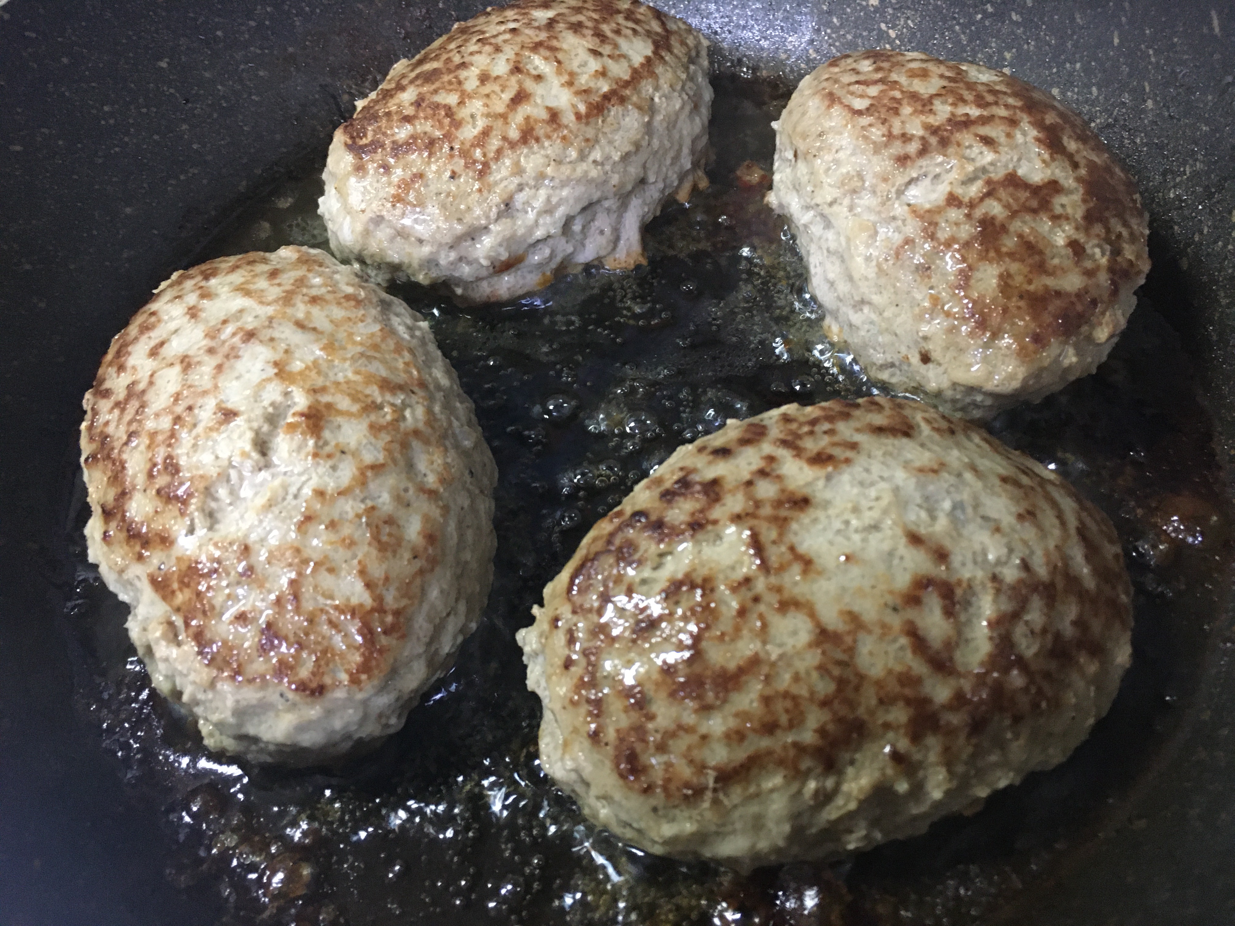 さらに、このハンバーグは焼き割れを防ぐ為に「手ごね」にもこだわり、一つ一つが人の手(しっかり衛生的にビニール手袋を装着)で丸められているとの事。早速解凍し、フライパンで焼いてみると、とても柔らかく、裏表をひっくり返す際は崩れないようにと細心の注意を払いました。