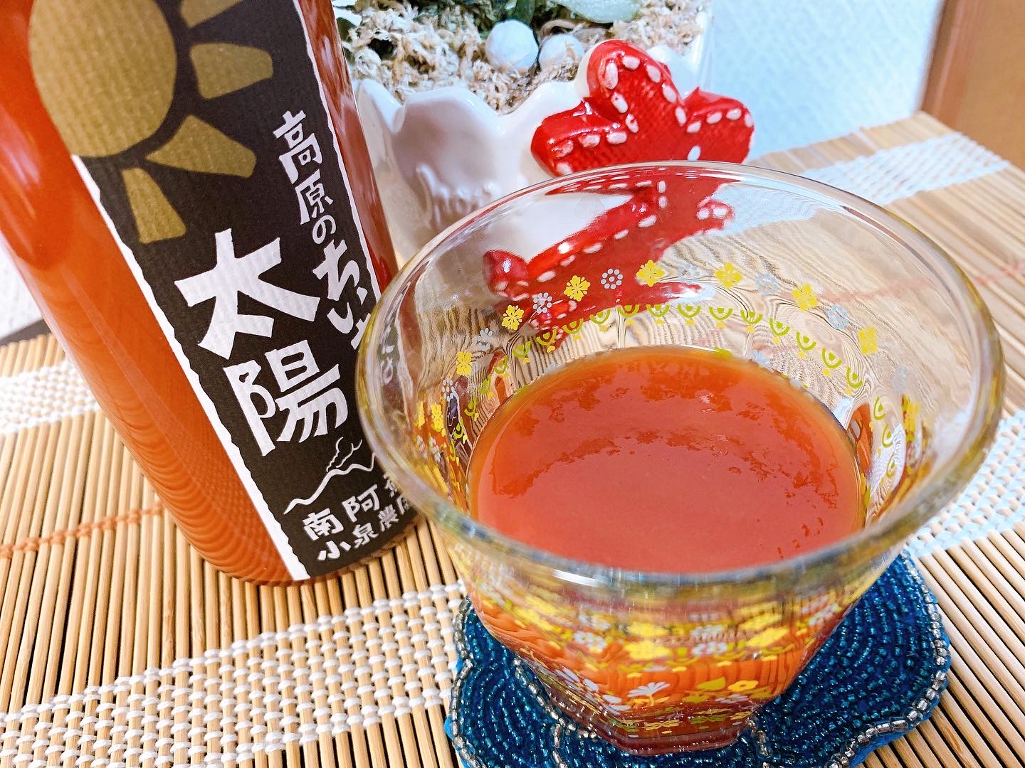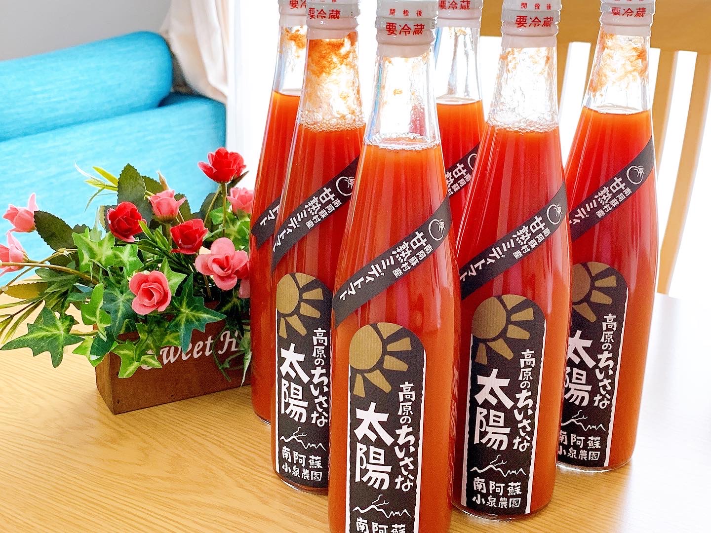 阿蘇高原のススキや野草、落ち葉から作った自家製の堆肥を使い、除草も手で一つ一つ丁寧に抜いて育てた極上の樹上甘熟ミディトマトを使用されているそうです。トマトの真っ赤な色彩が見た目にも楽しいです。軽く冷やしていただくと、まず甘みがたっぷりあることに驚きました。これでお砂糖を使っていないだなんて驚きです!!そしてすっきりとしたコクがあり、まるで高級フルーツジュースのようにとっても美味しくいただけました。トマト独特の癖があるトマトジュースもありますが、こちらのトマトジュースは癖がなく、飲みやすくて驚きました。
