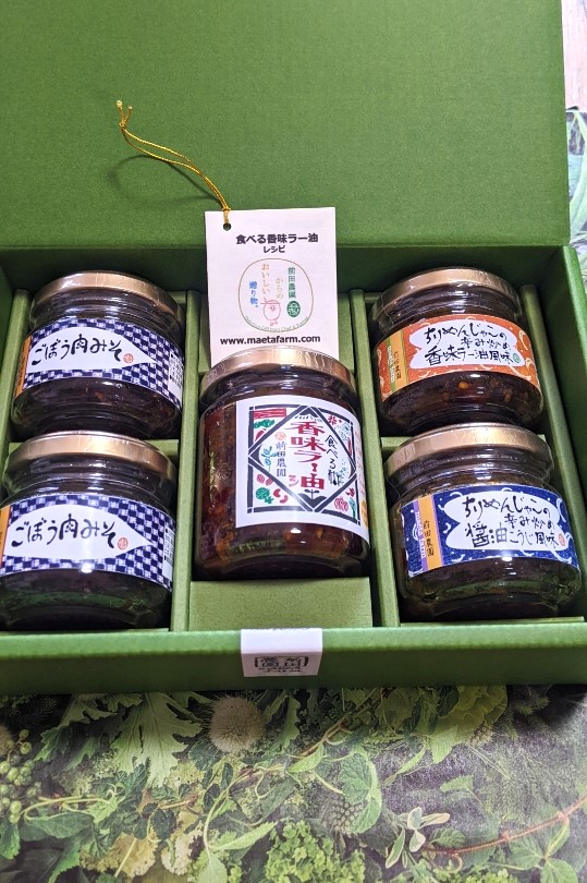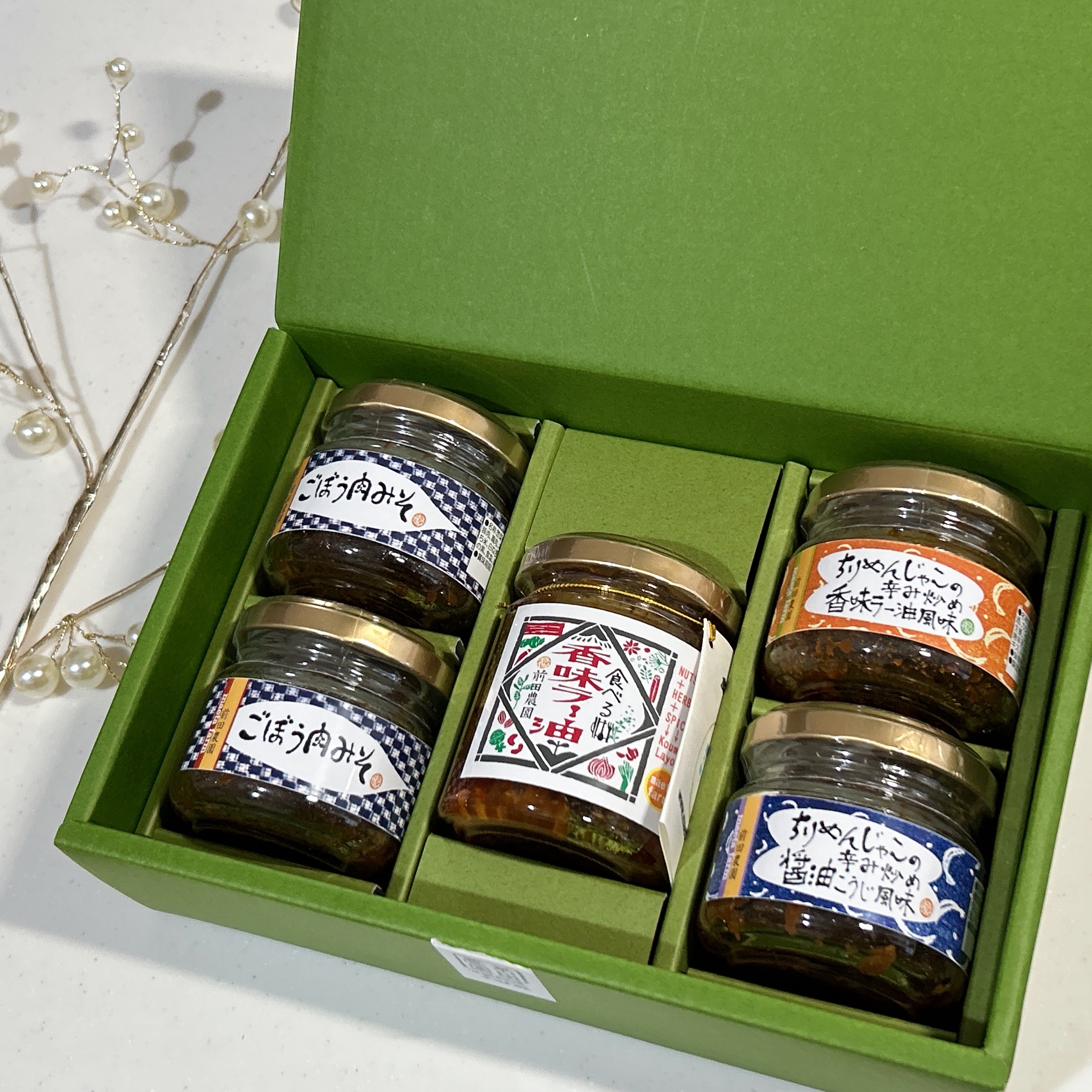 メディアで人気の「ごぼう肉みそ」を含んだ「ご飯のお供4種セット」です。砂丘ごぼうをたっぷり使用し、八丁味噌など4種の厳選味噌をブレンドした「ごぼう肉みそ」。ネギや、ニンニクなどの香味野菜に加え、ナッツやハーブ、スパイスを数種使用することで、スパイシーなのにまろやかで豊かな香りが広がる味わいを実現した「食べる香味ラー油」。その他、ちりめんじゃこを使用した「ちりめんじゃこの辛み炒め香味ラー油風味」、「ちりめんじゃこの辛み炒め醤油こうじ風味」を含んだ4種セット。ご飯のお供だけでなく調味料としても利用できる便利なアイテム。バリエーション豊富なセットなので、贈り物にもぴったりです。