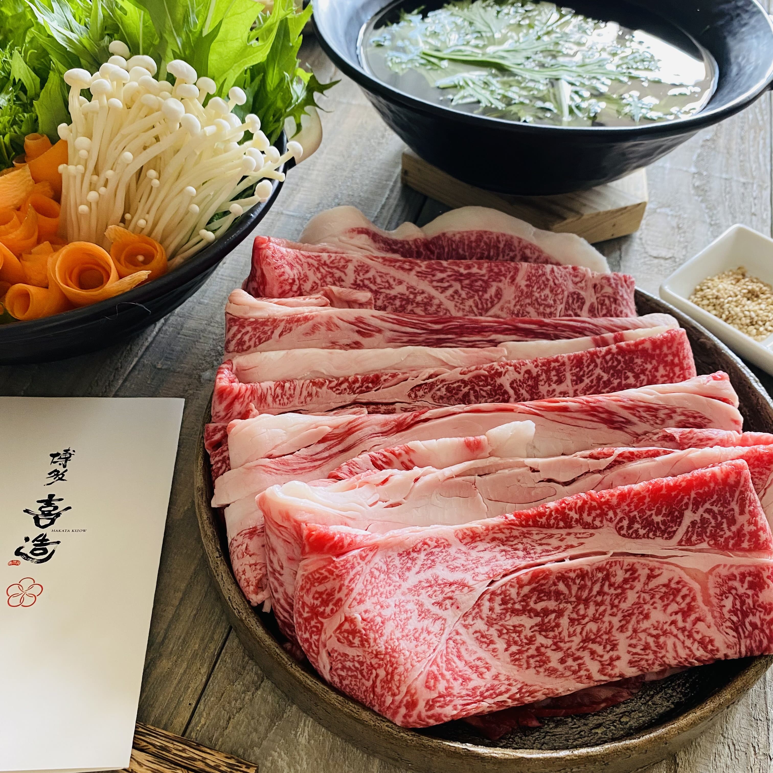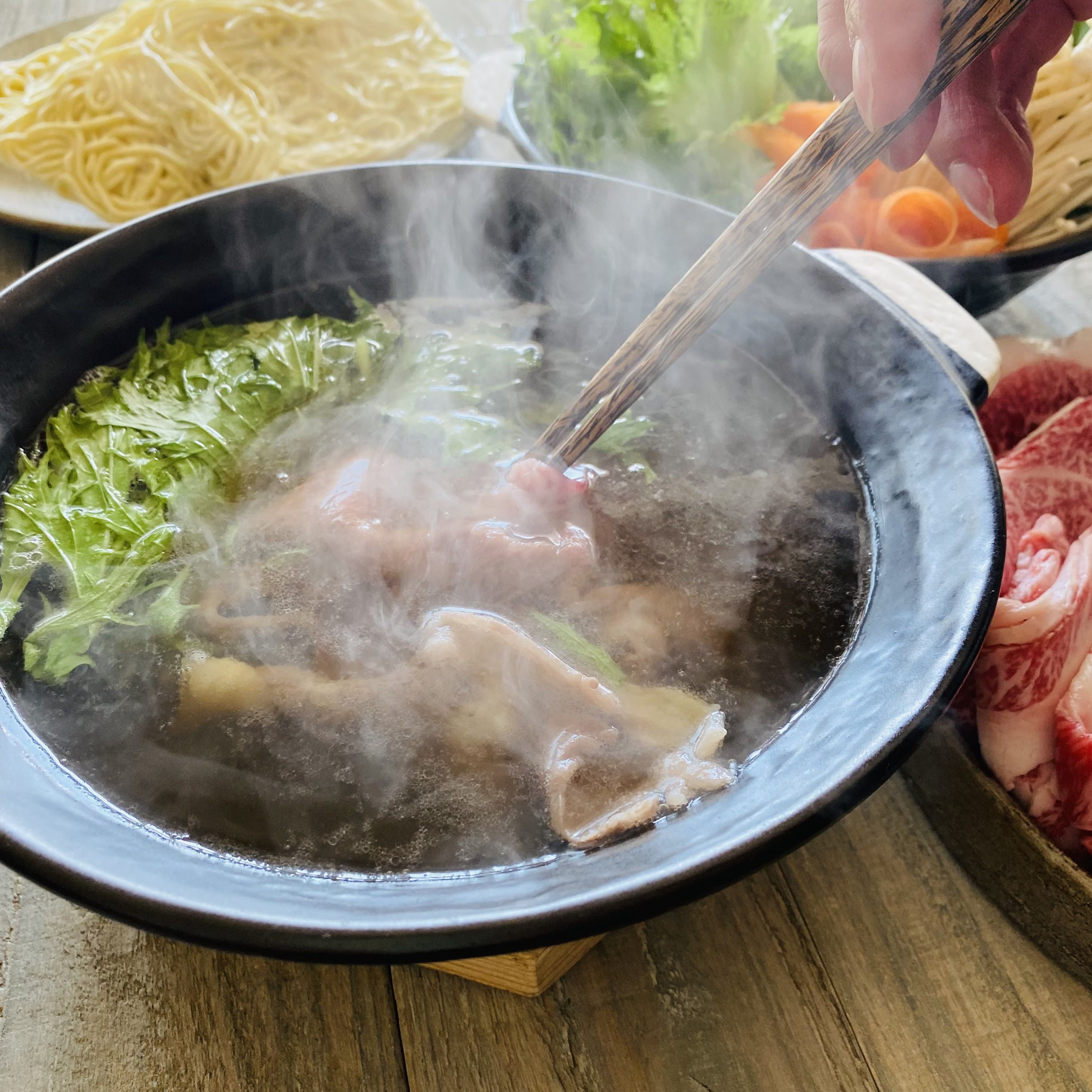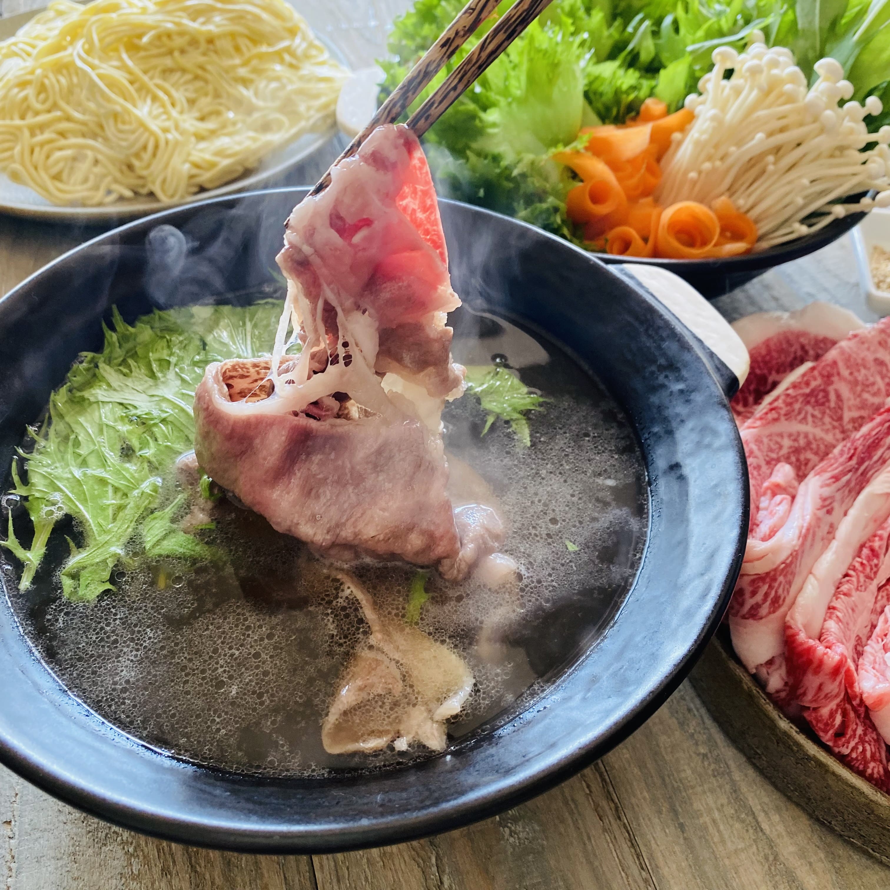 芳醇な旨味が特徴の佐賀県産伊万里牛。見て下さい‼️もう見せびらかしたい🤣私の顔よりデカイのではないか?大きな絶妙なさしが入ったお肉😍厚めに切ってあるのでボリューム満点、でもお口の中で旨みと共にトロけます。また、このお鍋の出汁、ポン酢だれ、ごまだれが絶品なんです。