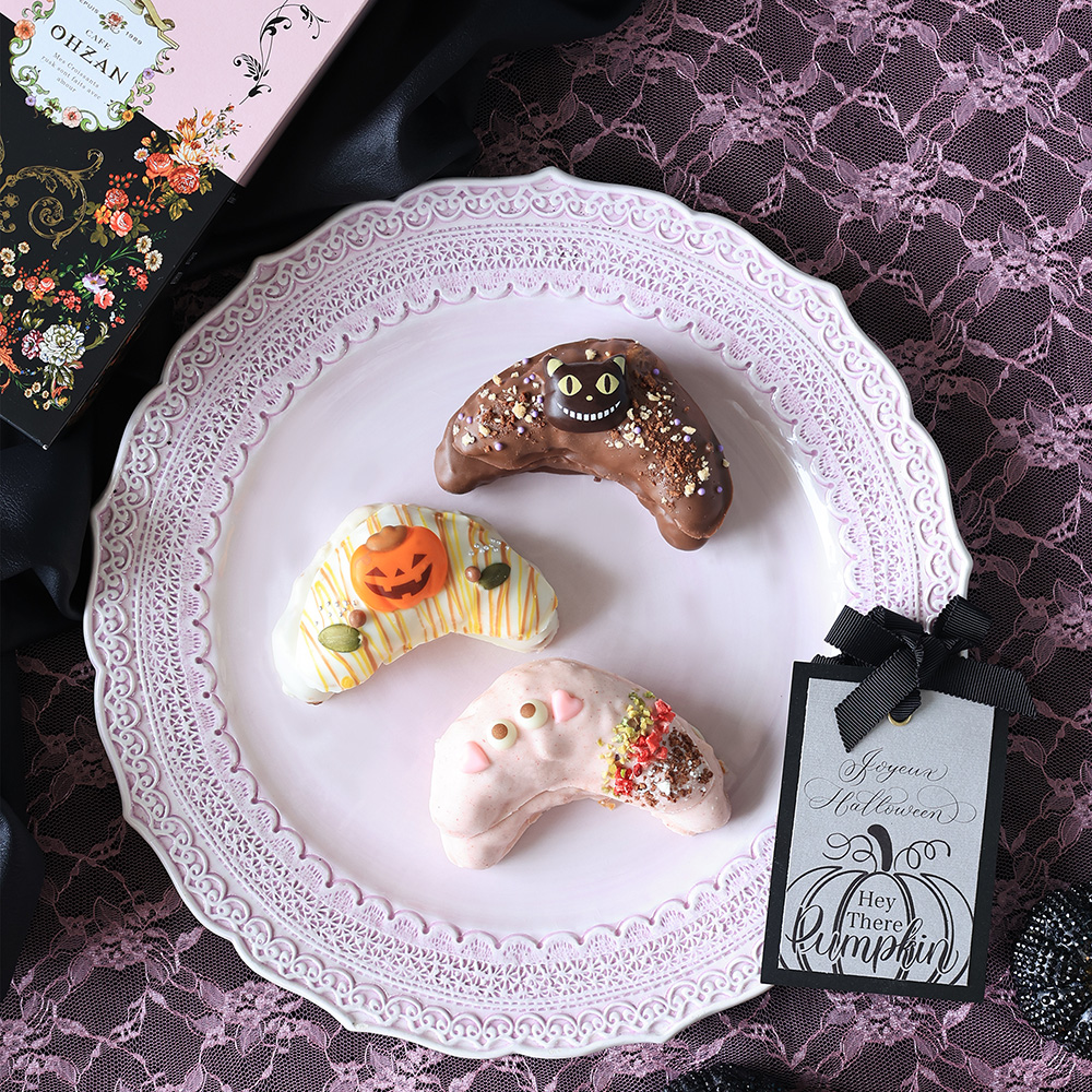 ハロウィン期間限定の「クロワッサンラスク」です。三日月形のクロワッサンをサクサクに焼き上げた、ボリューム感のあるラスクです。香り高くなめらかな口当たりが特長のベルギーのチョコレートを使用。かぼちゃモチーフの「Milk Chocolate」、ホワイトチョコをベースに黒猫が飛び跳ねる姿を描いた「White Chocolate」、目玉モチーフが可愛い「Strawberry Chocolate」の3種セットです。ハロウィンを食でも楽しめる商品です。