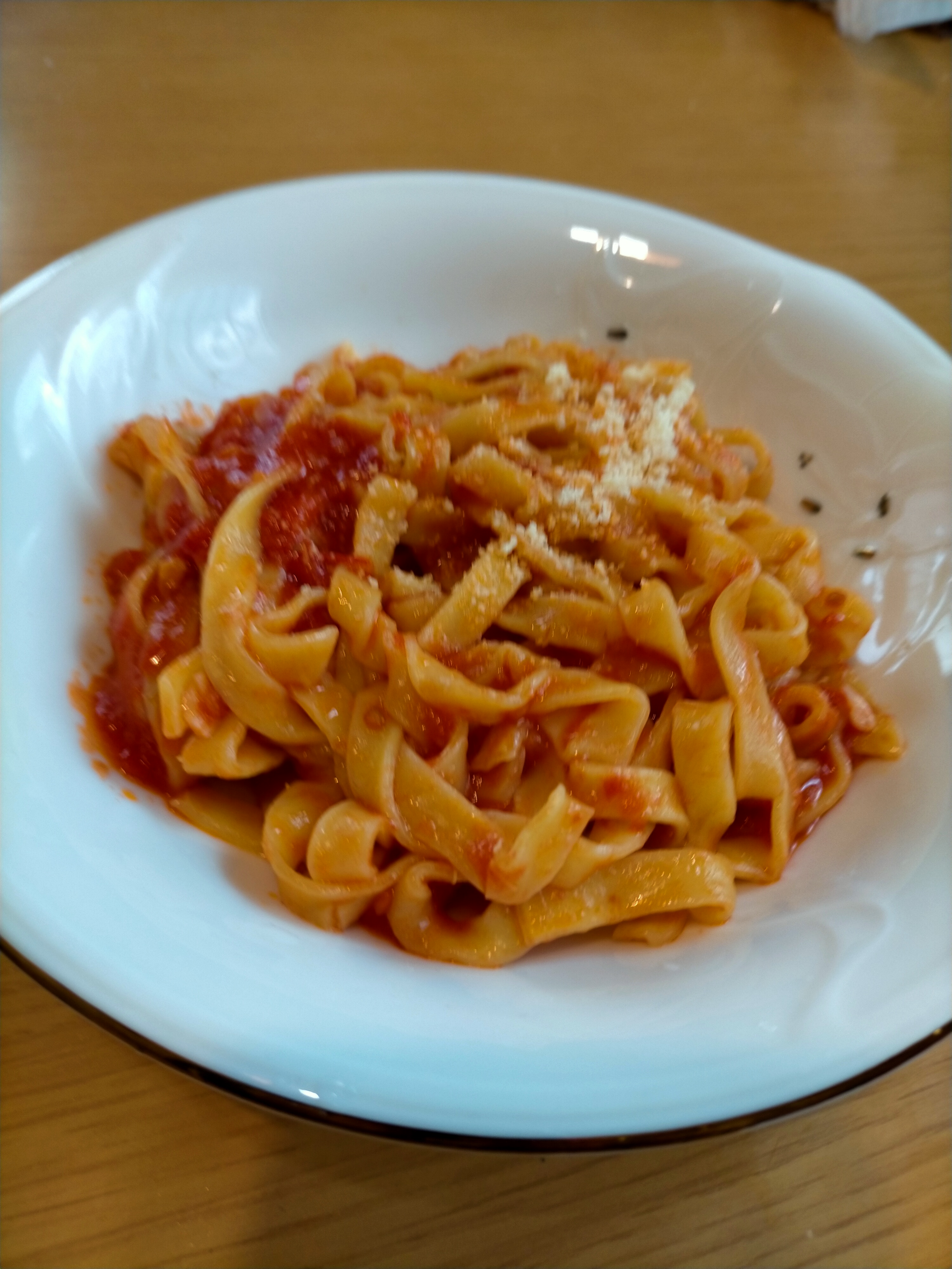 肝心の味わいは、想像していた以上にトマトソースのフレッシュ感と酸味が感じられ、トマトの味をダイレクトに味わえました。生パスタは特有のモチモチ食感が楽しめられ、平打ち麺であるのでトマトソースとよく絡み食べやすかったです。